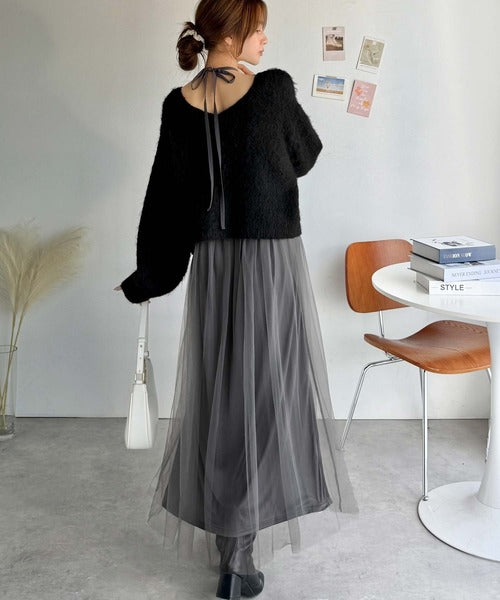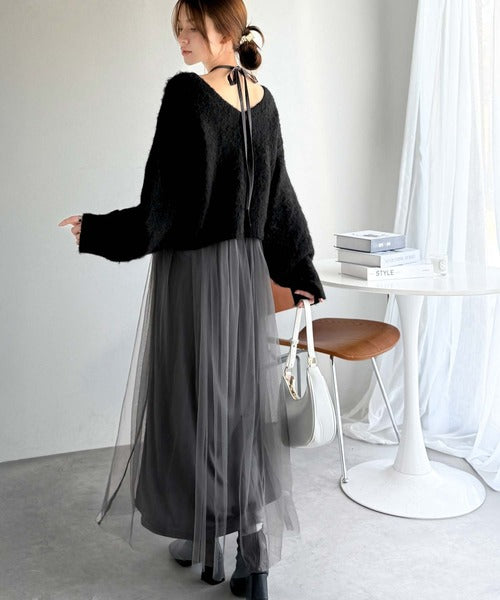 贅沢なニットトップス×チュールコンビワンピースセット。