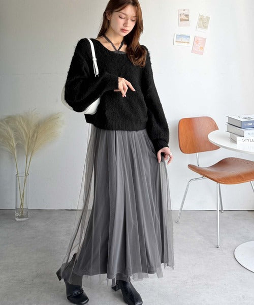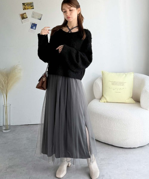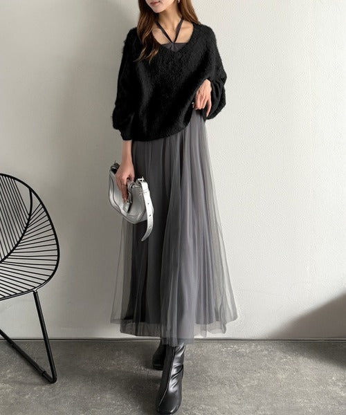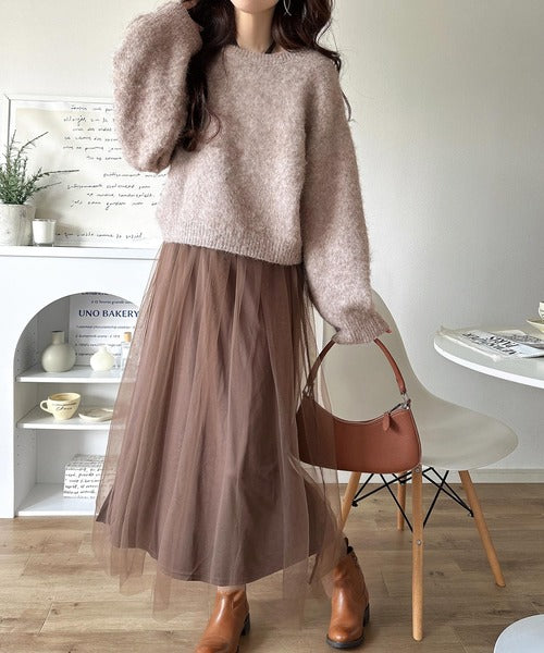 ニットは軽くて暖かみがあり、チュールは繊細で落ち感あり◎