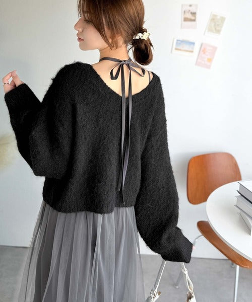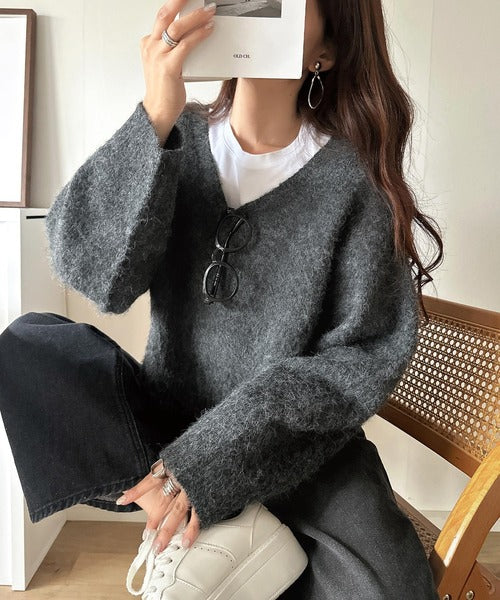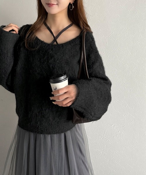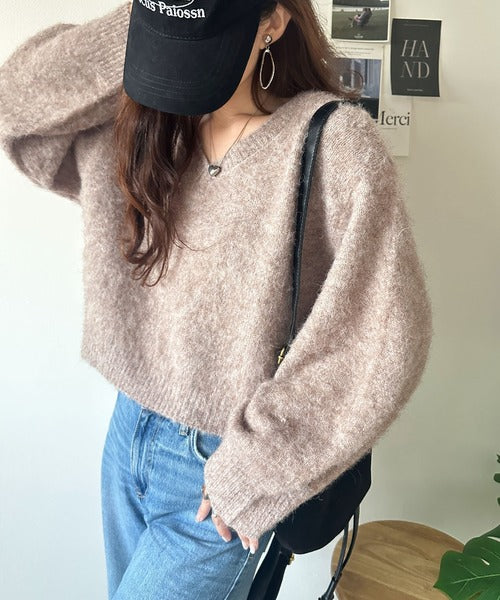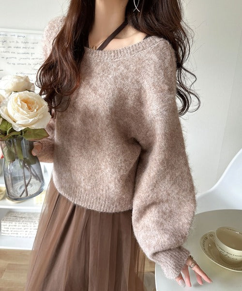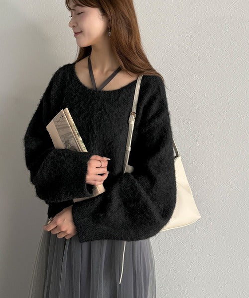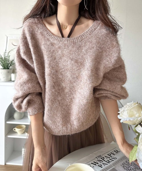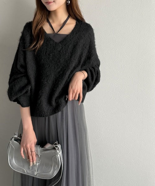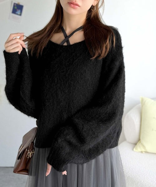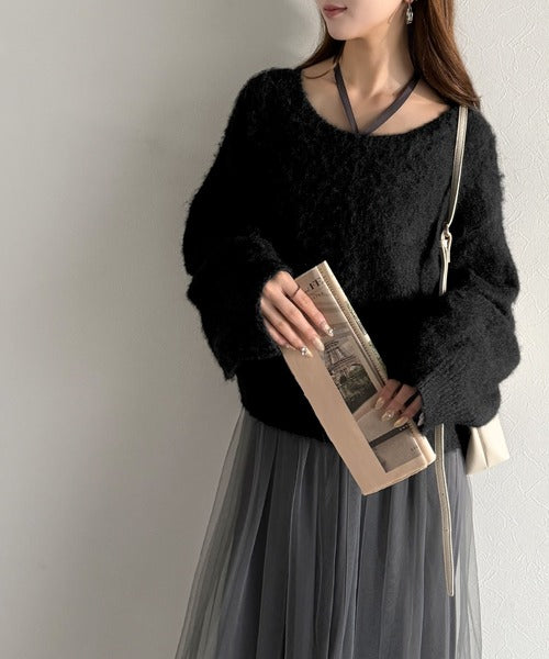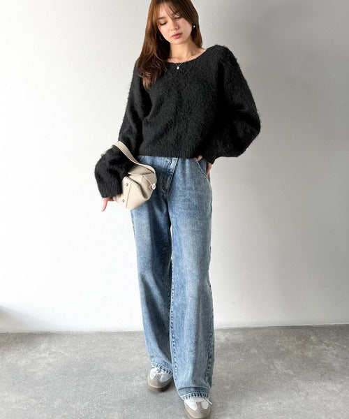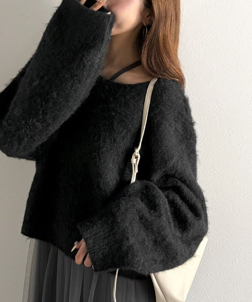 ・トップスは、ぽわん袖デザインの毛足のあるニット素材のプルオーバー