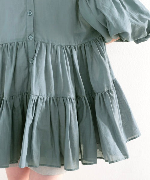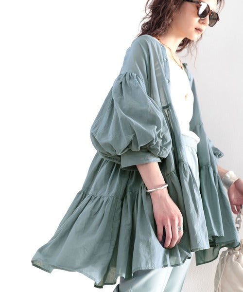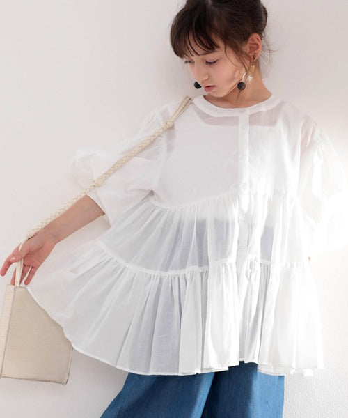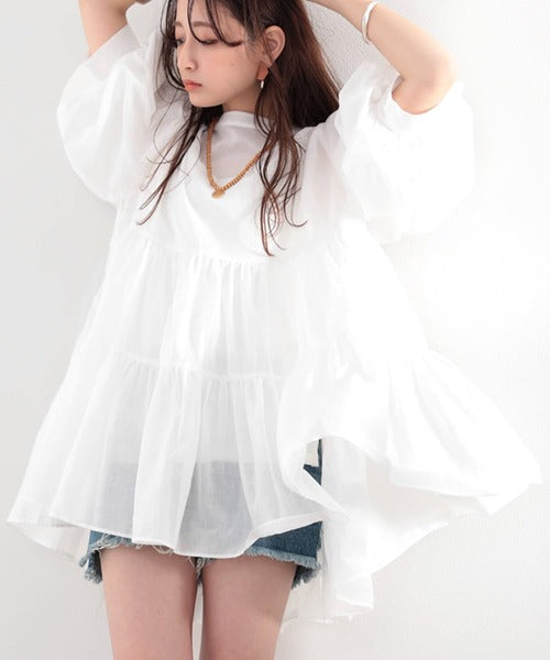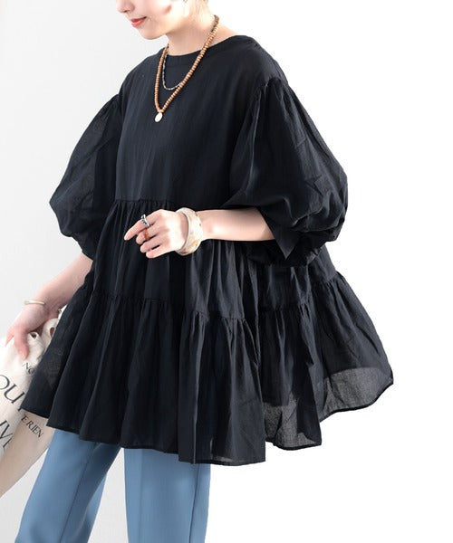 ふわっと広がるデザインがかわいらしいティアードブラウス。
