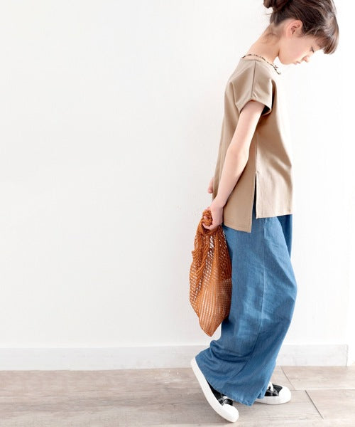 首元がスッキリ見えるボートネックで涼しげに。