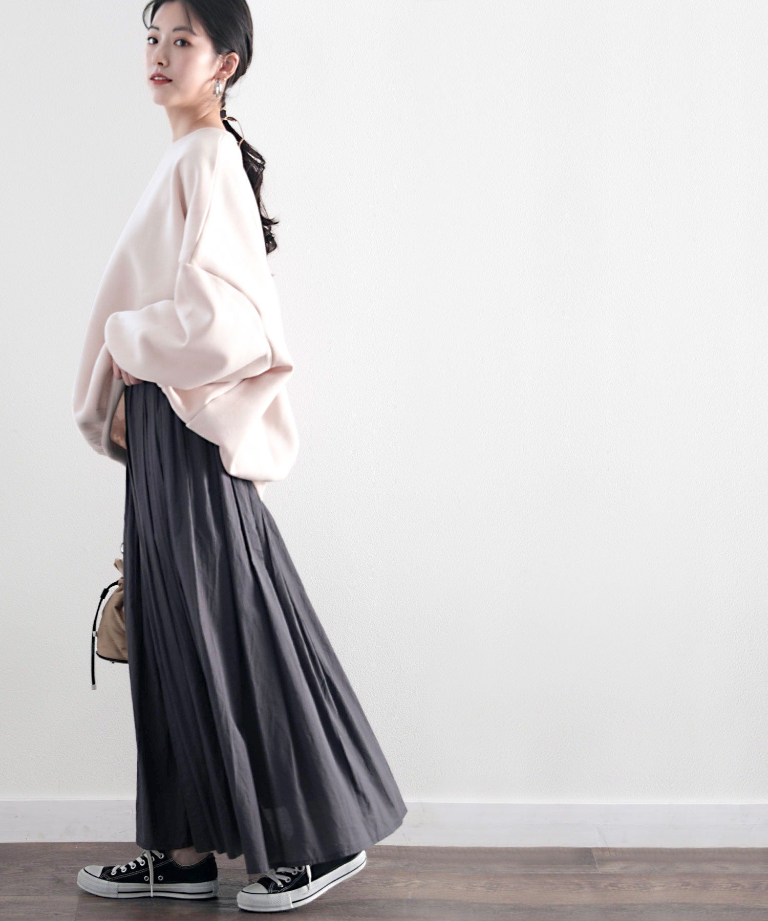 裾が広がったつくりなので歩くたびひらひらとした揺れ感が上品な女性らしさを演出。