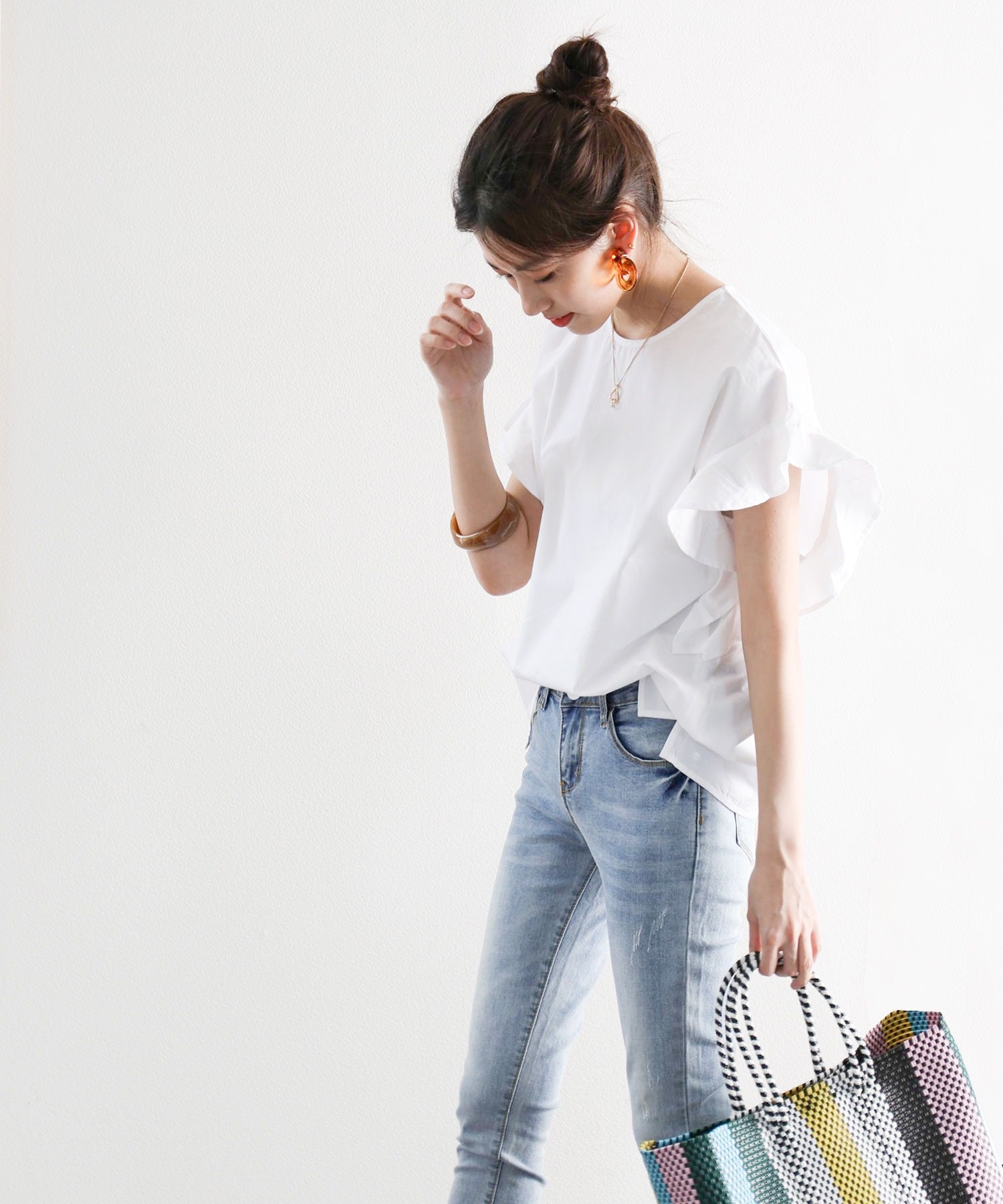 リネン素材のワイドパンツやデニム合わせでガーリーだけどカジュアルさも。