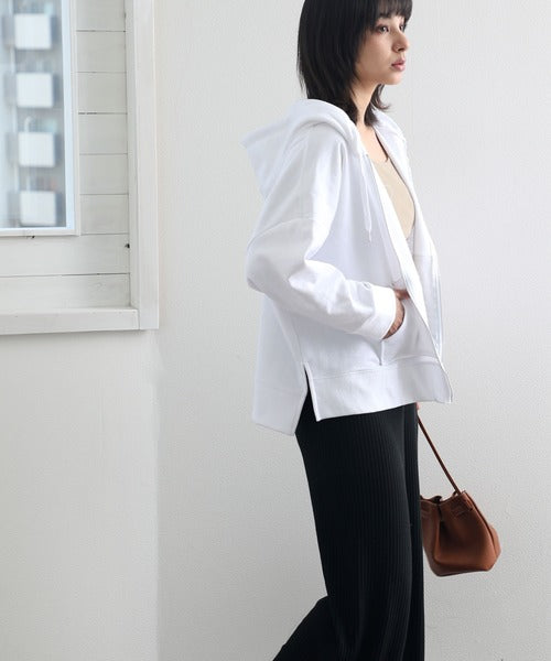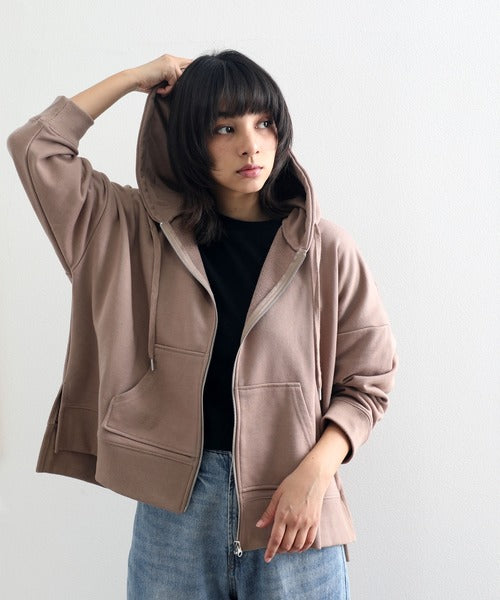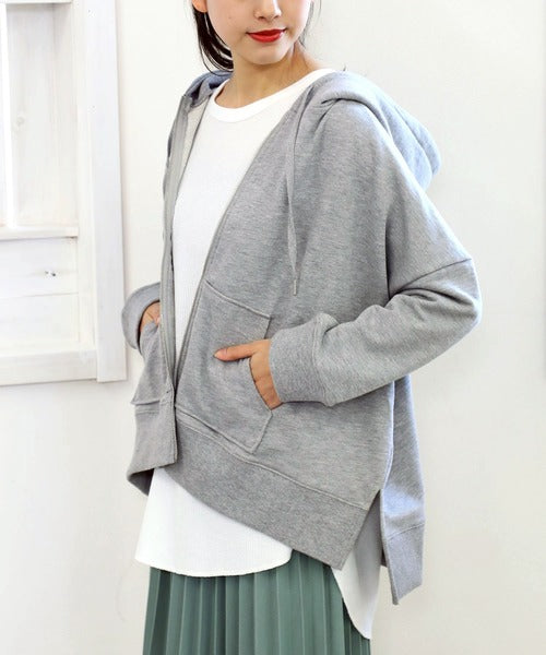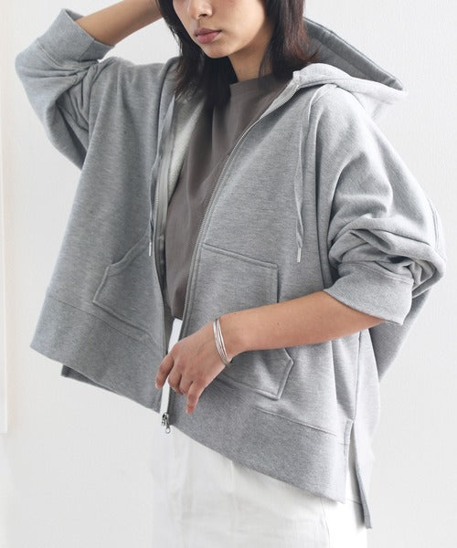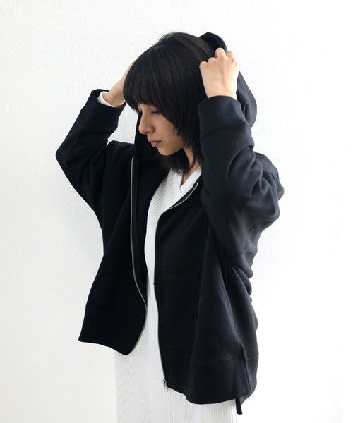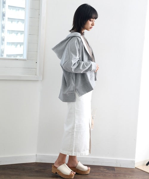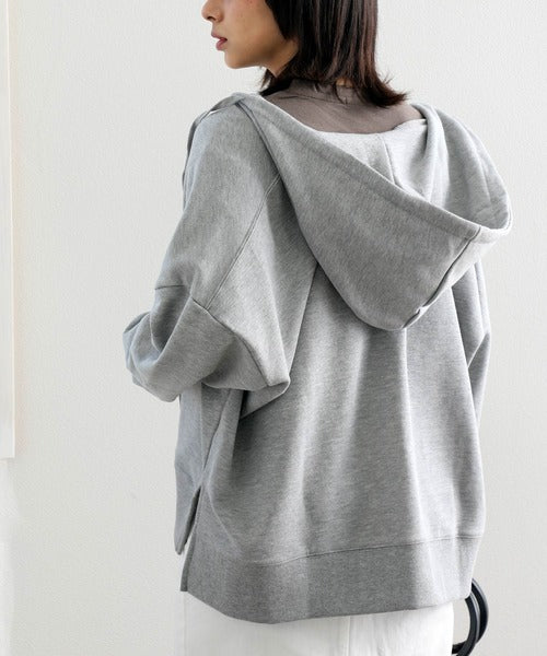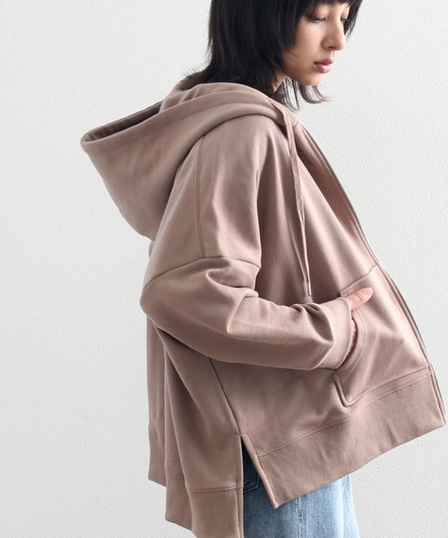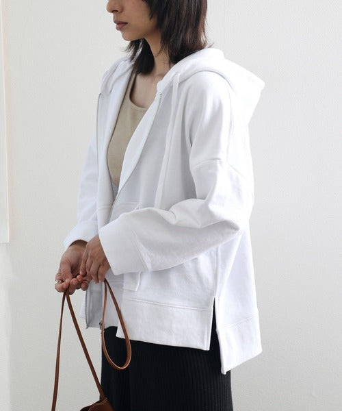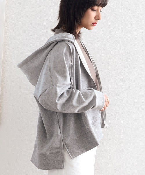 サイドスリットと前後差の丈がポイントのジップアップパーカー。