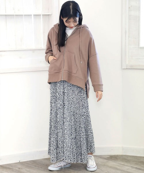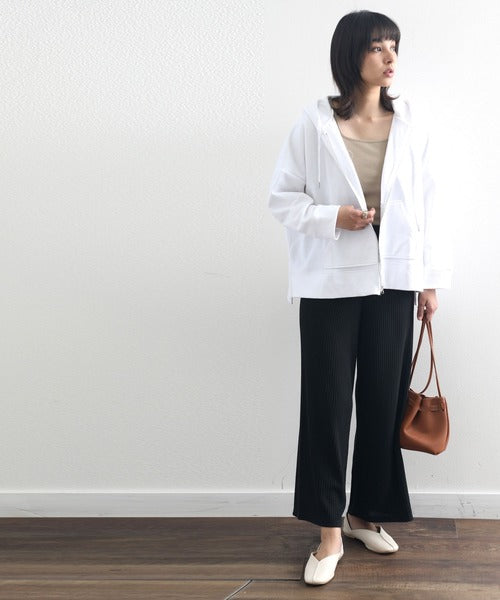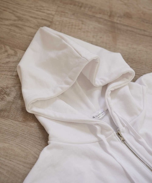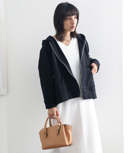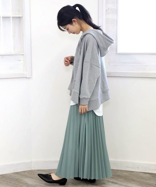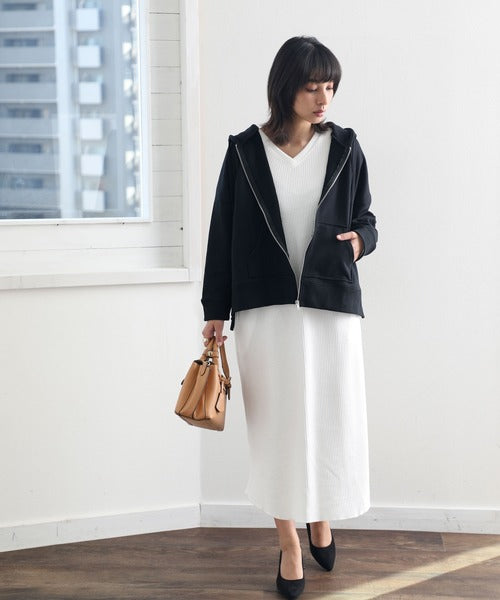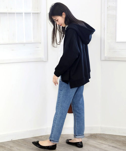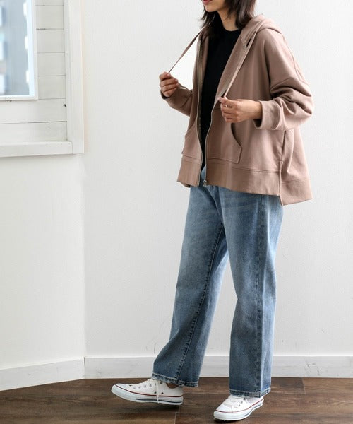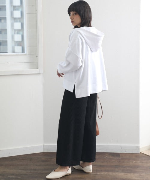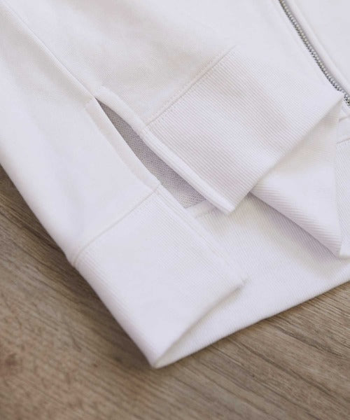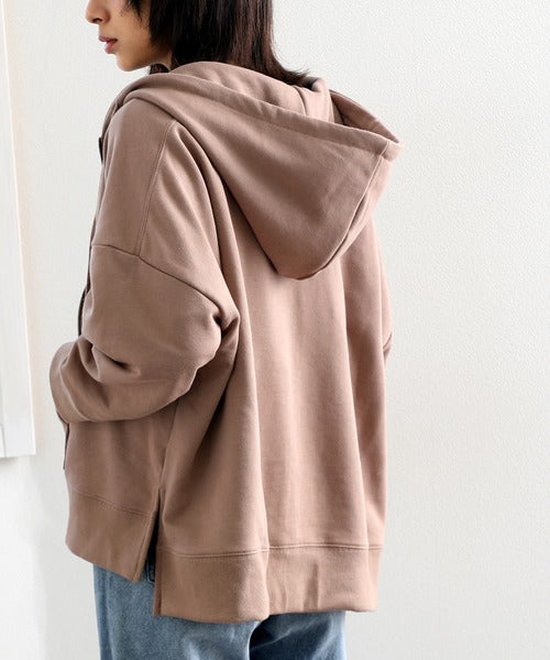 サイドスリットと前後差の丈がポイントのジップアップパーカー。