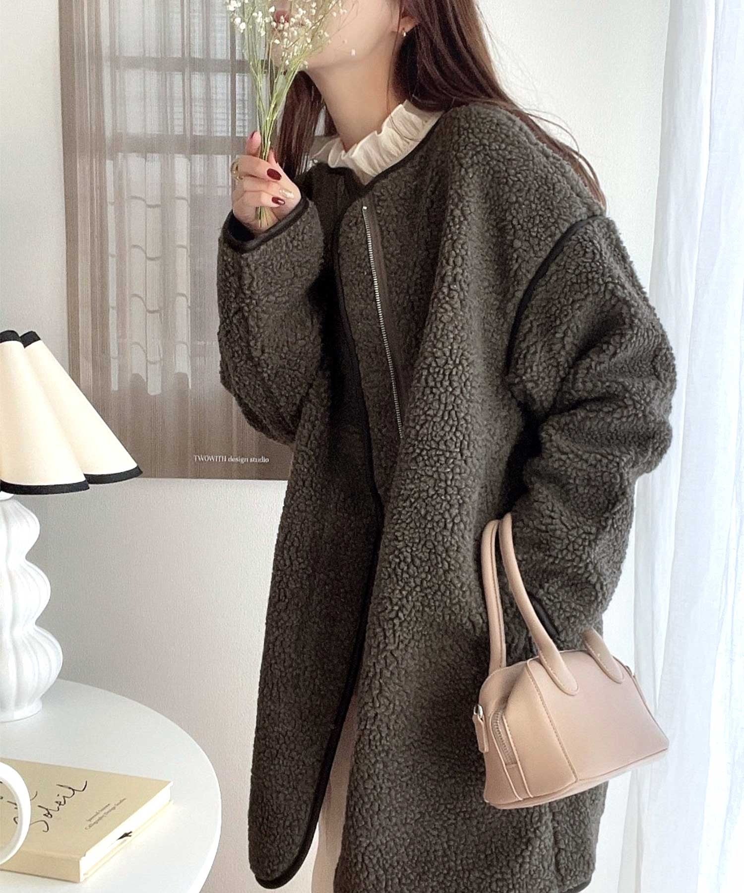レザー調 無地ジップアップノーカラーパイピングミドルコート clf015