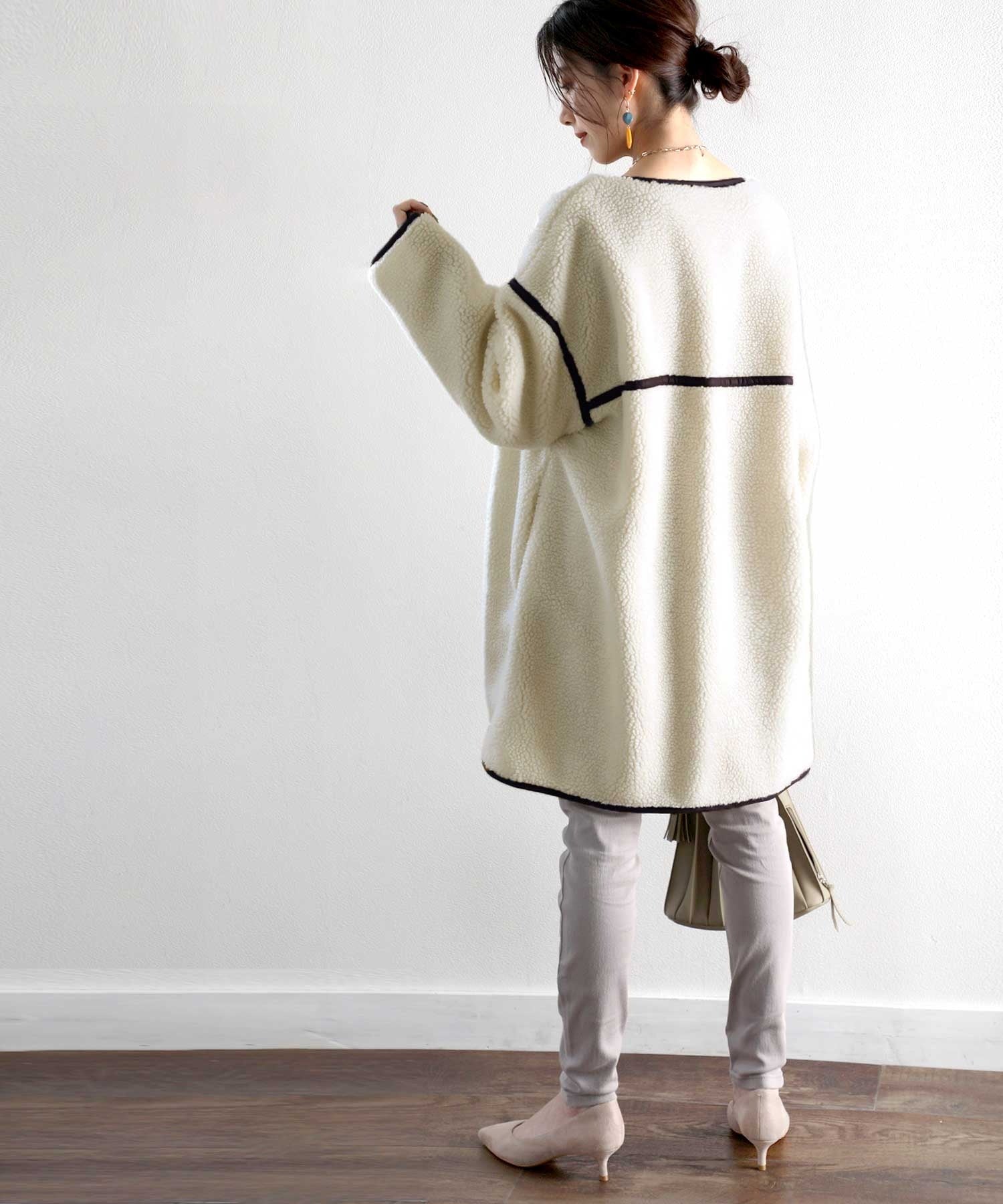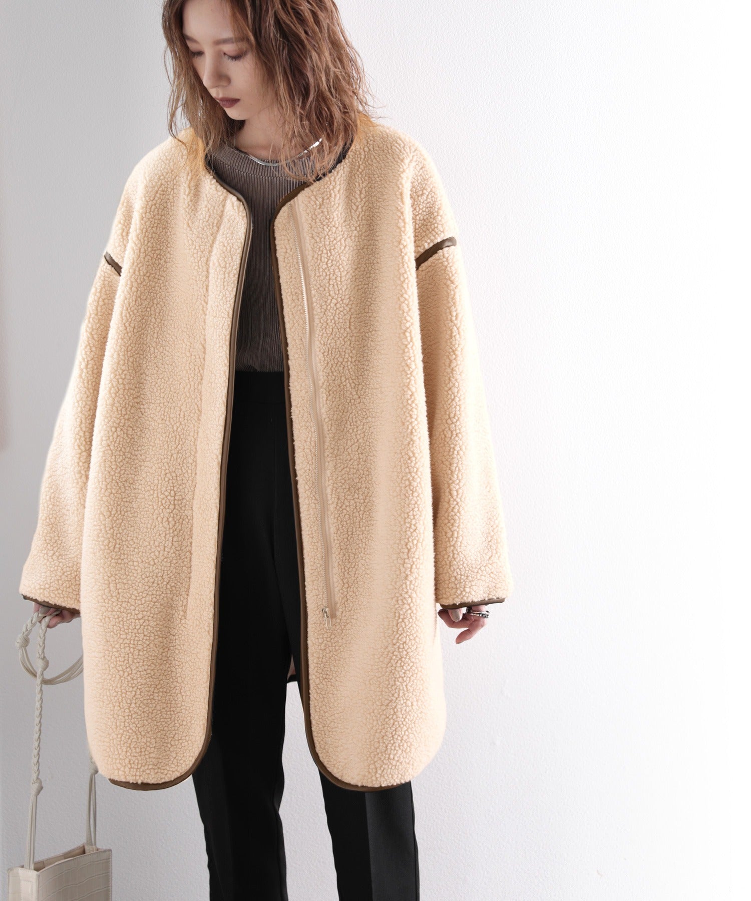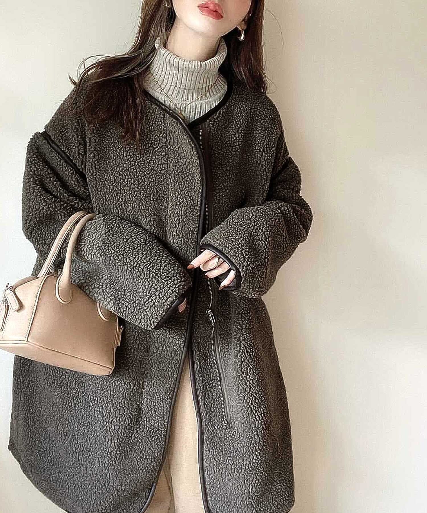 レザー調パイピングのアクセントが効いて、1枚羽織ればキマるコートです。