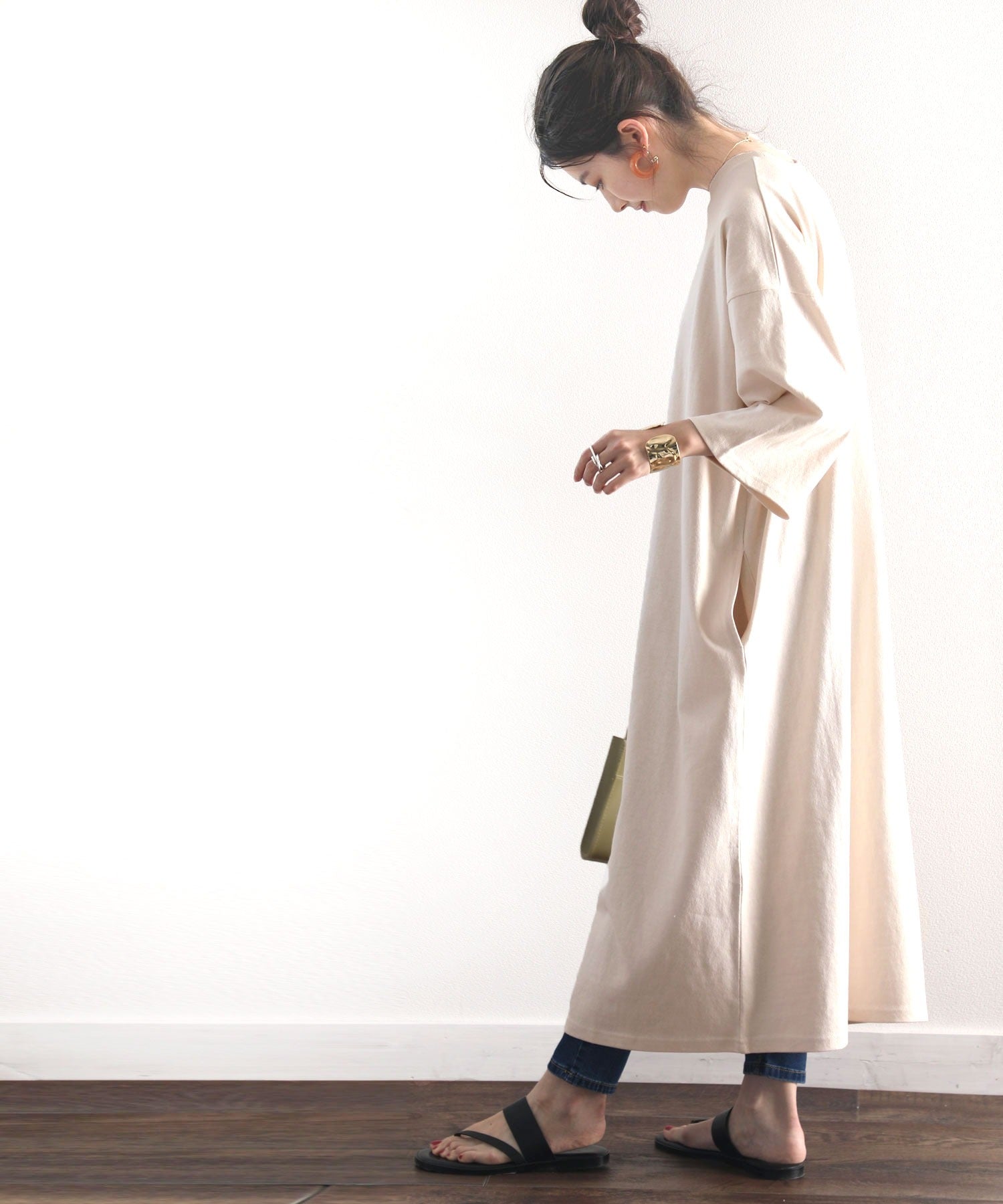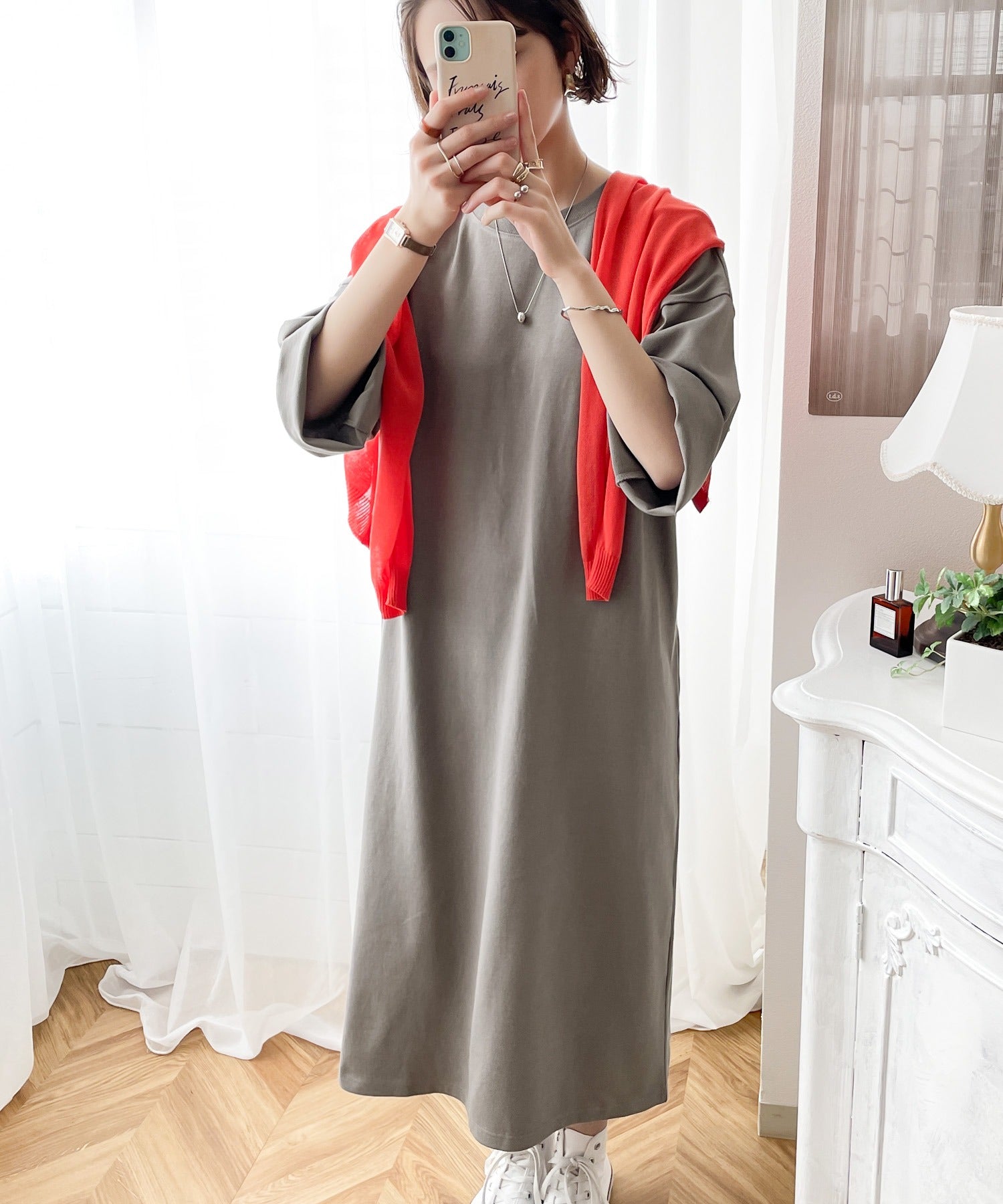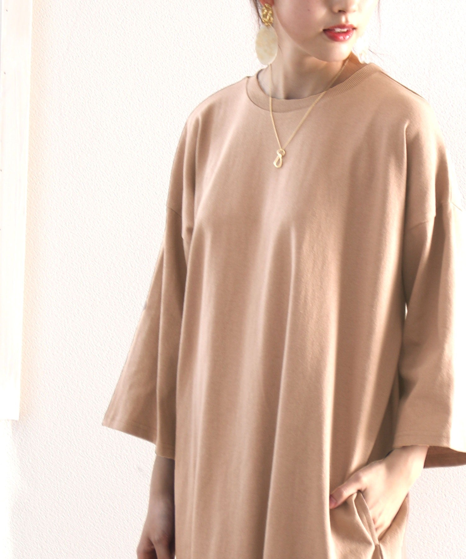 体のラインを拾わないのでビッグシルエットトップス感覚で着用できます。