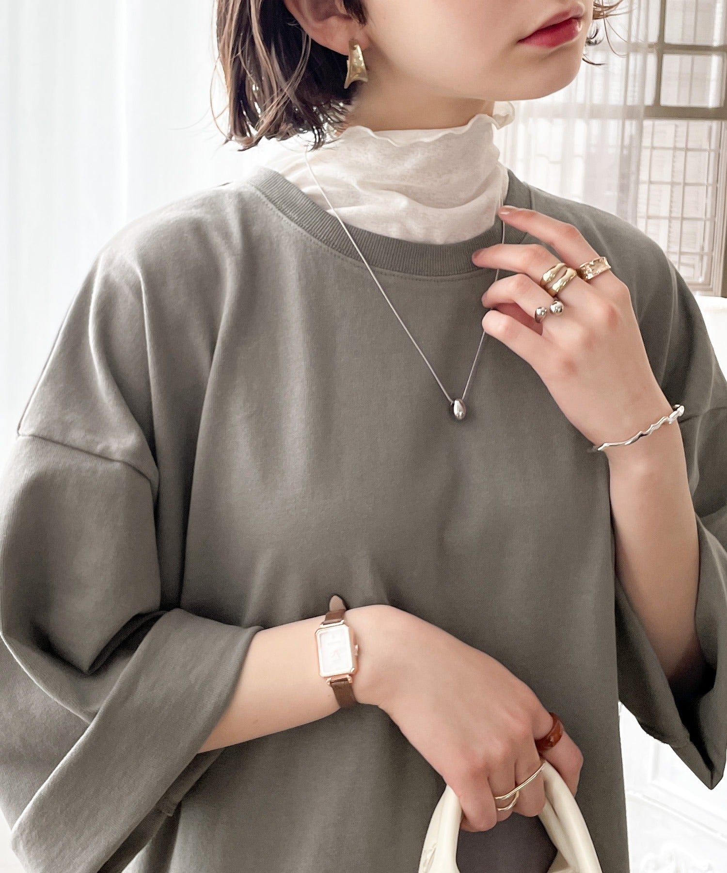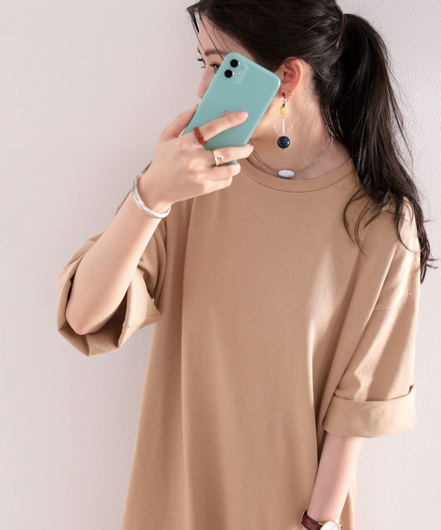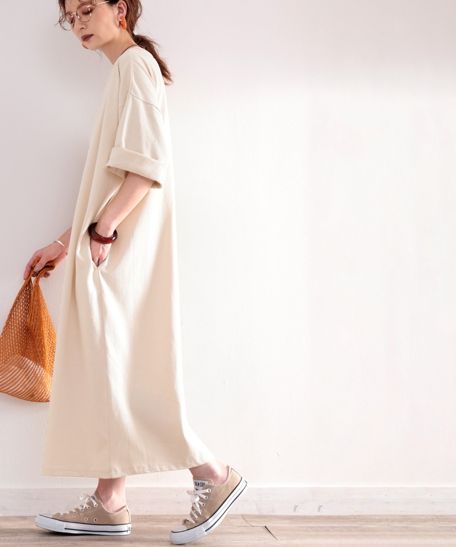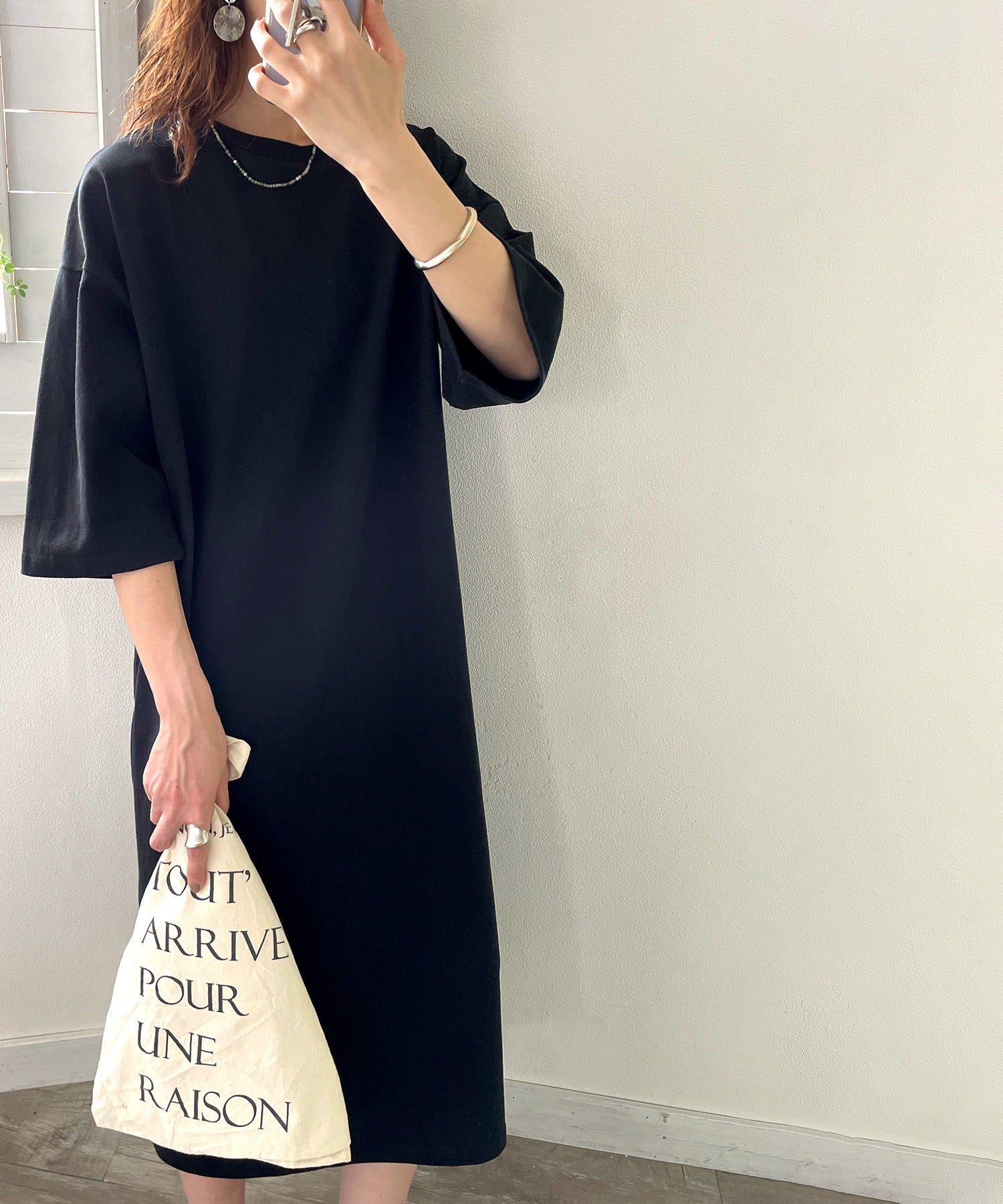 体のラインを拾わないのでビッグシルエットトップス感覚で着用できます。
