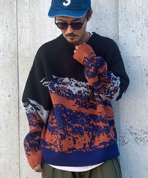 古着のようなヴィンテージ感を醸し出す柄が特徴的なジャガードニット。