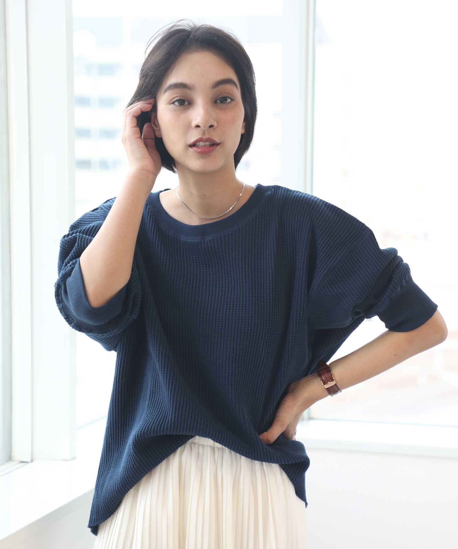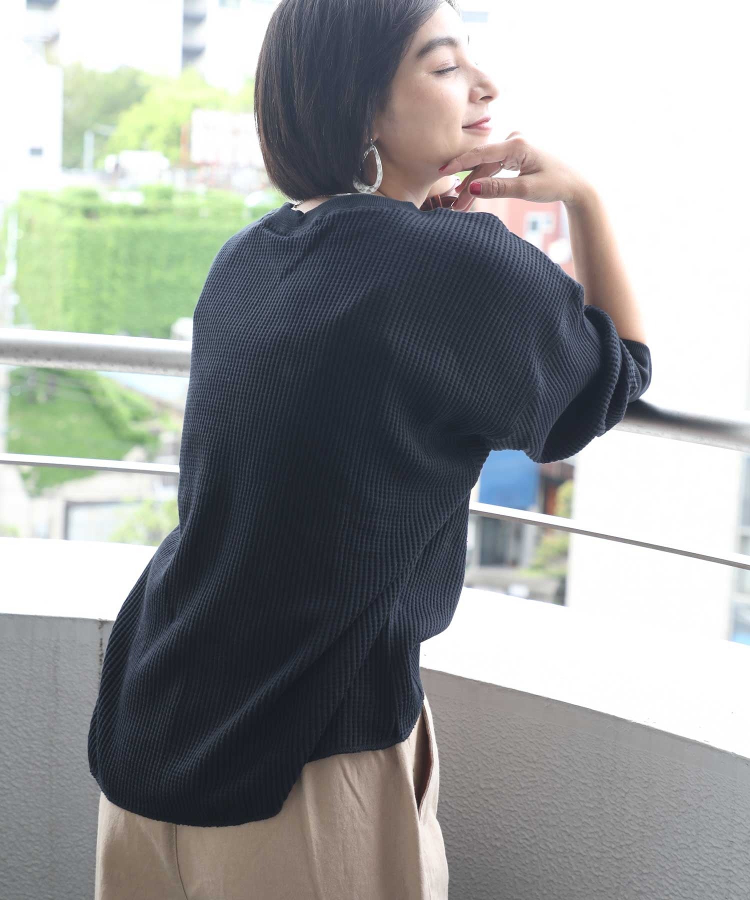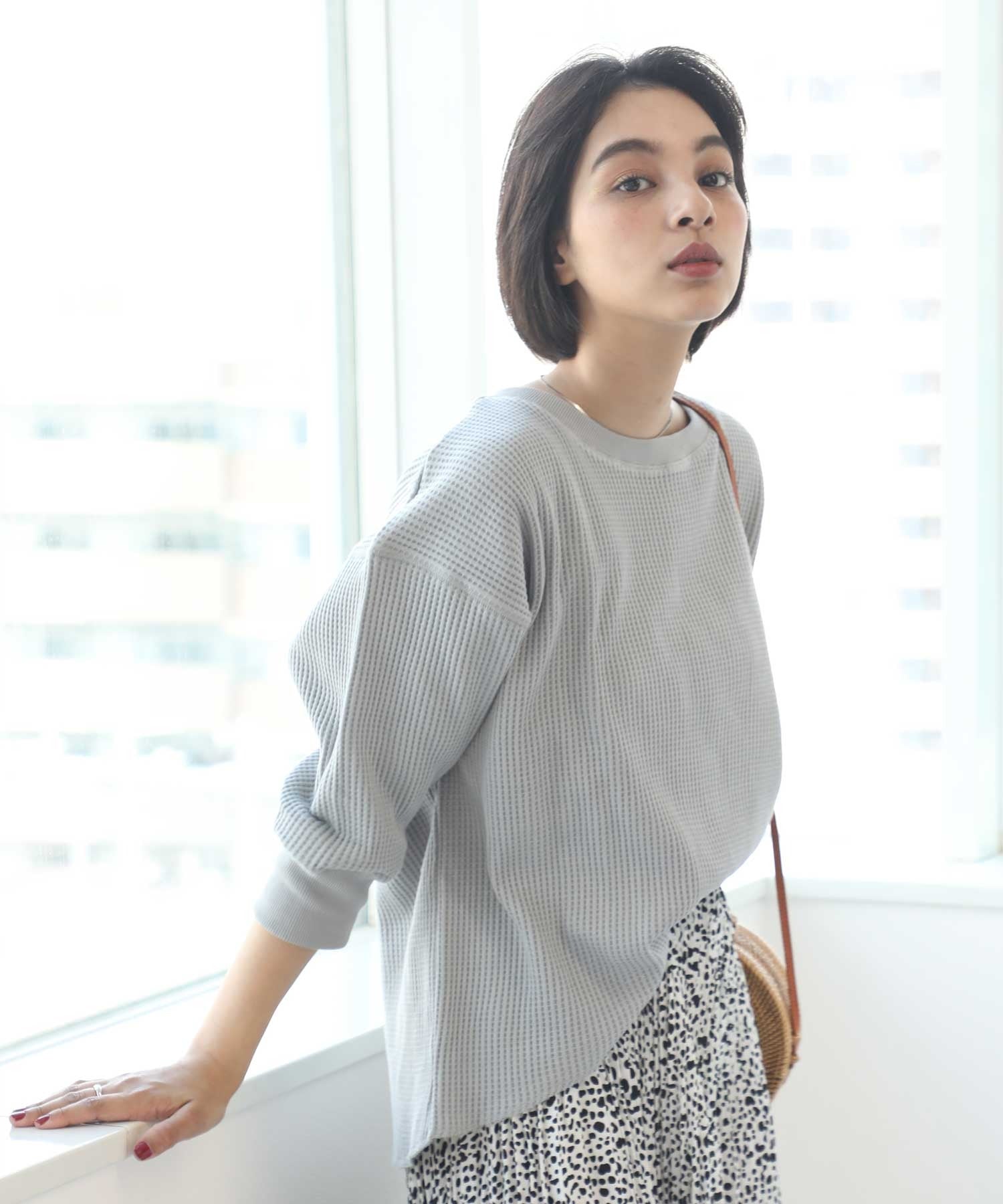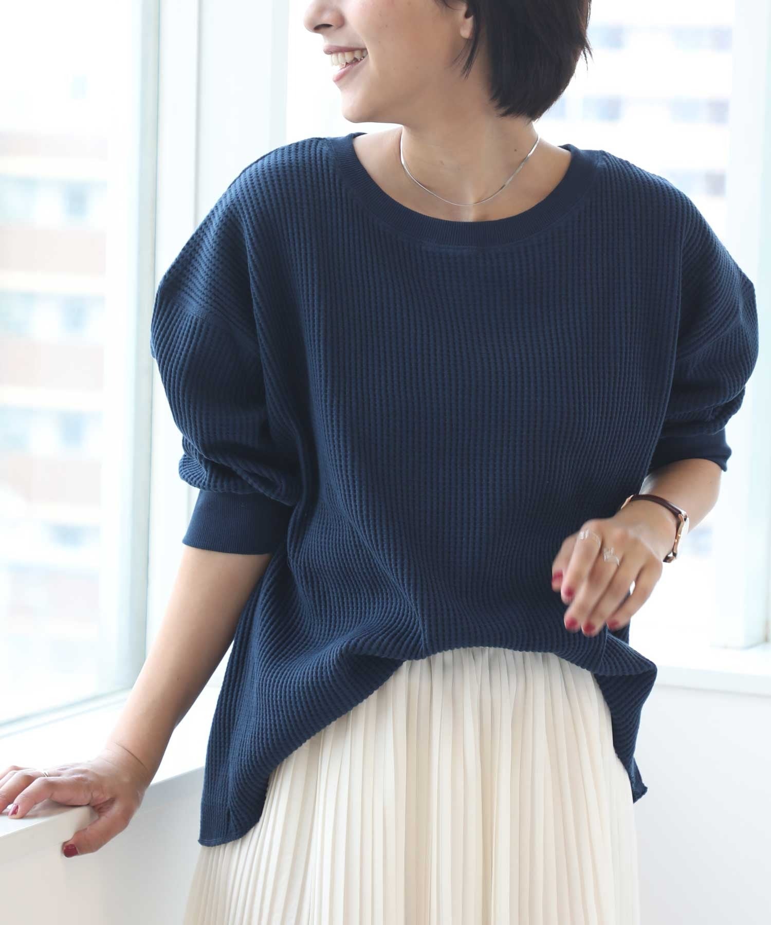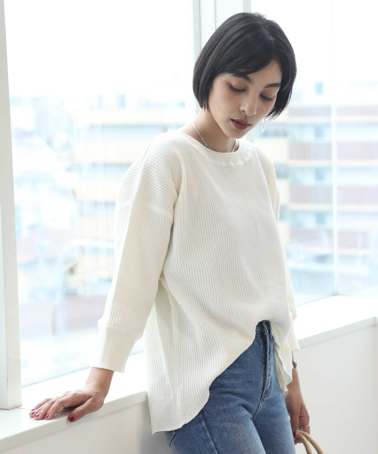 ワッフルラウンドサーマル七分袖トップス ctl002