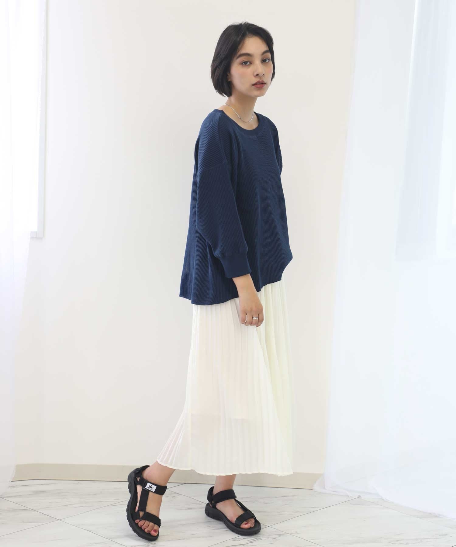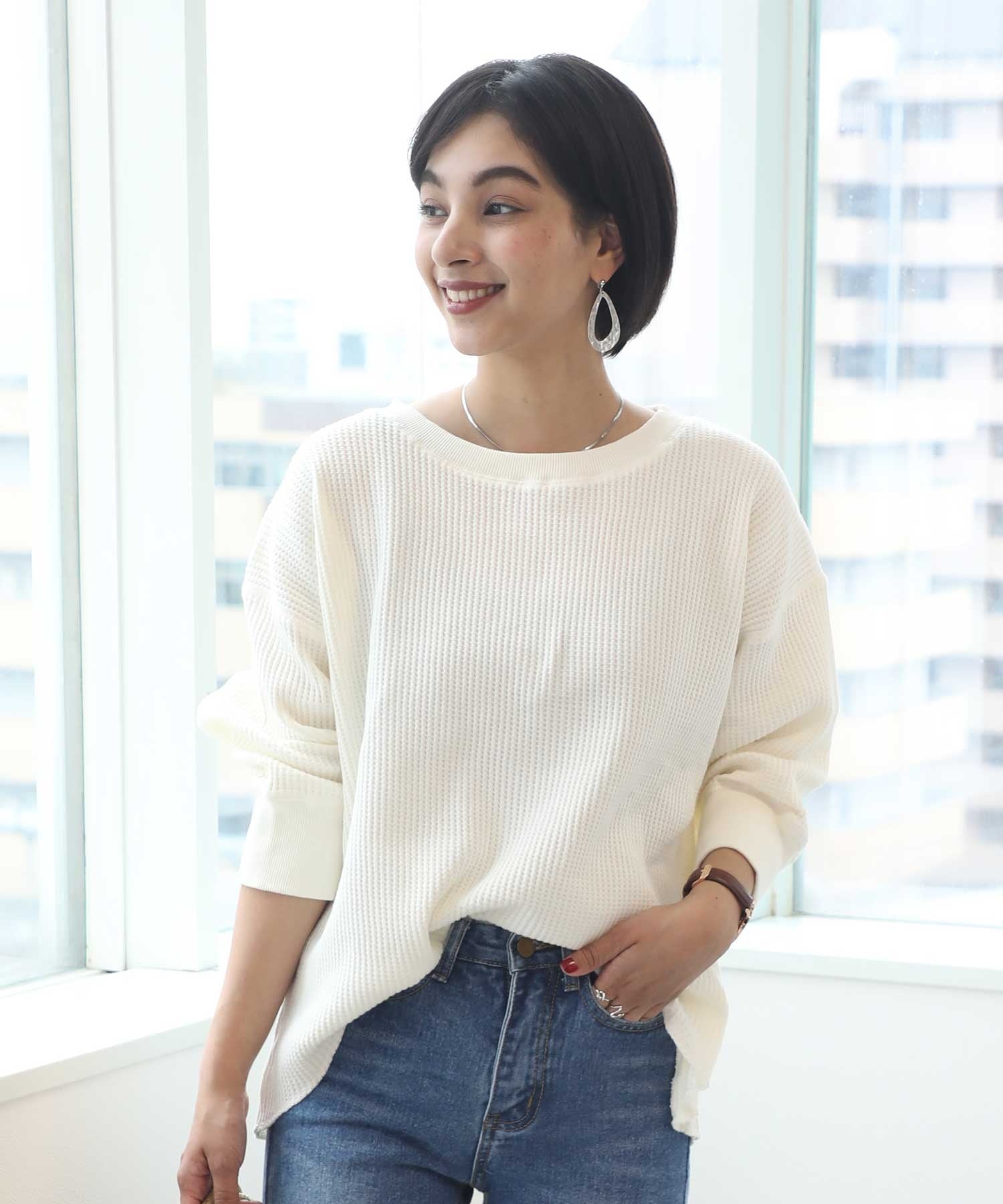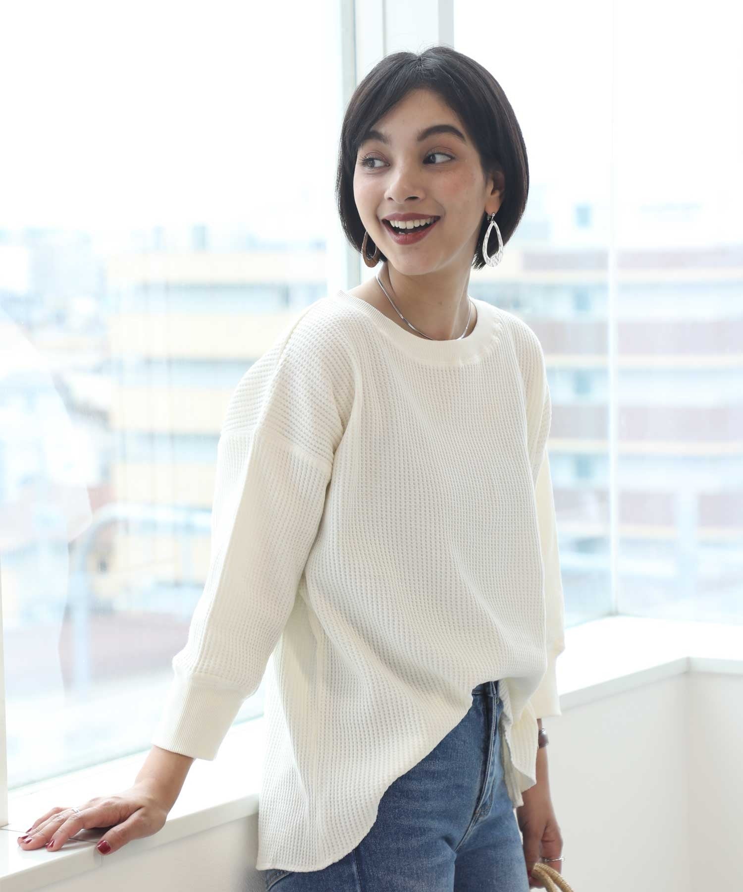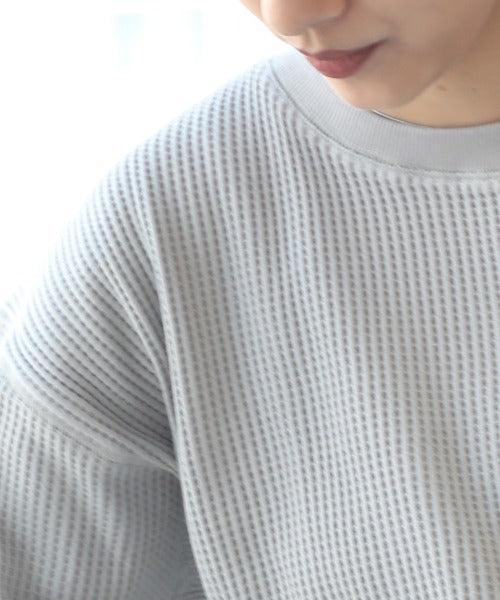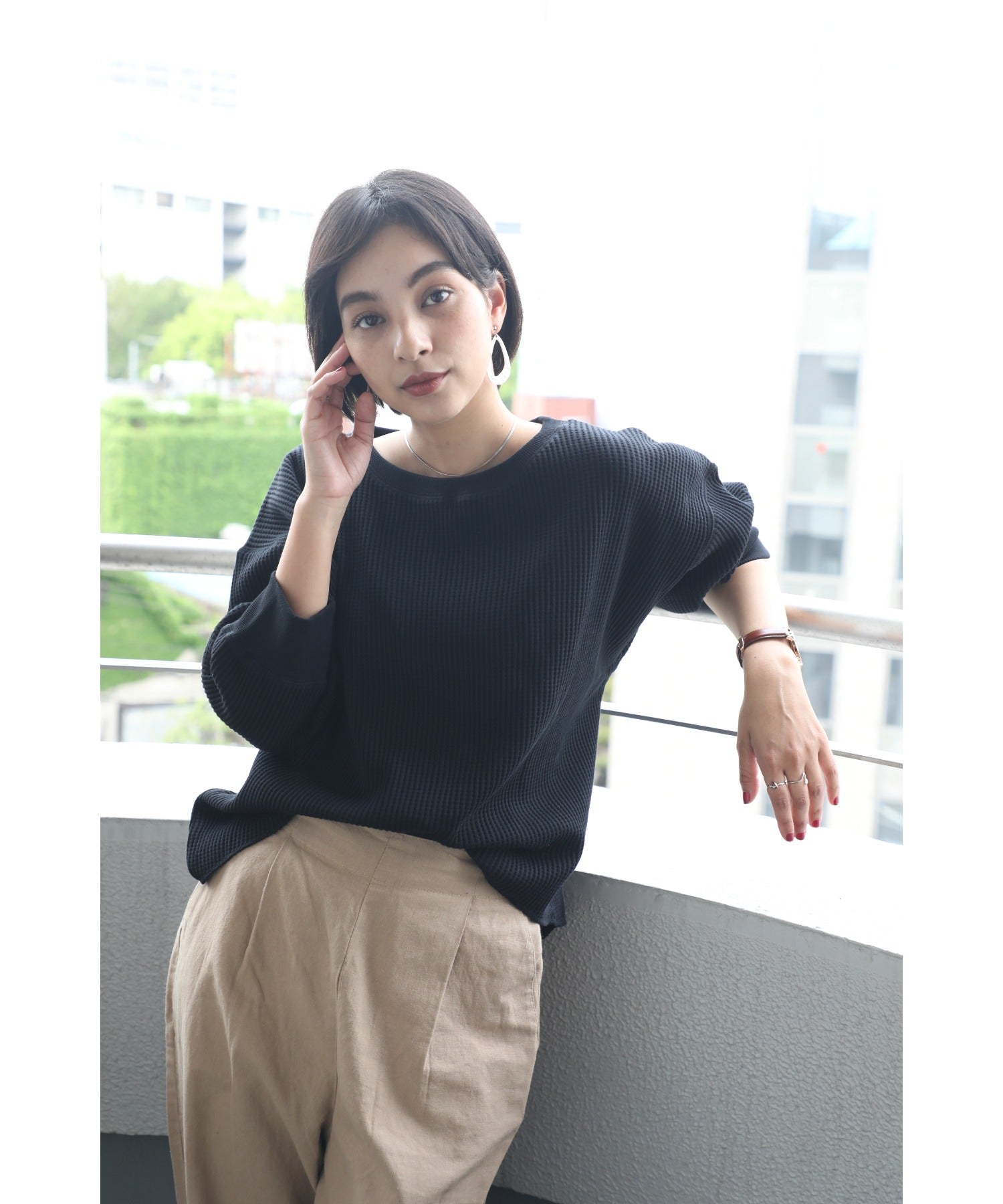 ワッフルラウンドサーマル七分袖トップス ctl002