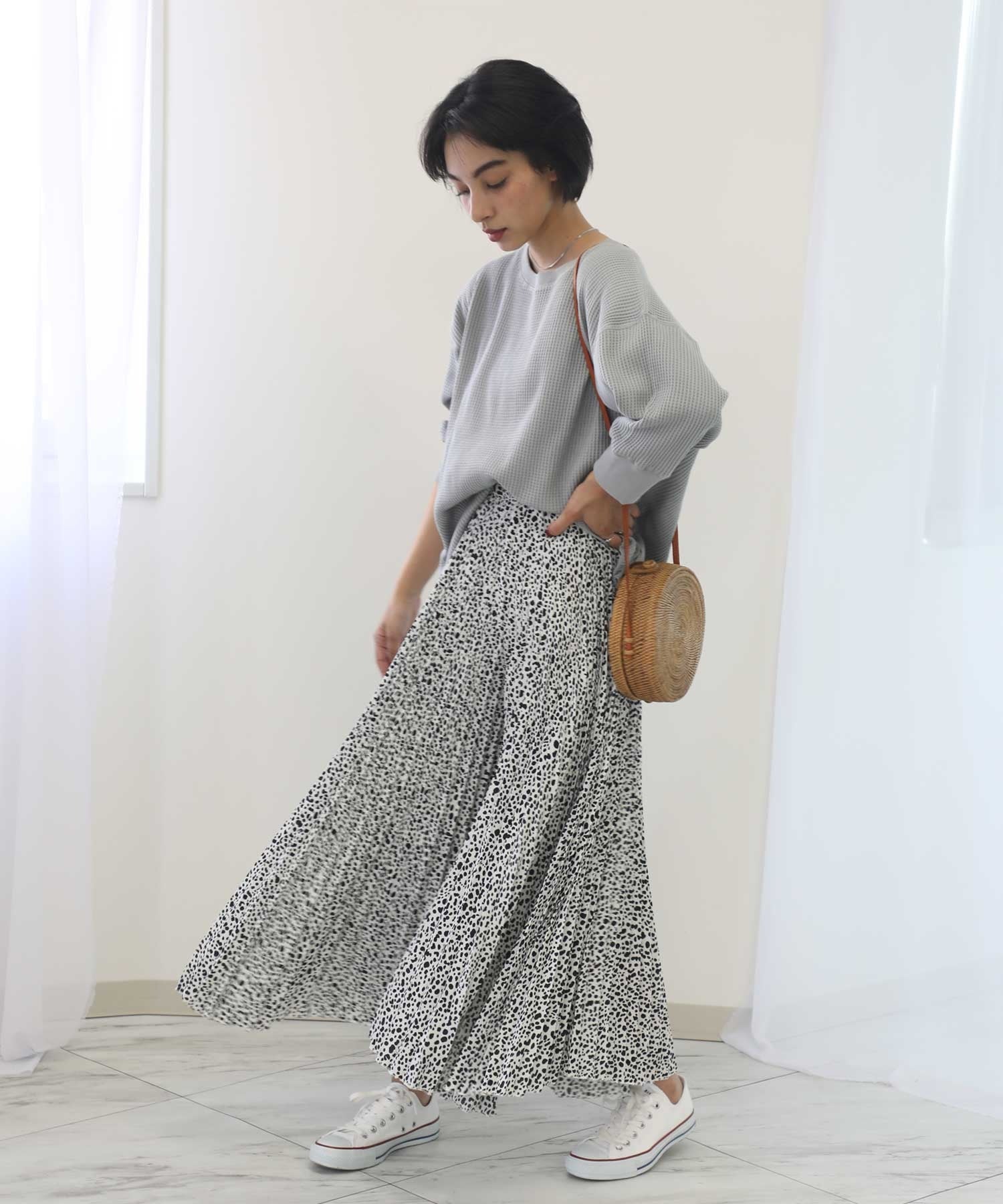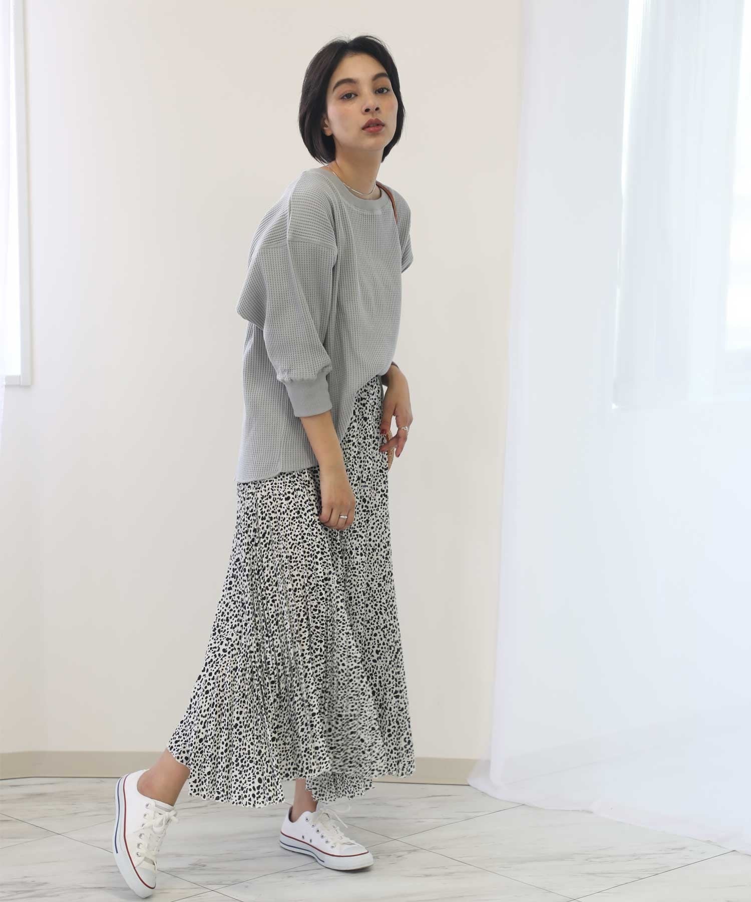 無地のトップスはチェック柄ボトムスやレオパードの小物などとの相性も抜群。