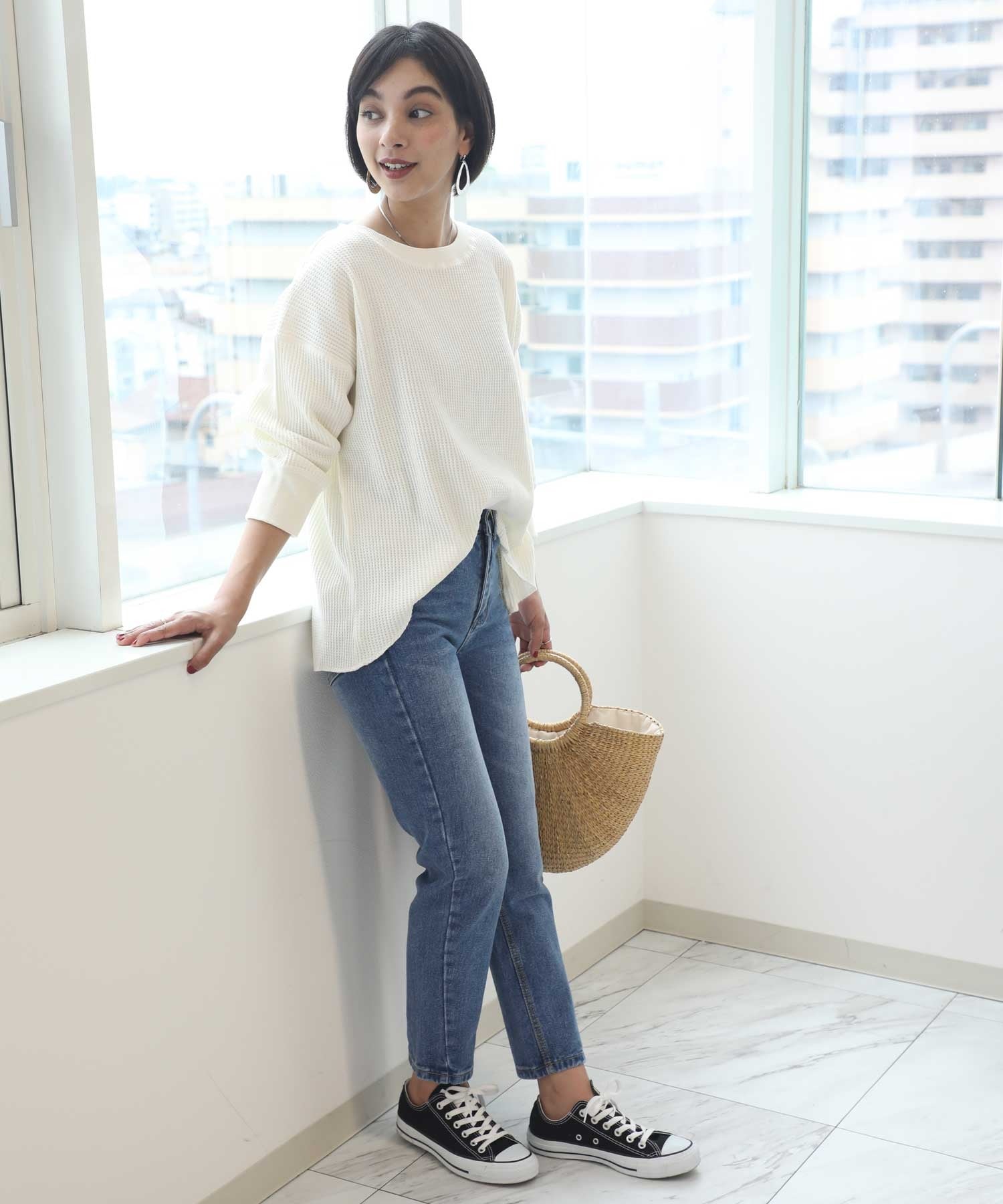 ボトムスには、デニムパンツはもちろん、ニットパンツやレースイージーパンツ