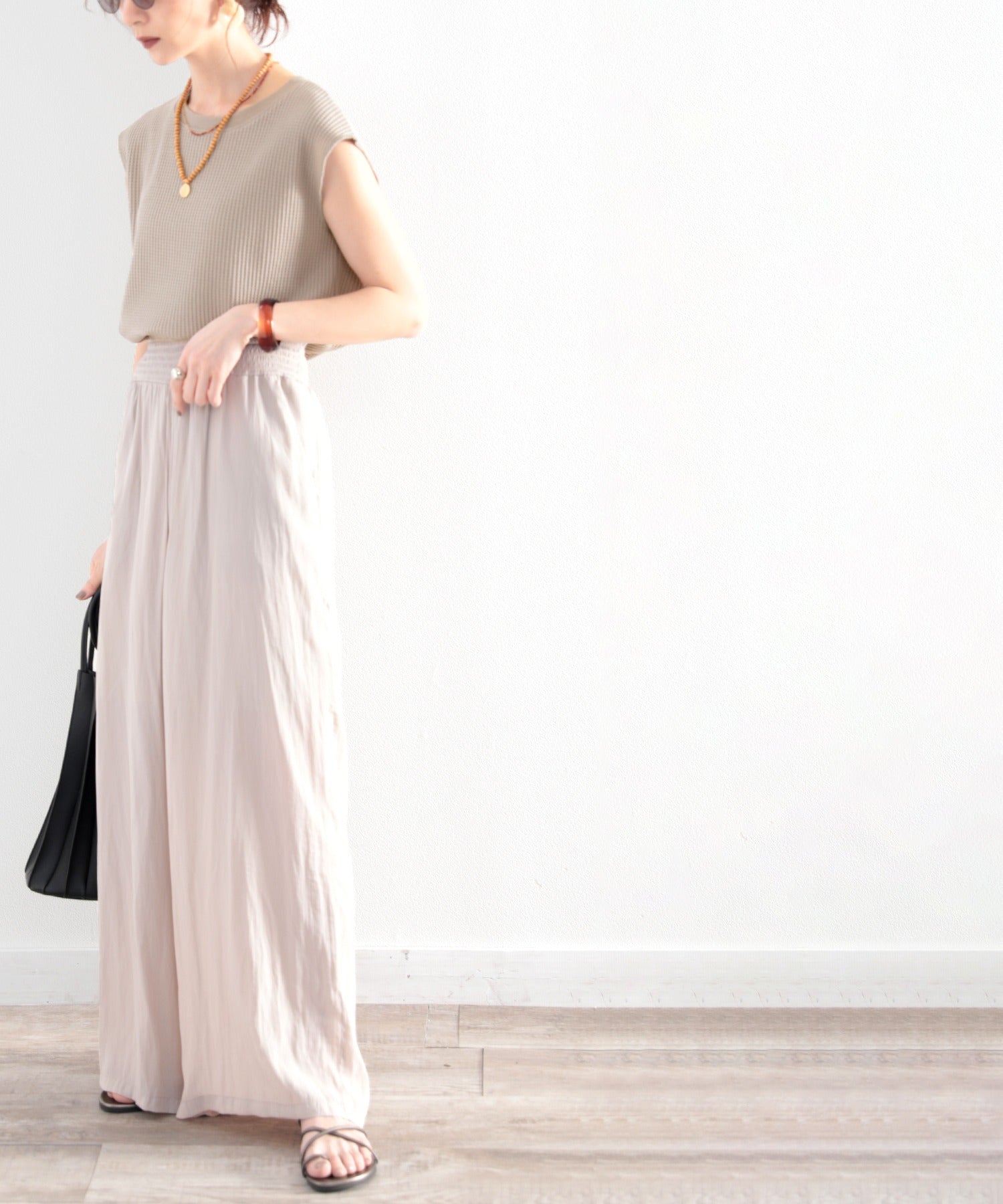 ロングプリーツやふんわりとしたロングスカートにあわせてフェミニン寄りになど