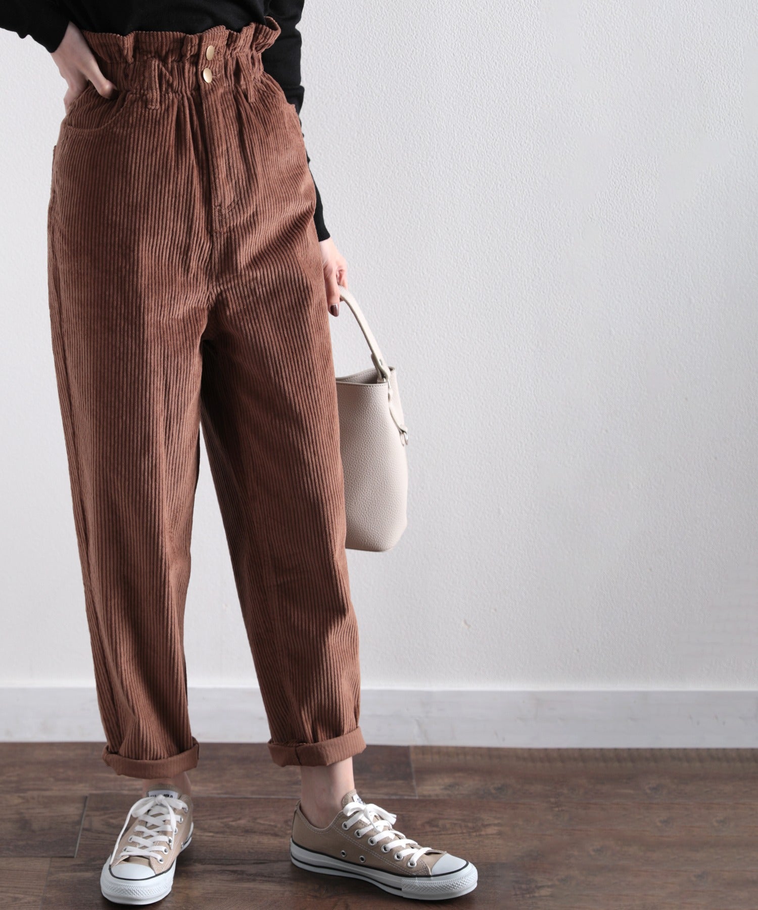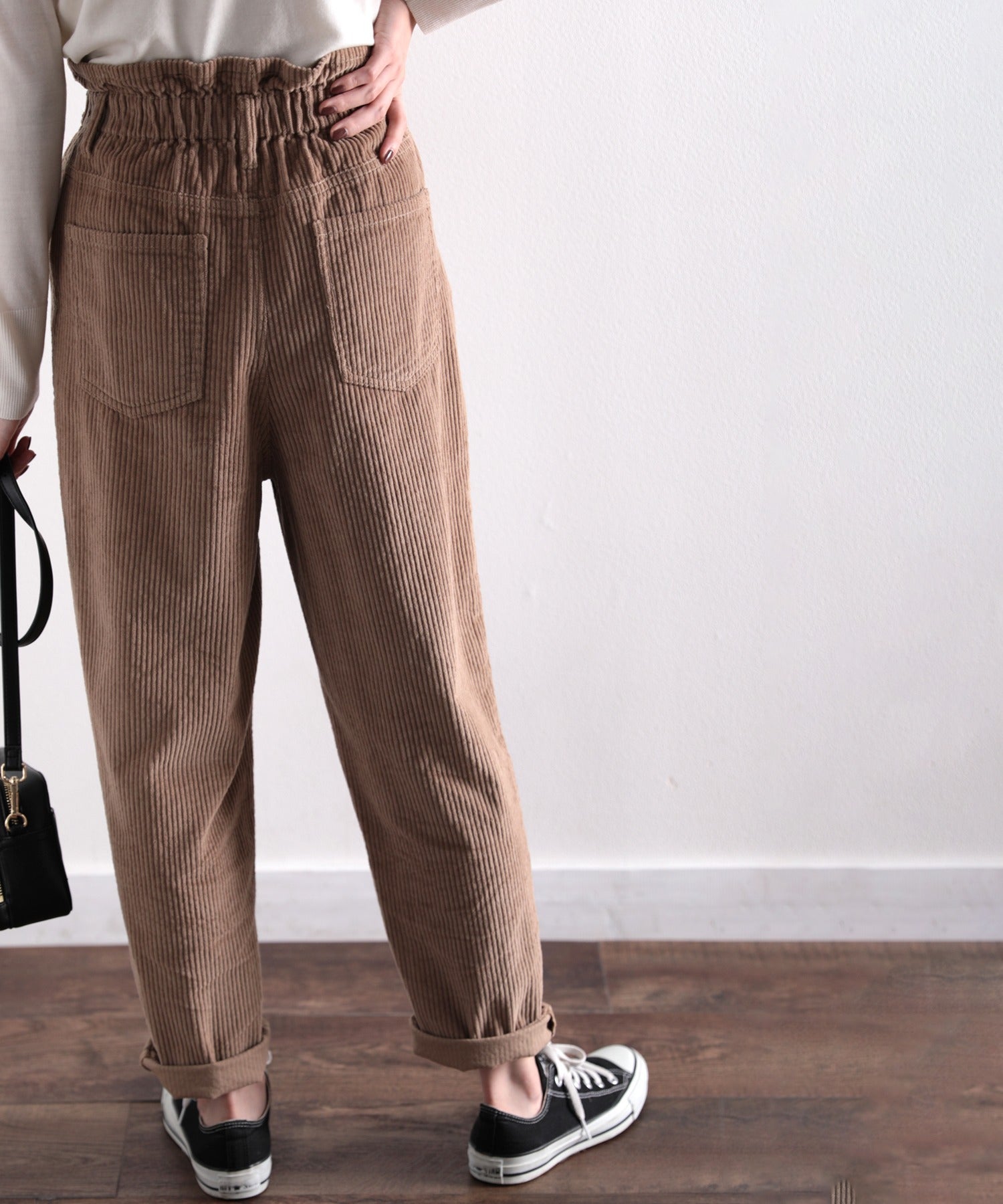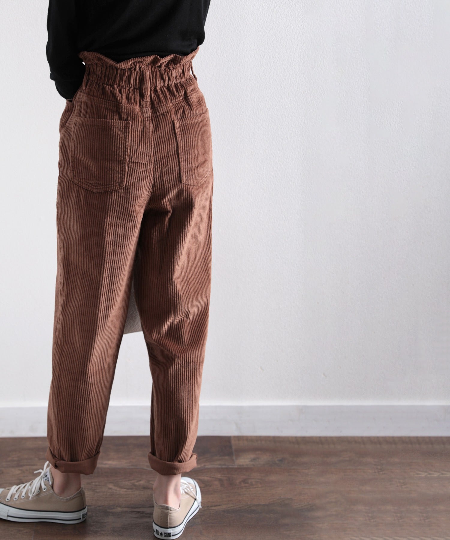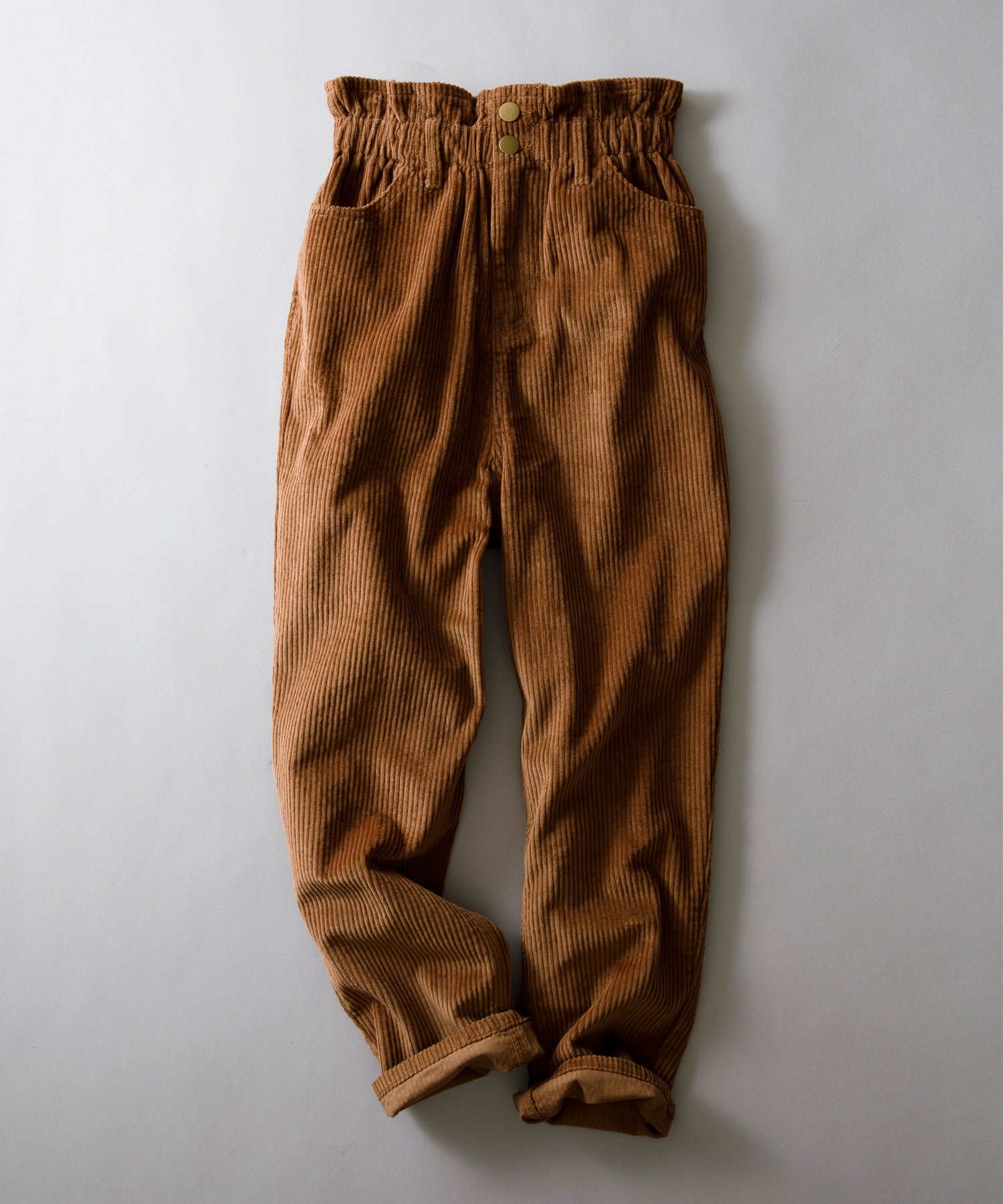 ギャザーウエストコーデュロイ無地ハイウエストテーパードパンツ(フルレングス) elf073
