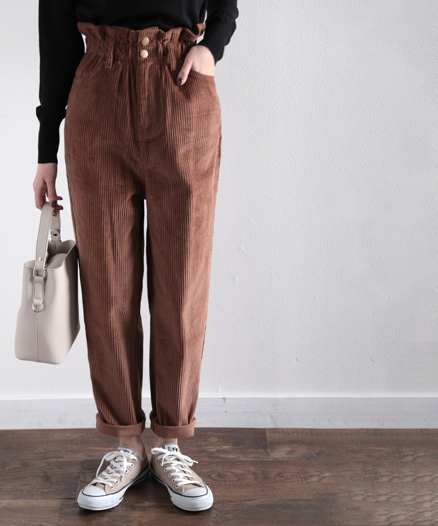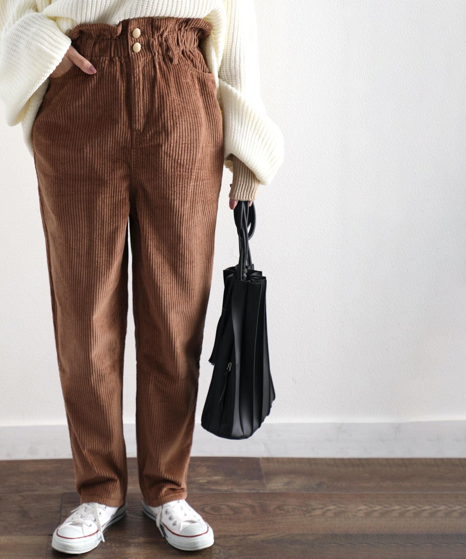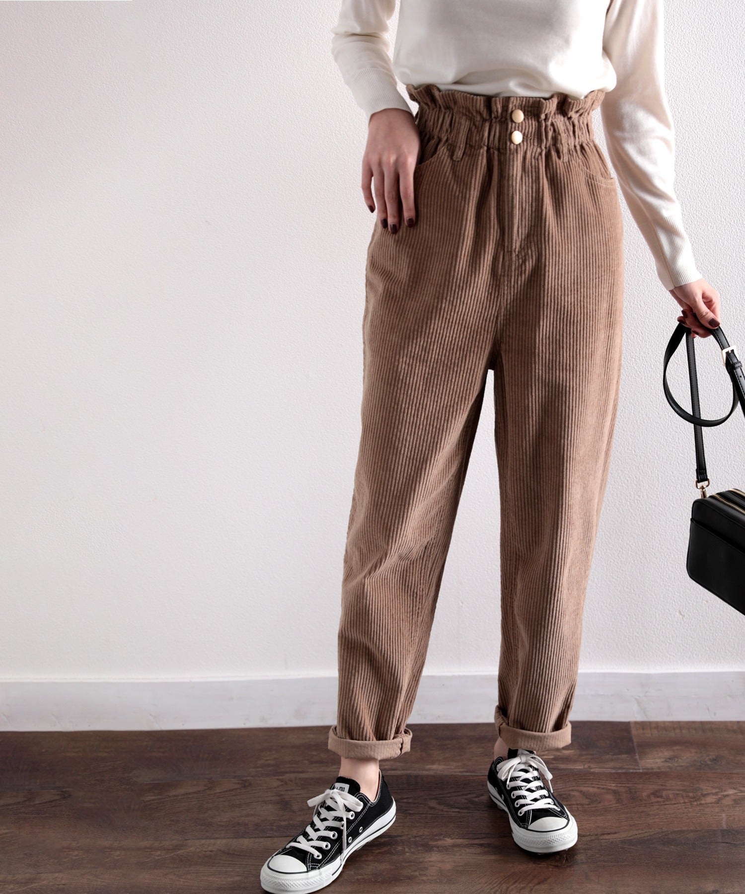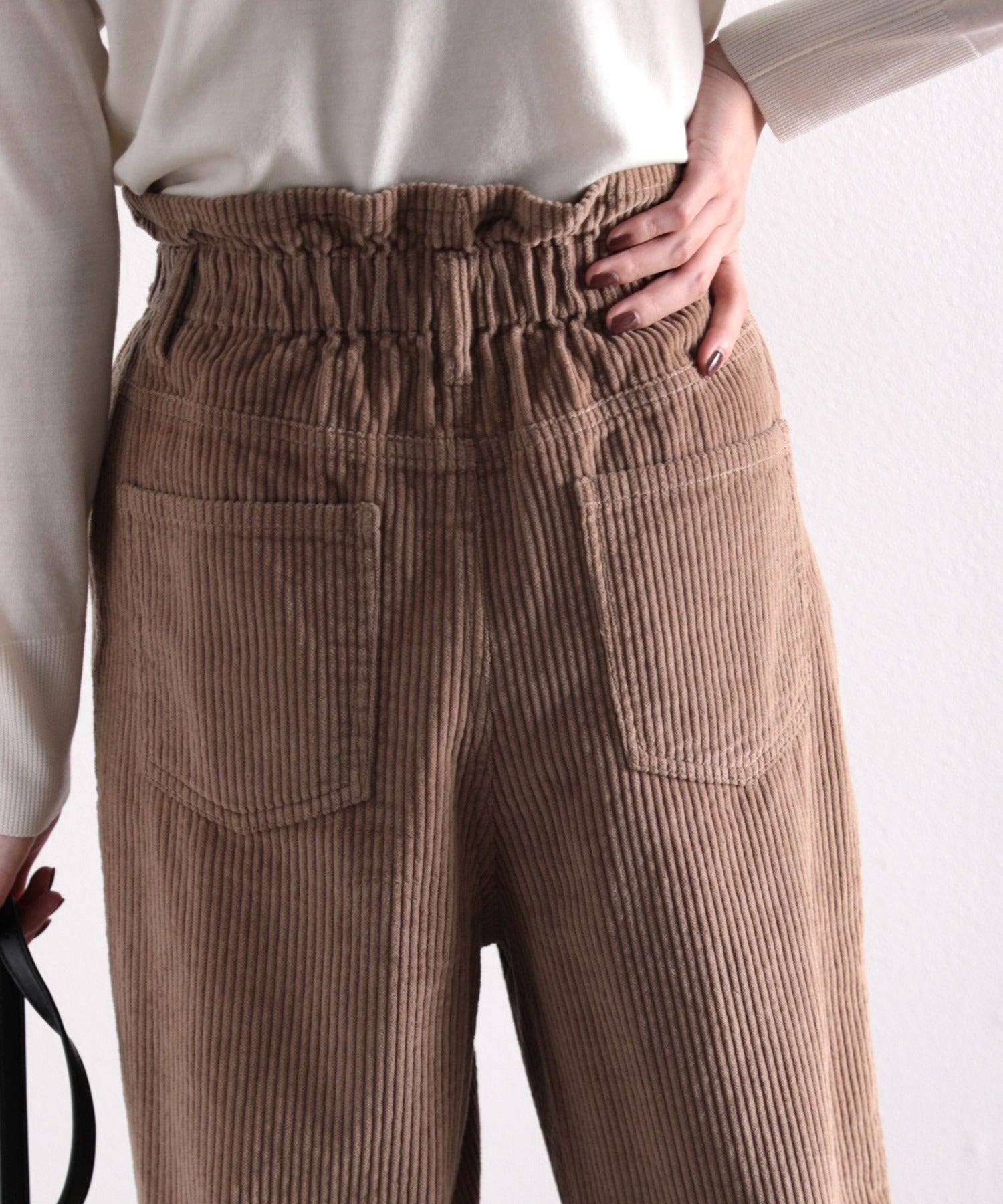 ギャザーウエストコーデュロイ無地ハイウエストテーパードパンツ(フルレングス) elf073
