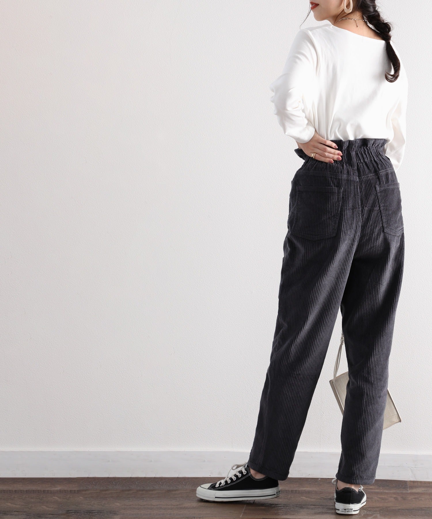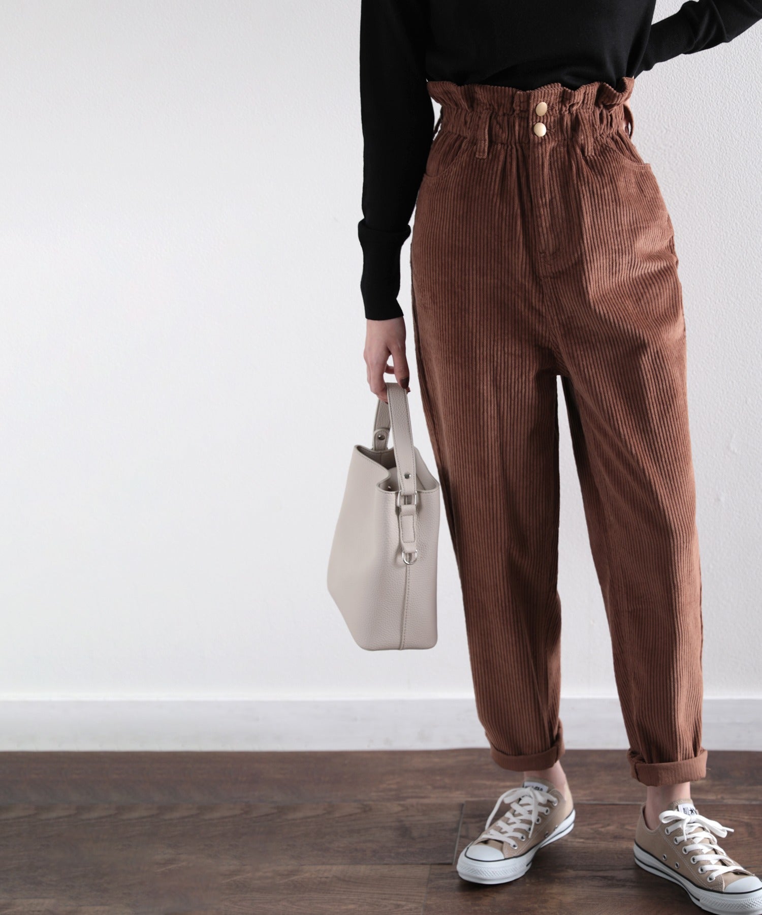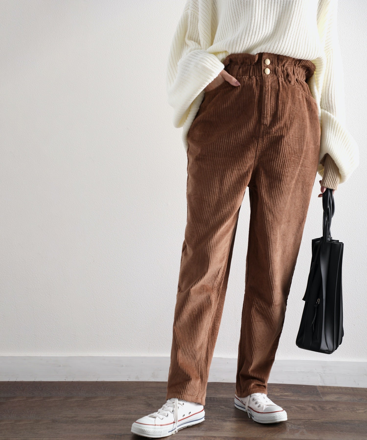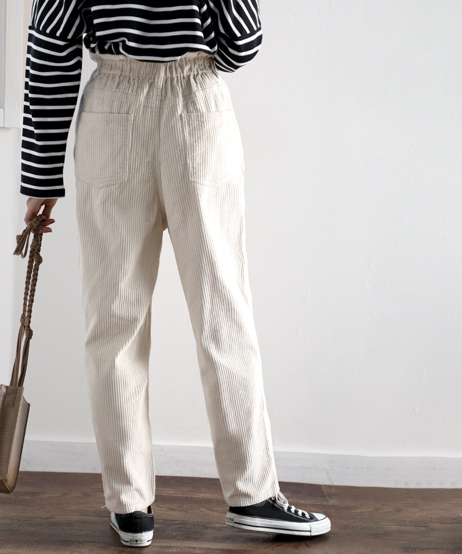 ギャザーウエストコーデュロイ無地ハイウエストテーパードパンツ(フルレングス) elf073