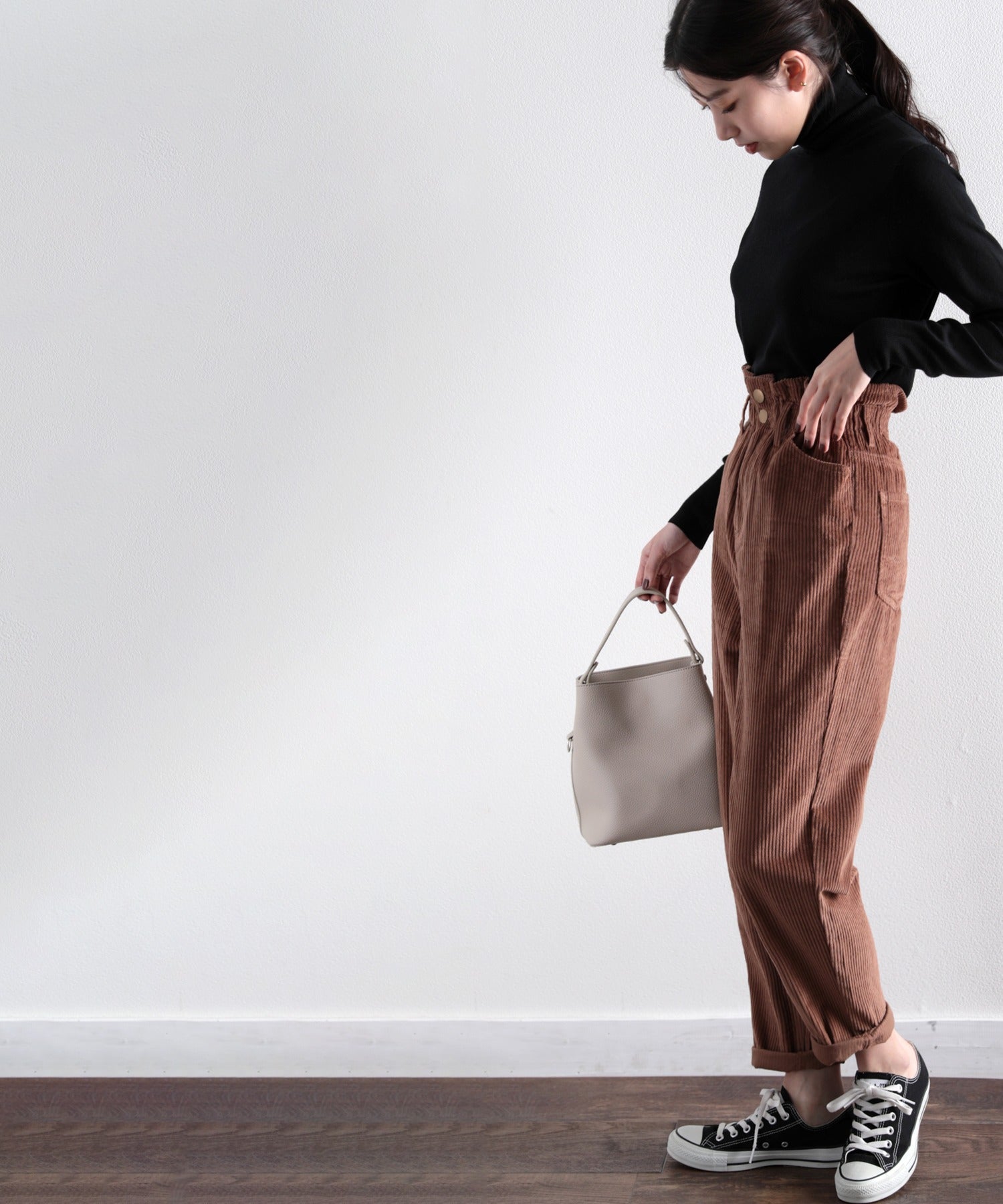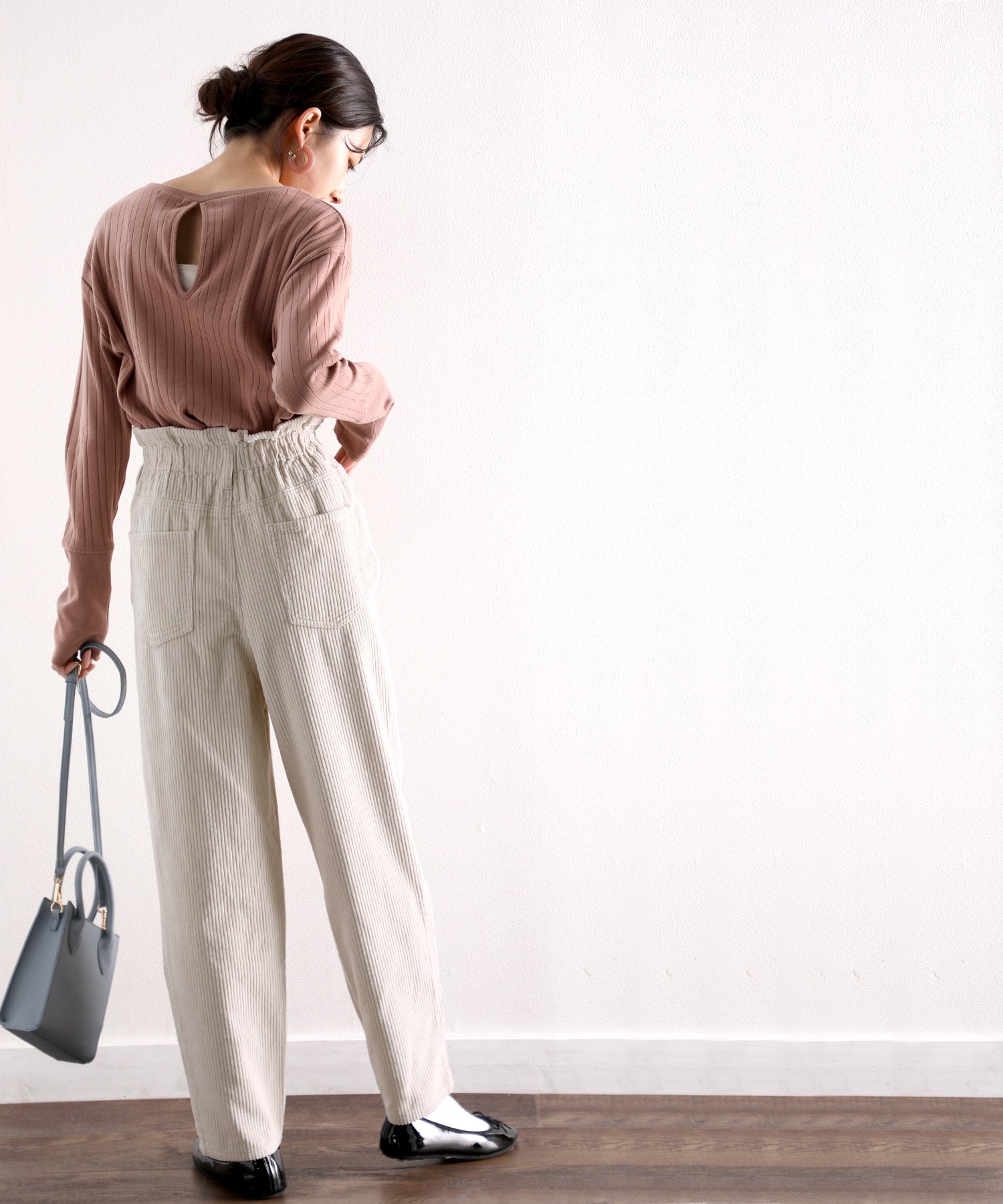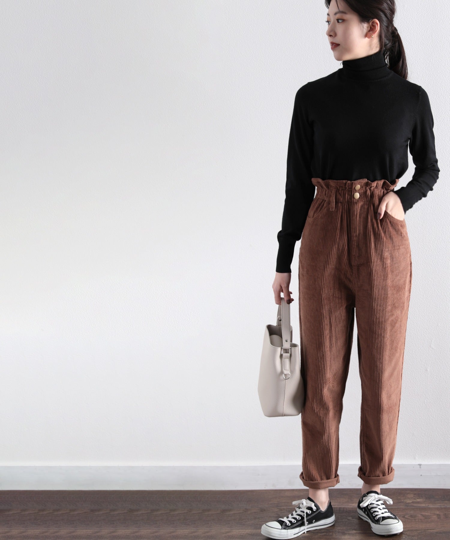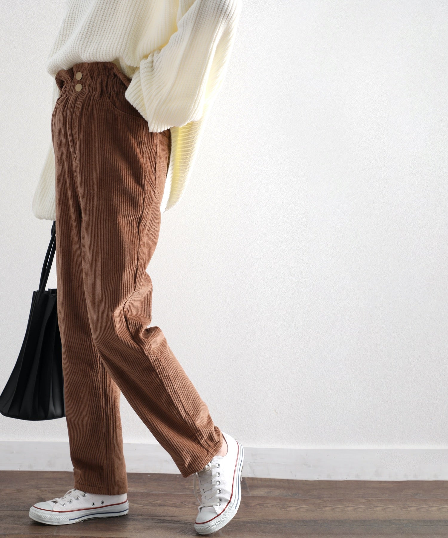 ギャザーウエストコーデュロイ無地ハイウエストテーパードパンツ(フルレングス) elf073