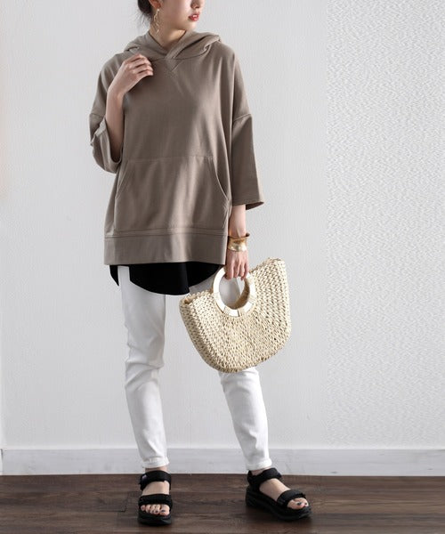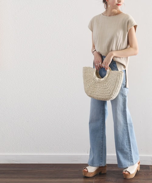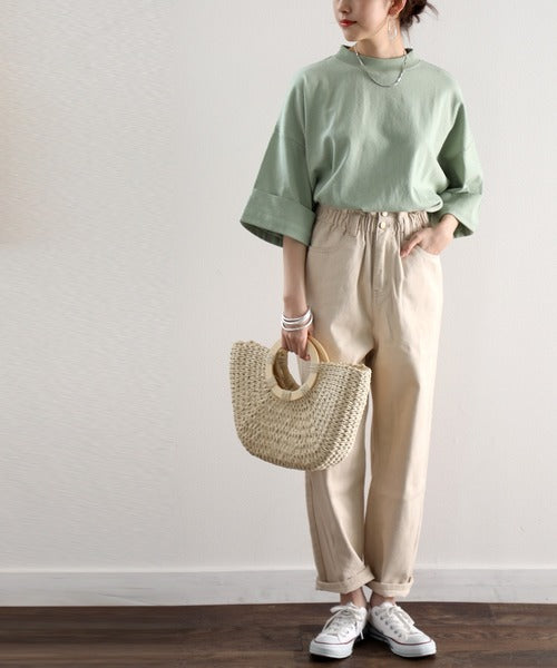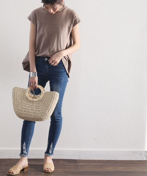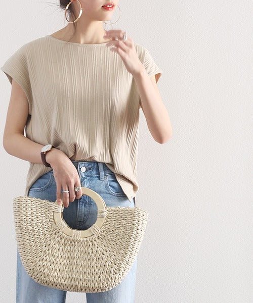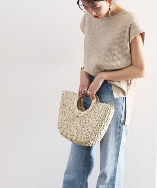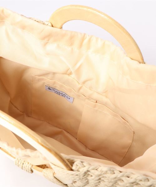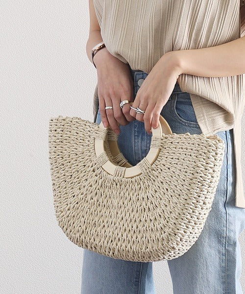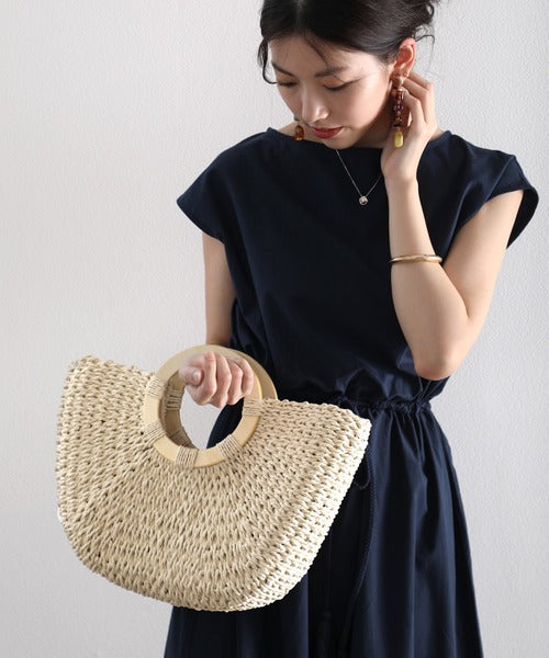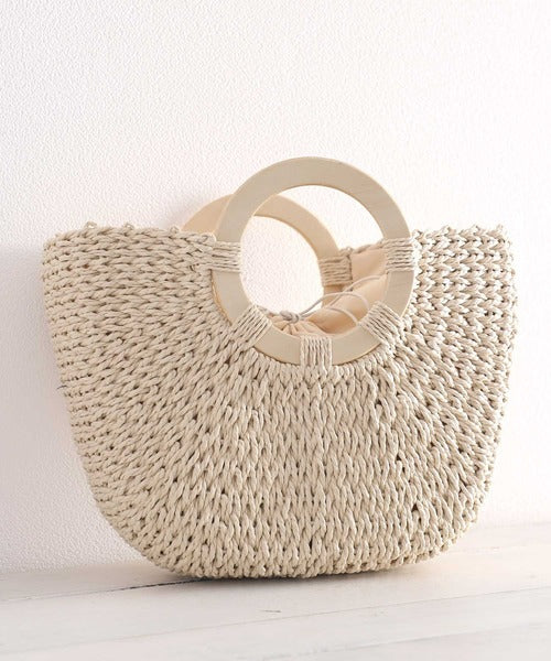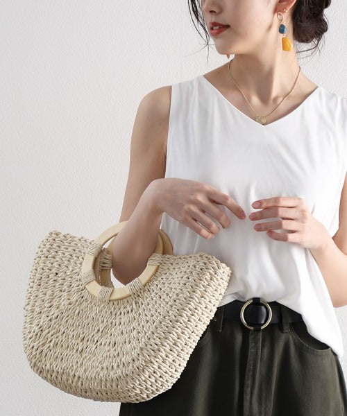 ★ウッドハンドルかごバッグ★ ナチュラルな風合いのシンプルかごバッグ 天然素材で春夏にぴったりなウッドハンドル。 入れ口は巾着タイプになっているため 中が見えることもなく、持ち運び楽々。 デイリーに必要なものはしっかり収納できる 大容量ボリューム。 春夏のデイリーコーデにはもちろん、 浴衣やマリンコーデにもぴったり