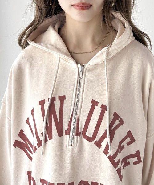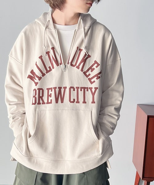 ハーフジップのパーカーは、一枚で着るのはもちろん、