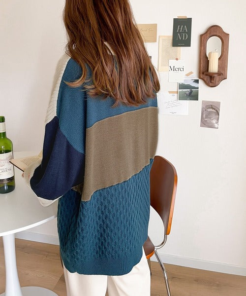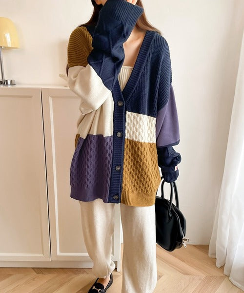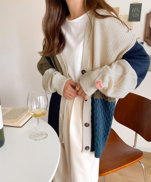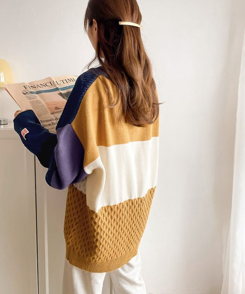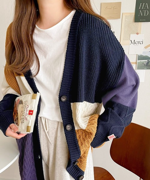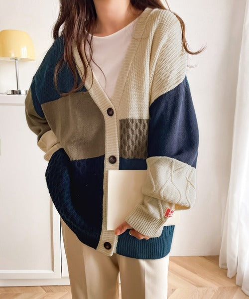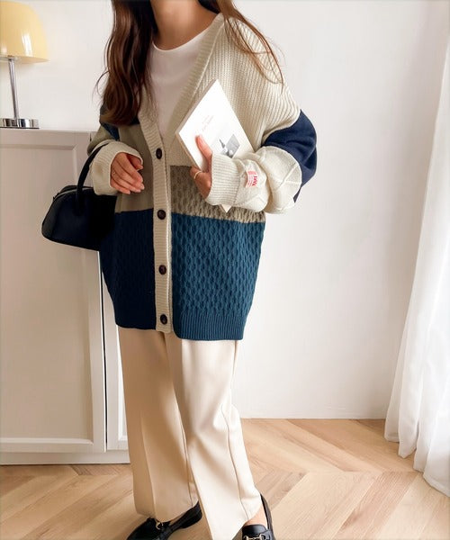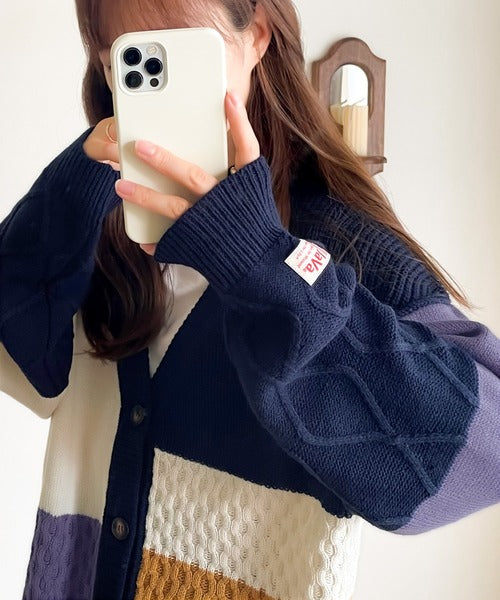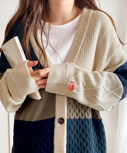 《JaVa ジャバコラボ》女の子のレトロ可愛い。配色パネル切替えVネックケーブル編みニットカーディガン jv0420009