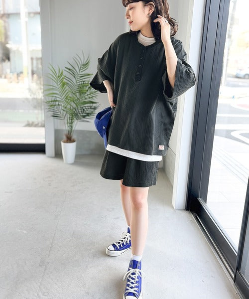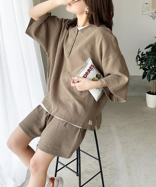 ダブルガーゼの楊柳高見え素材で大人カジュアル感のあるアイテム。