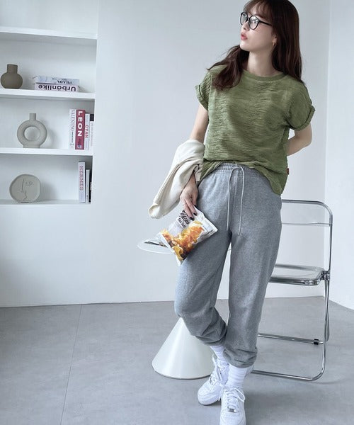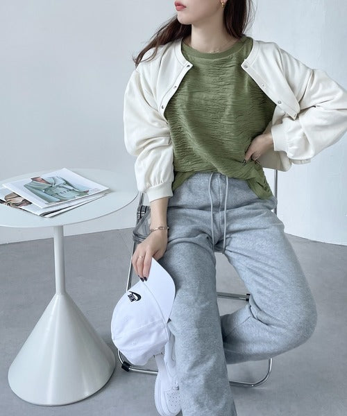 上品見えする素材なので流行りのスウェットと合わせても大人カジュアルにキマります◎