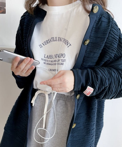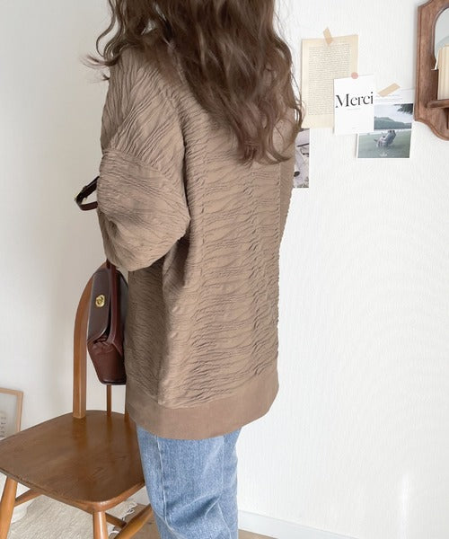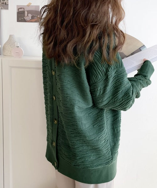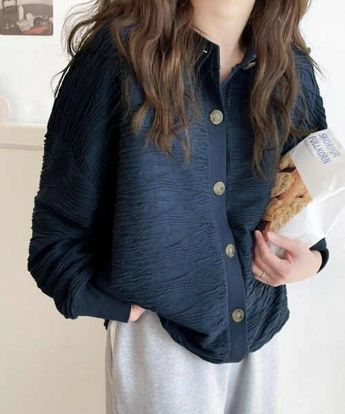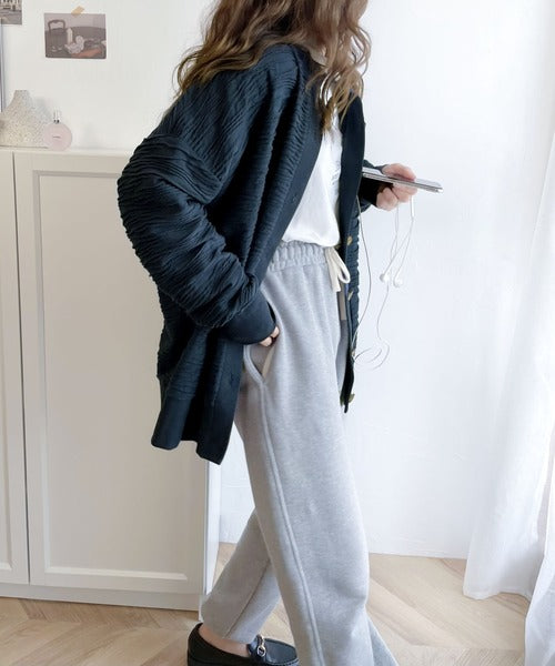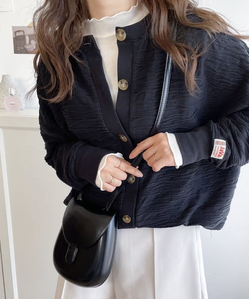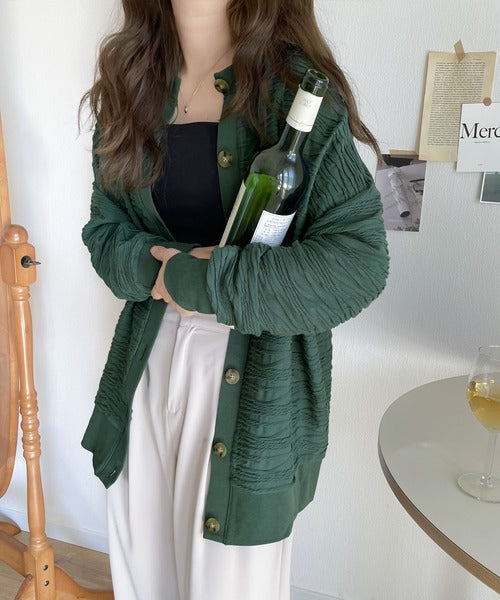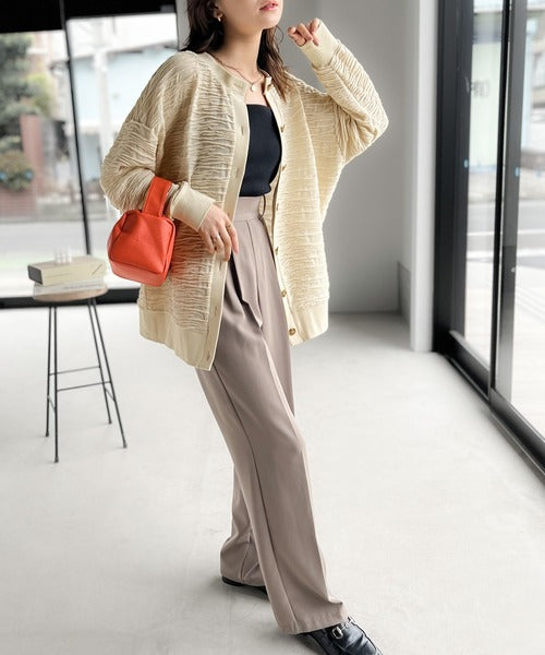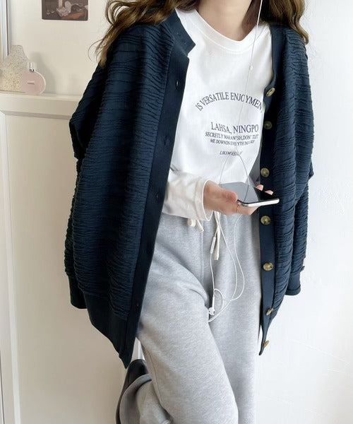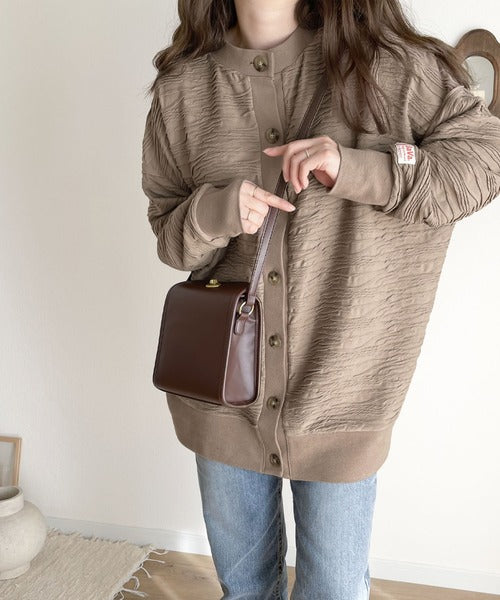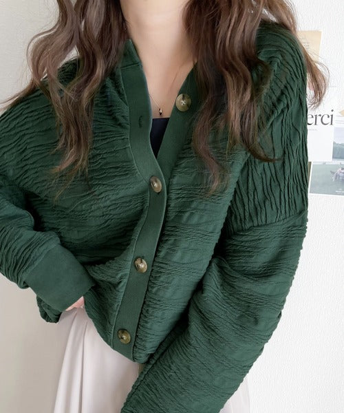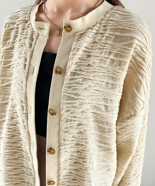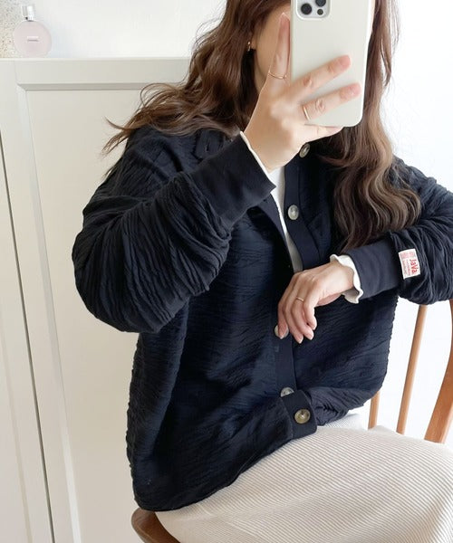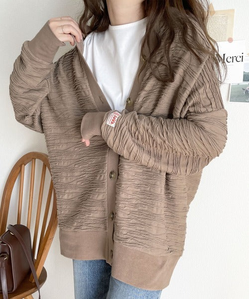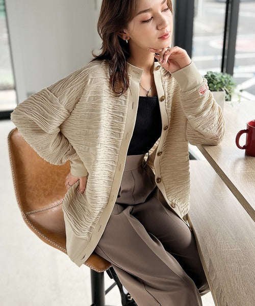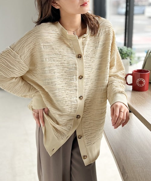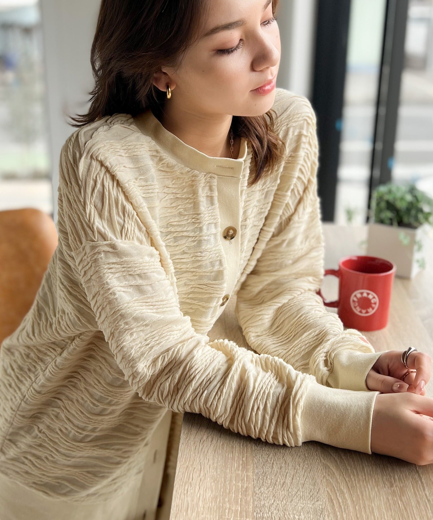 表面にふくらみのあるジャガード素材のこなれ感あふれるカーディガンです。