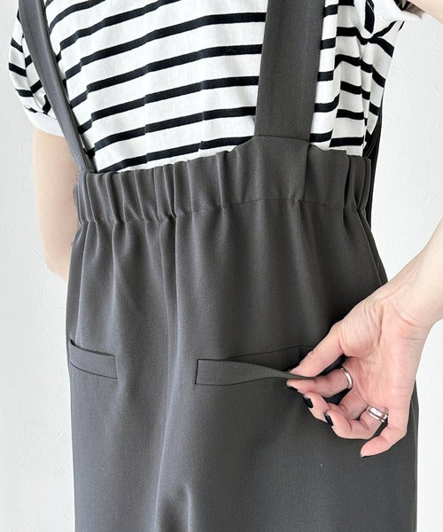 レーヨン入りの柔らかな素材とゆったりシルエットでリラックス感のあるワイドサロペットです。