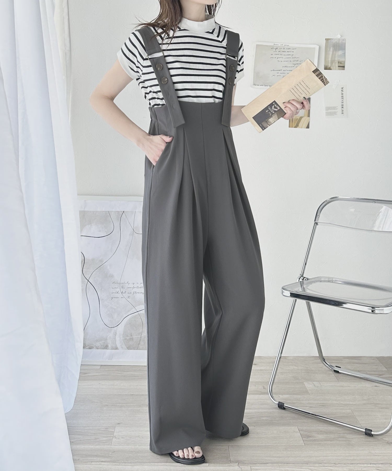 インナー次第でキレイめコーデにもモードにも着こなせるサロペット。