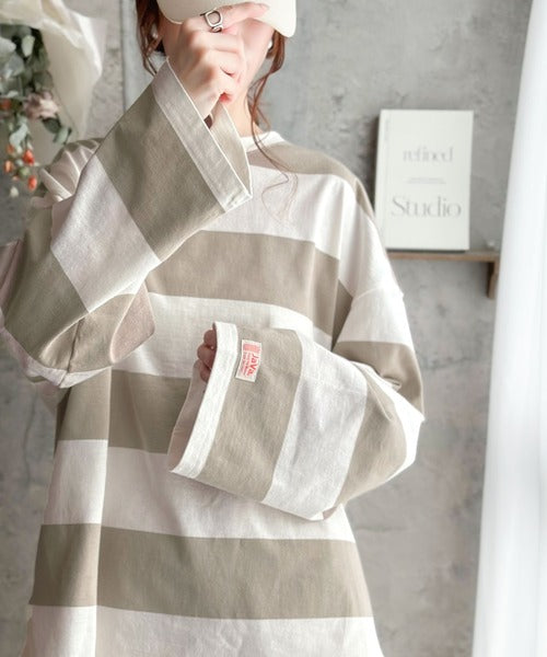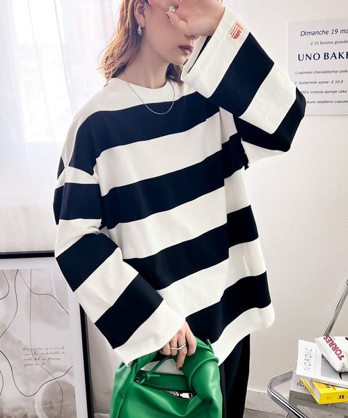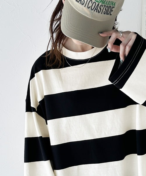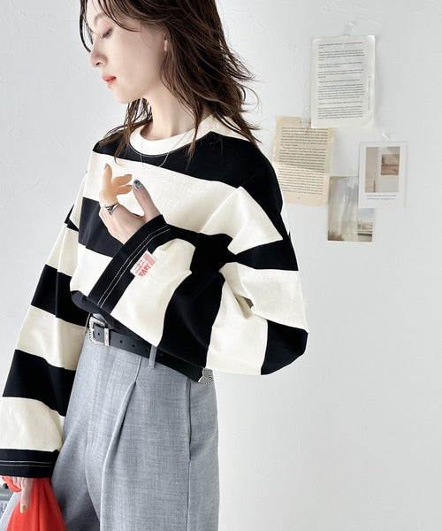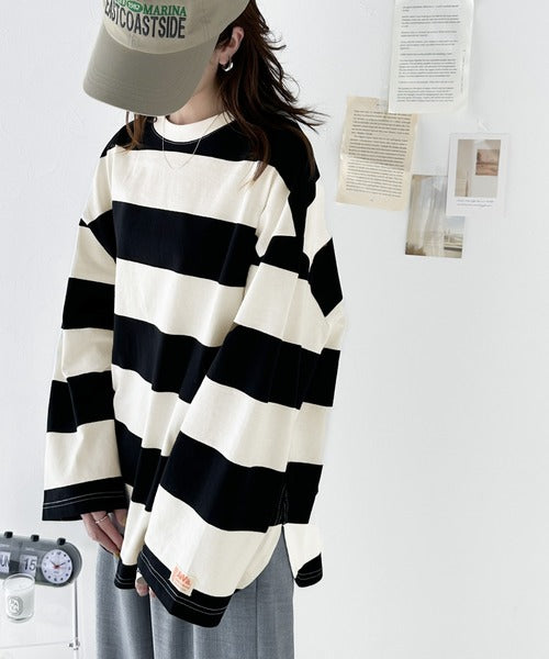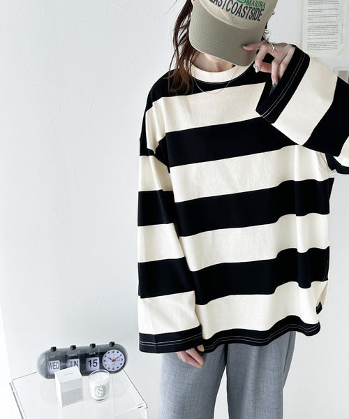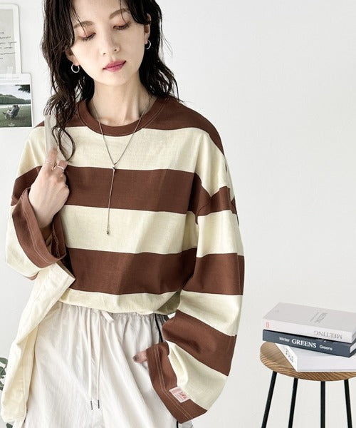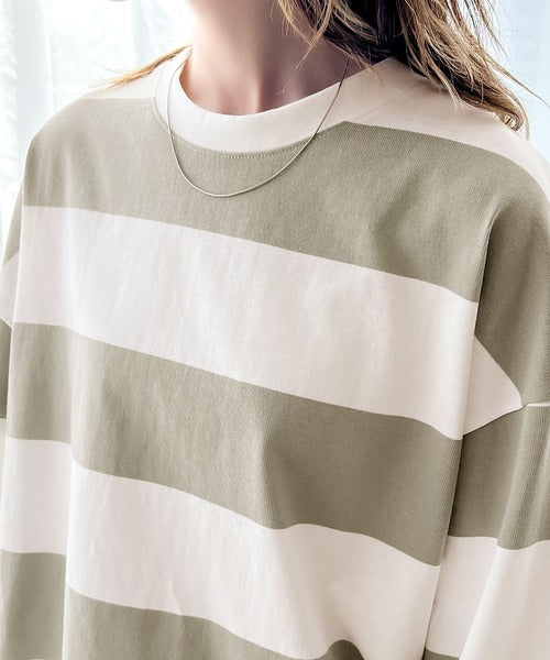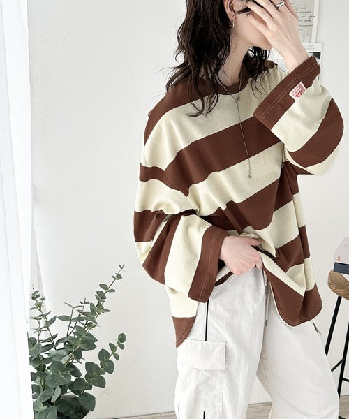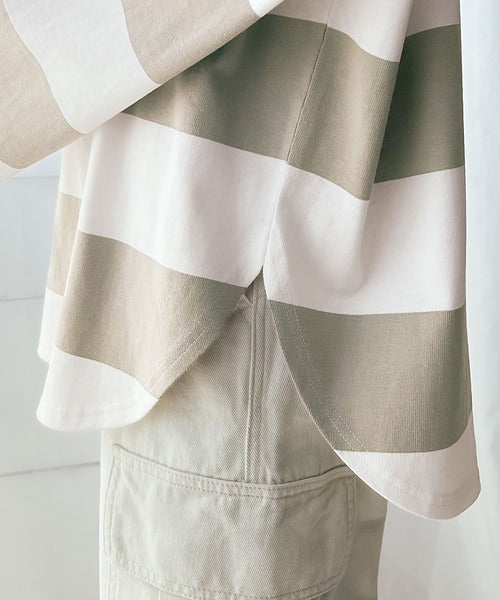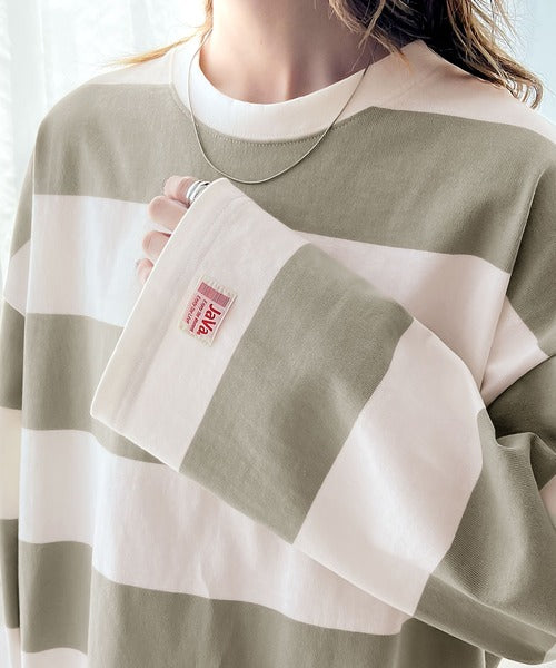 《JaVa ジャバコラボ》目を惹く、カジュアル。綿100%ワイドボーダー裾ラウンドbigシルエットロンTee jv0970001