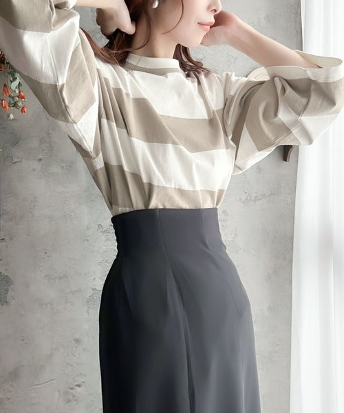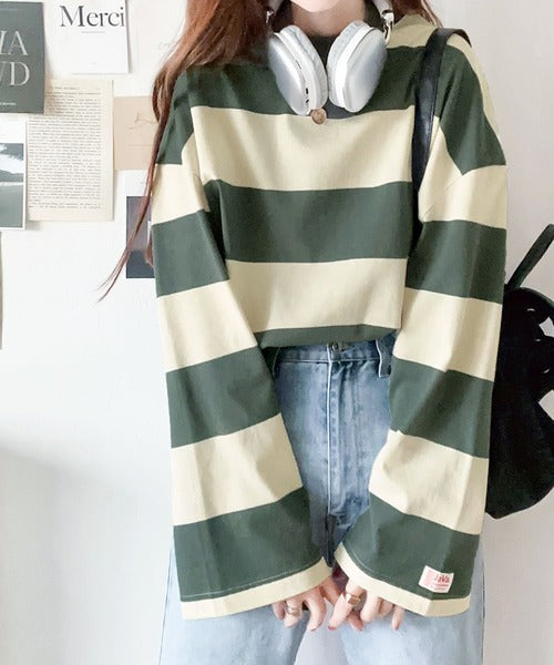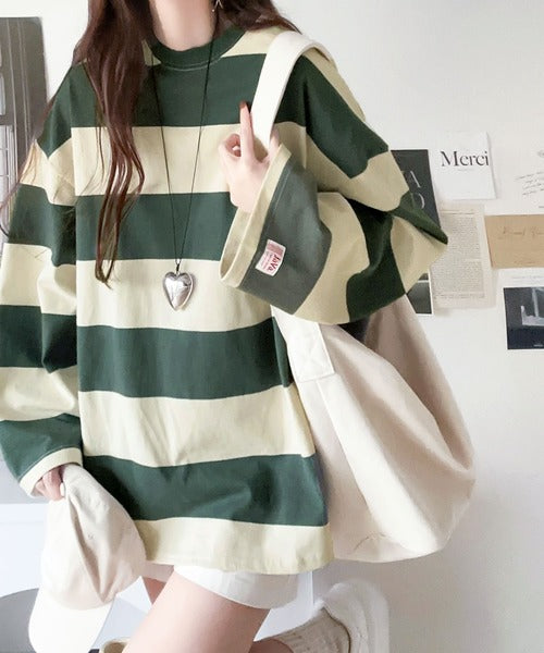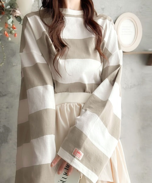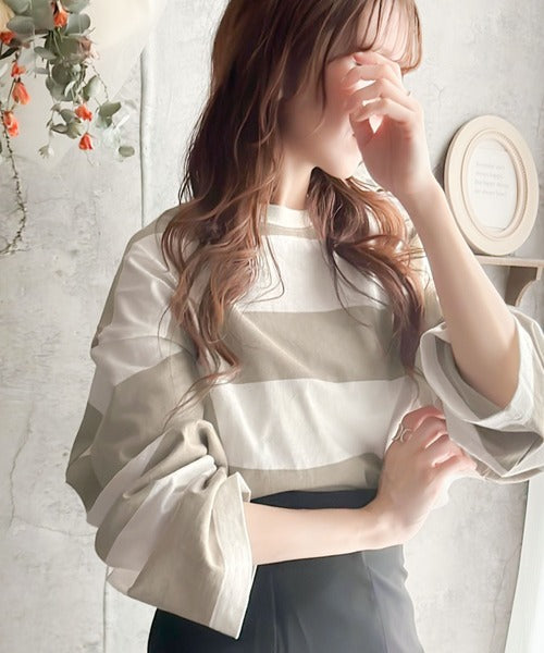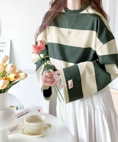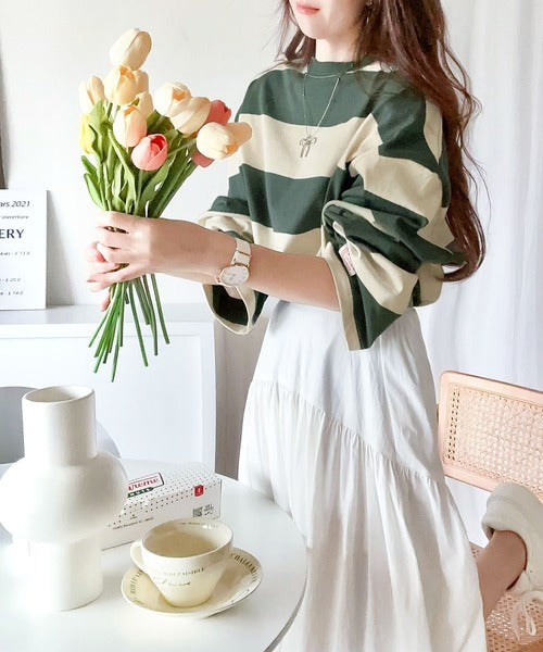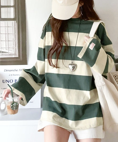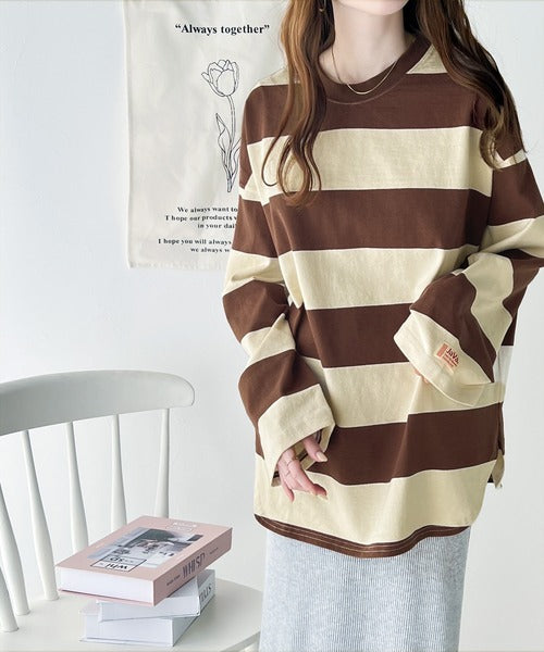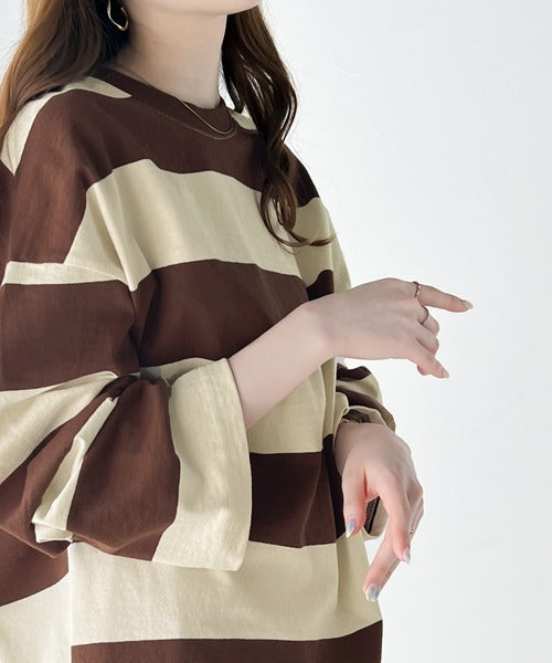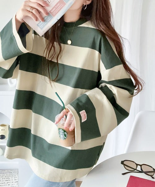 《JaVa ジャバコラボ》目を惹く、カジュアル。綿100%ワイドボーダー裾ラウンドbigシルエットロンTee jv0970001