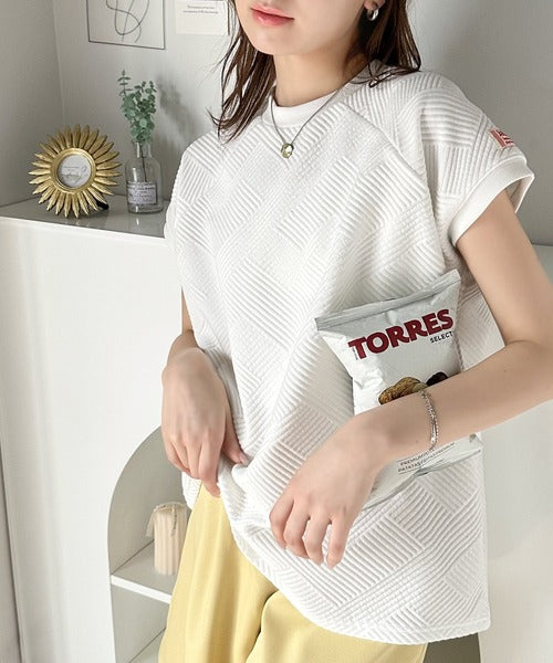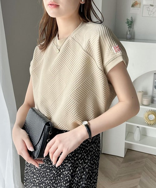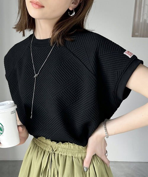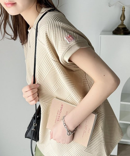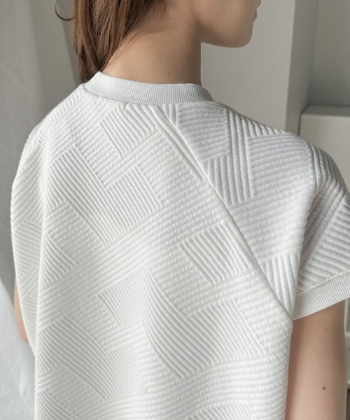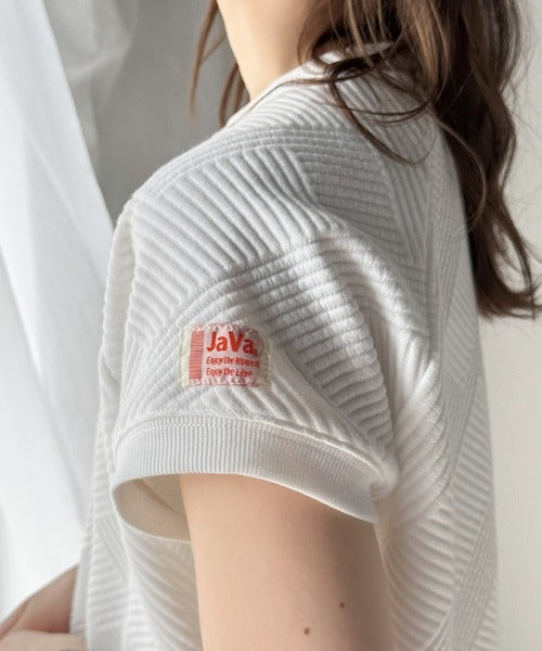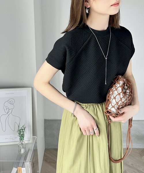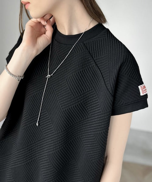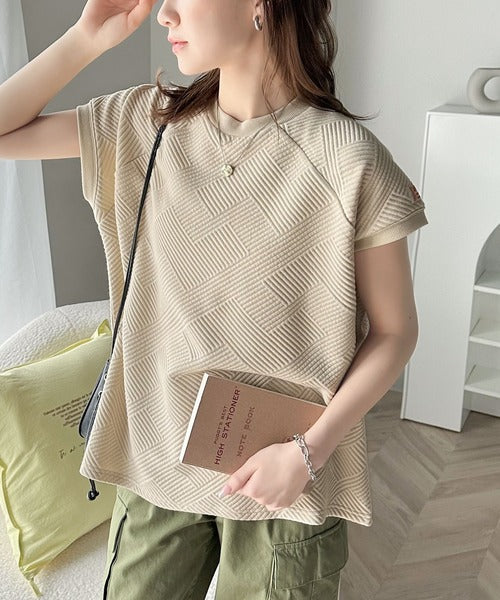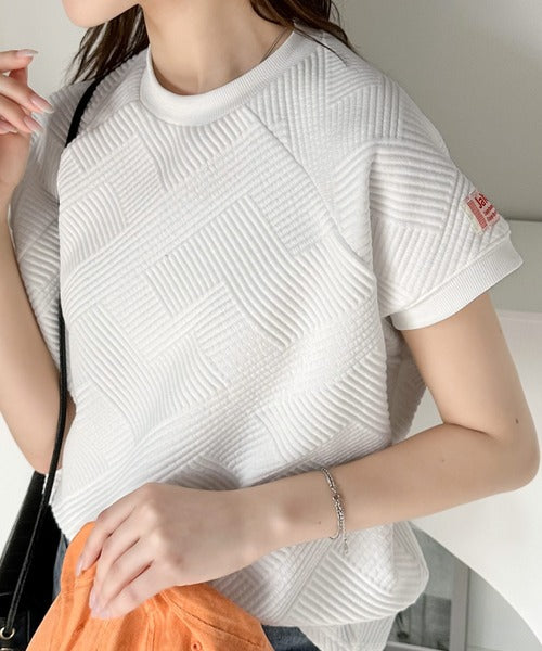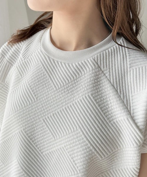 凹凸感のある斜めストライプ柄が目を引く半袖ラグランプルオーバー。