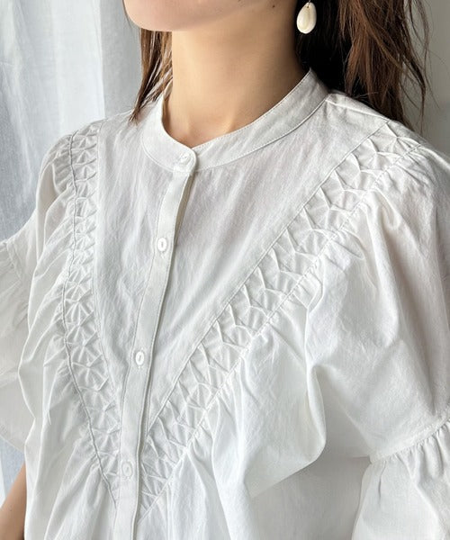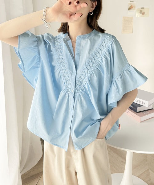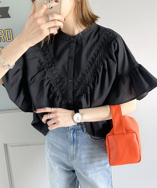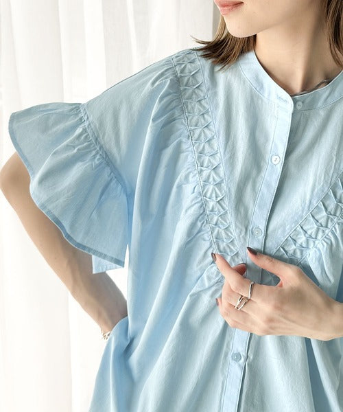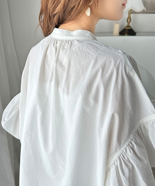 大きめのフリル袖が目を惹き、フロントとバックの襟元にもたっぷりギャザーと飾り