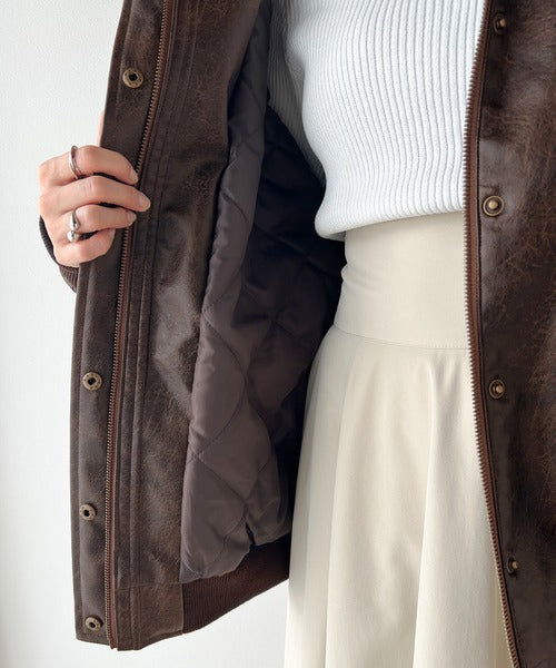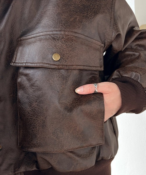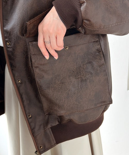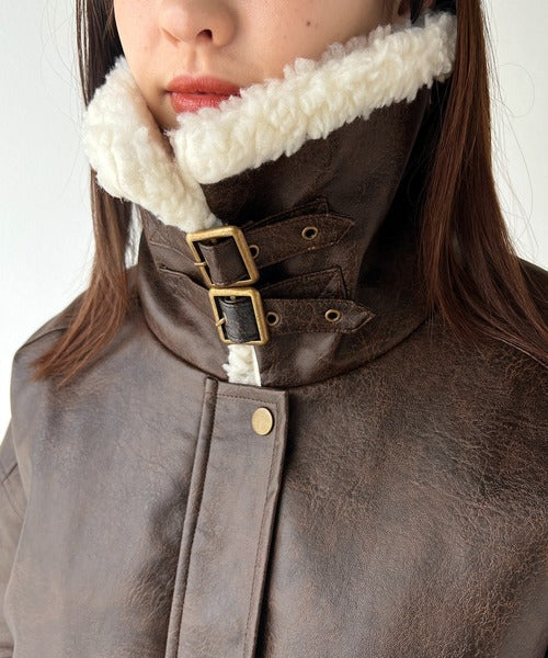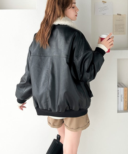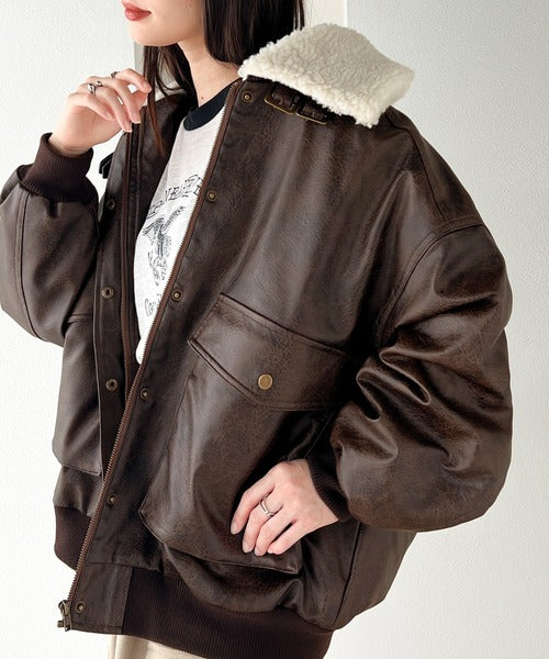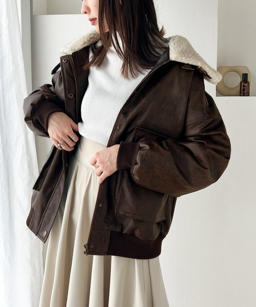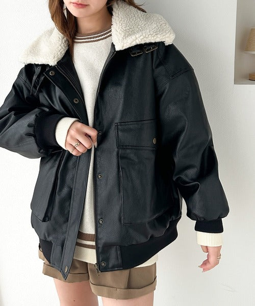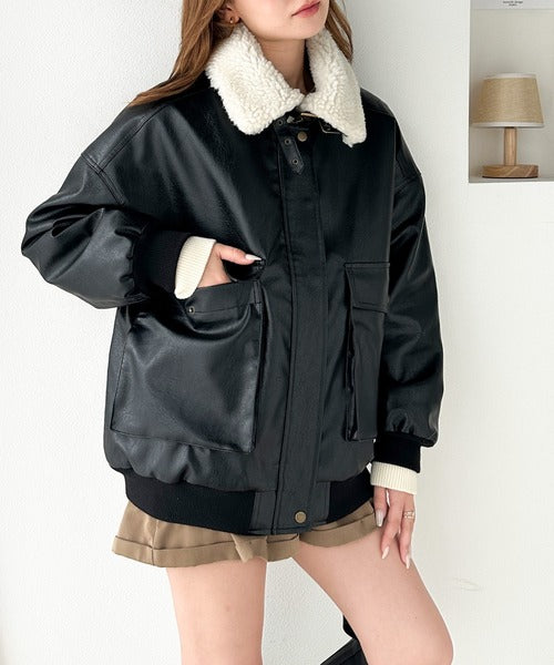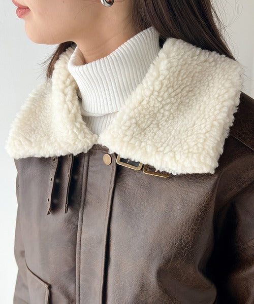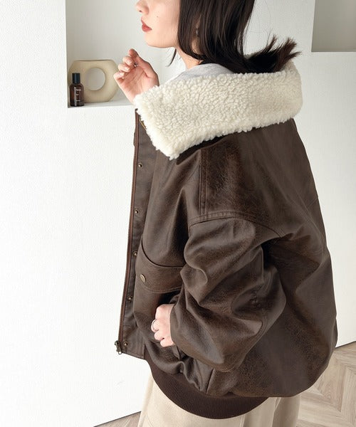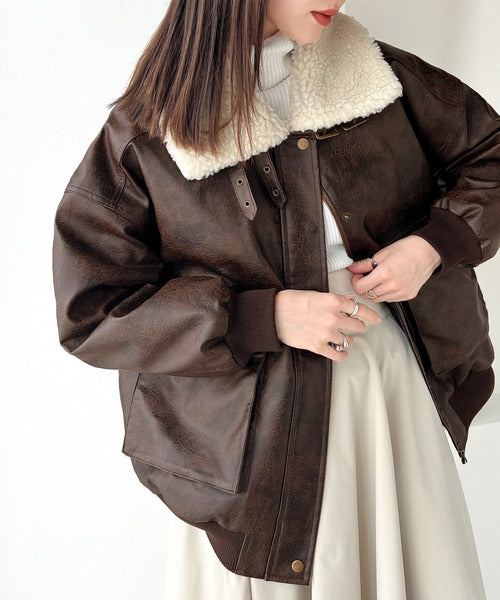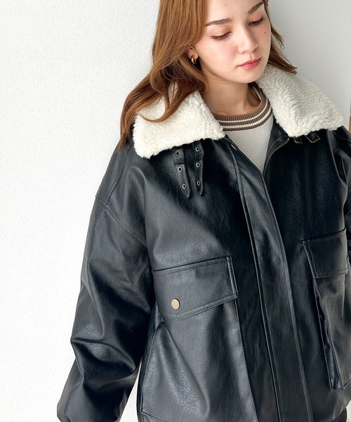 襟のボア×フェイクレザーがポイントのヴィンテージライクなレザージャケット。