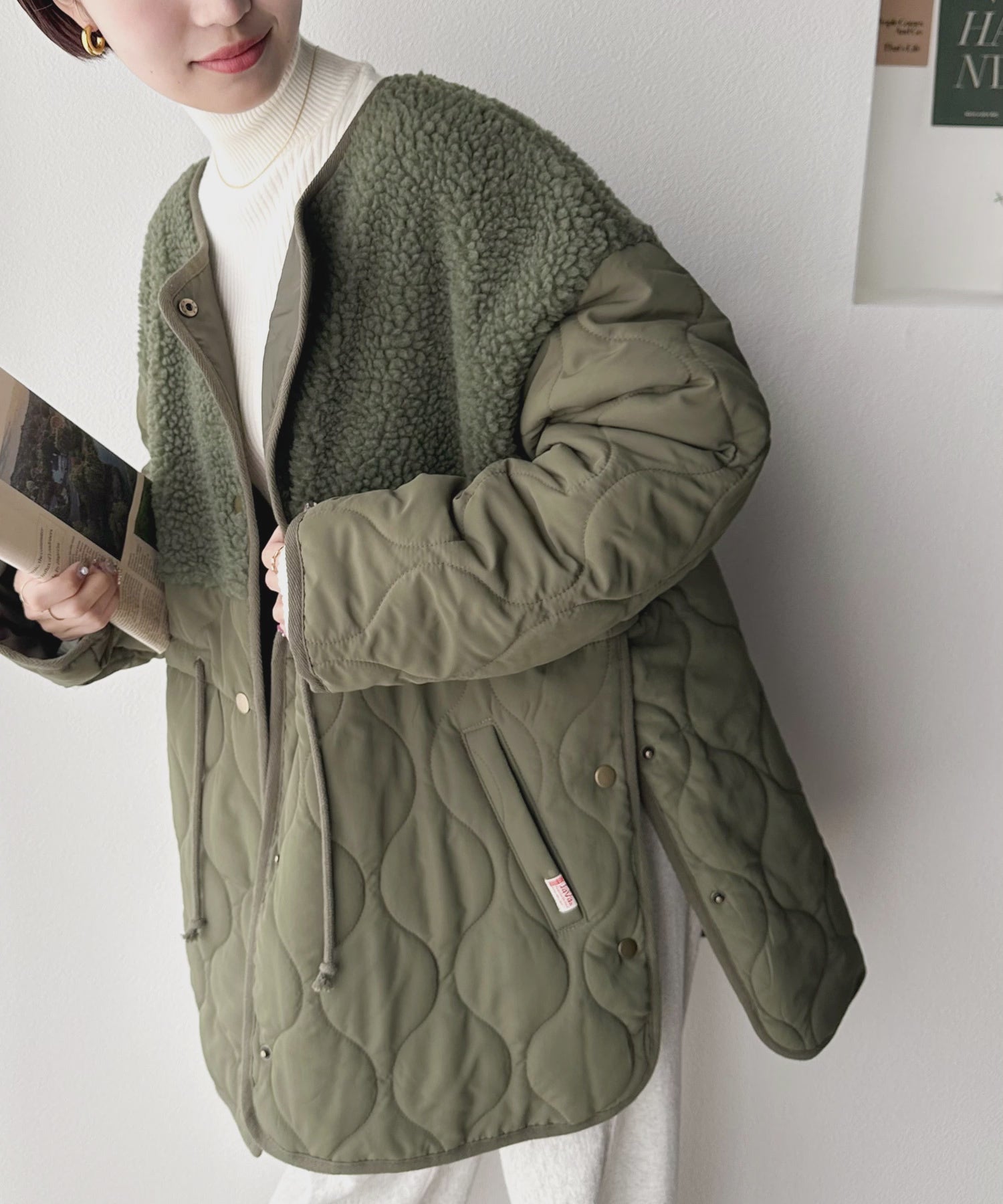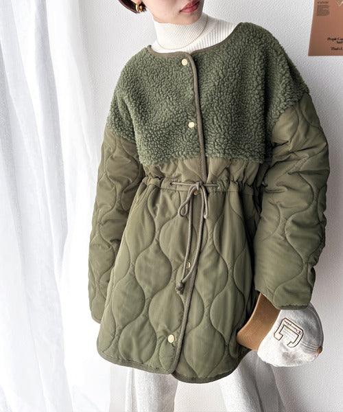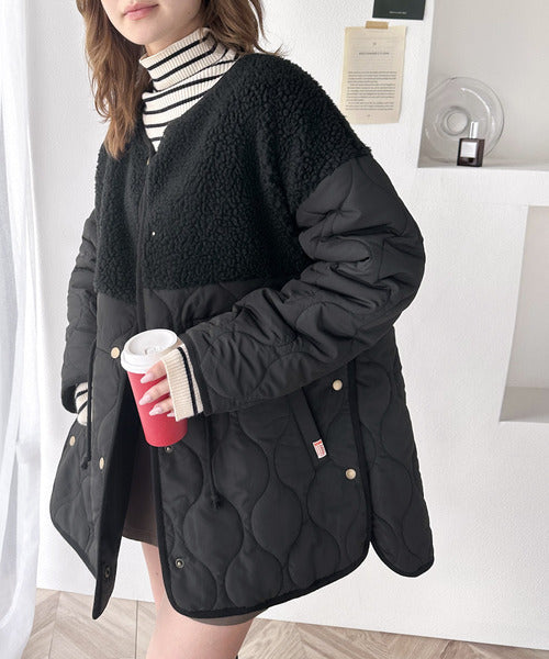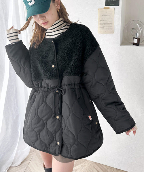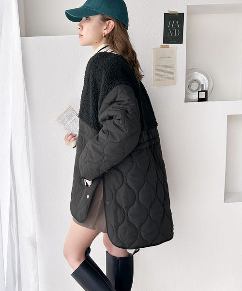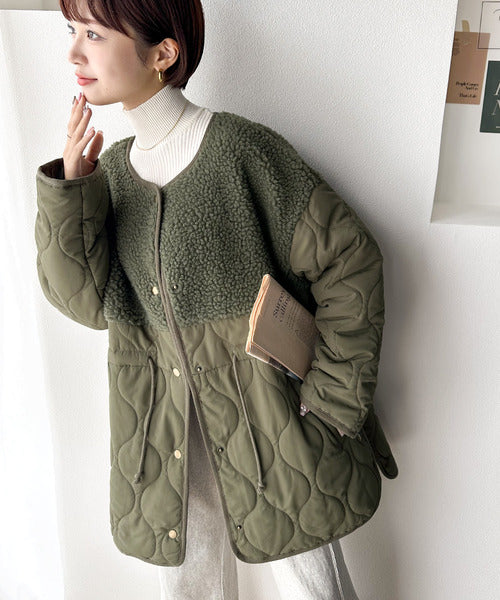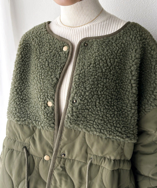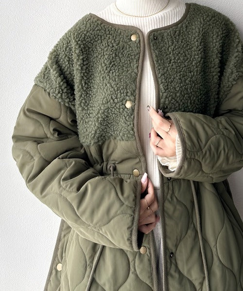 トレンドの配色使いがポイントでボア×キルトのノーカラーミドル丈コート。