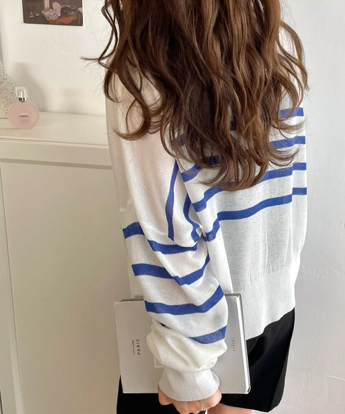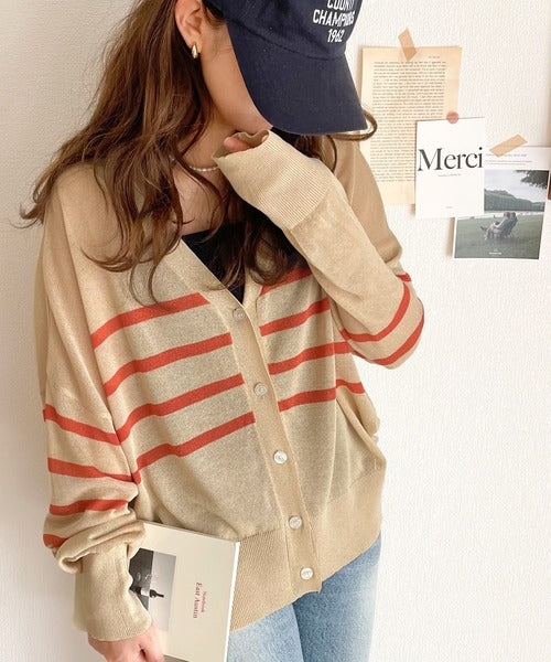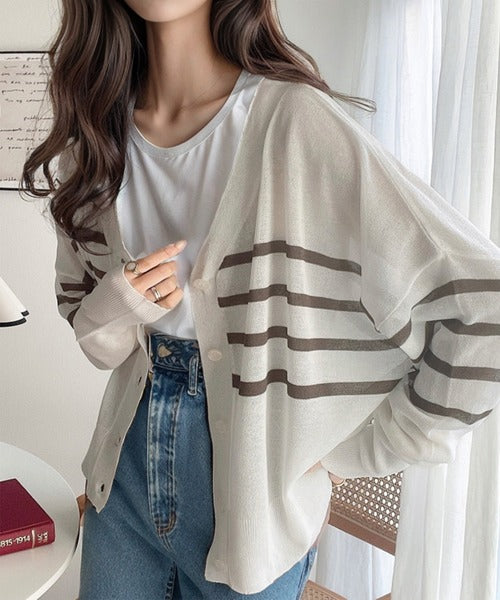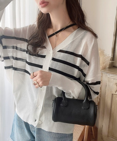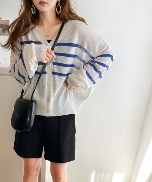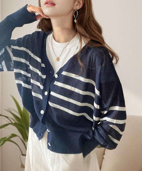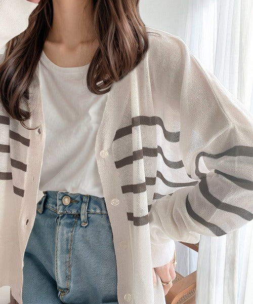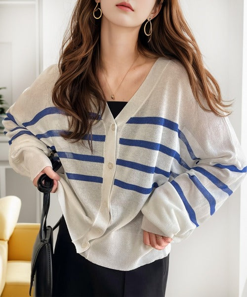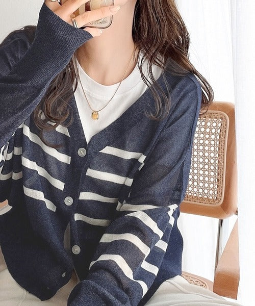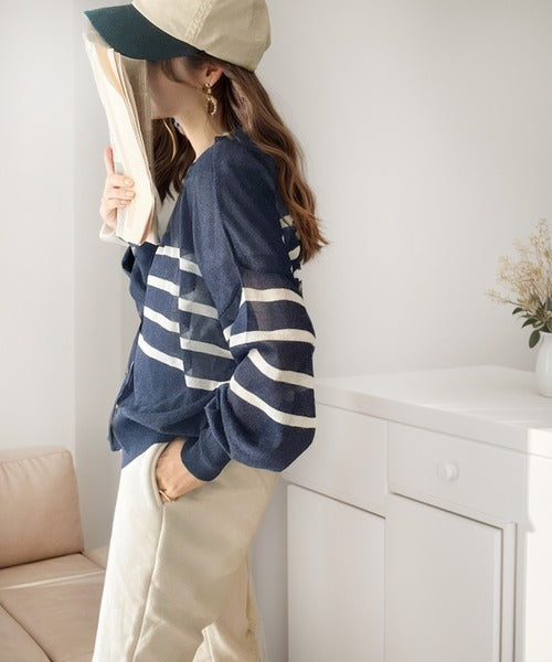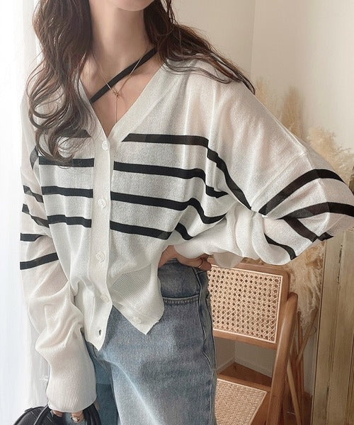 マリンテイスト漂う大人ボーダーシアーカーディガン。