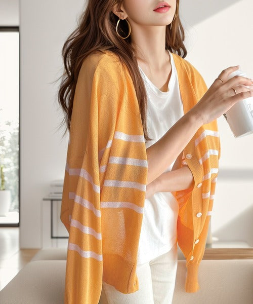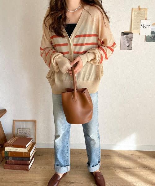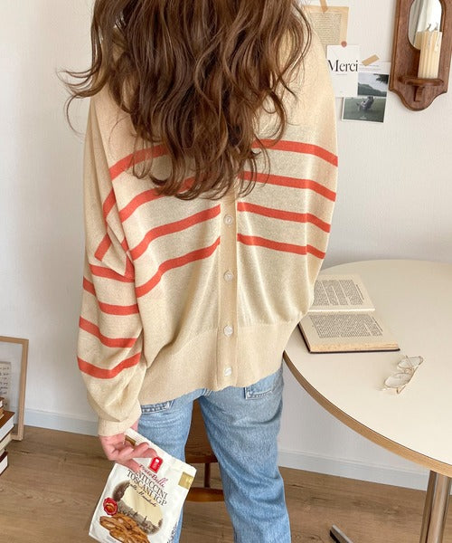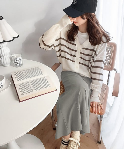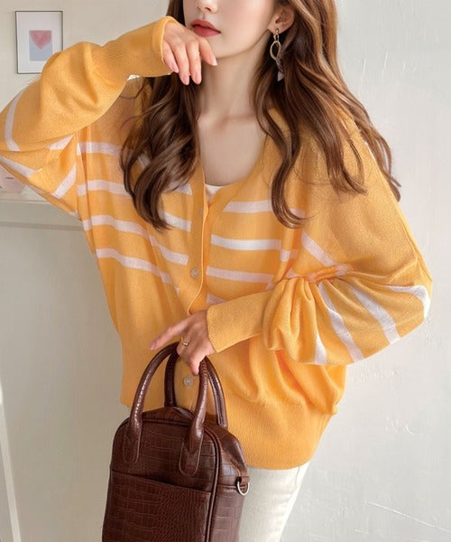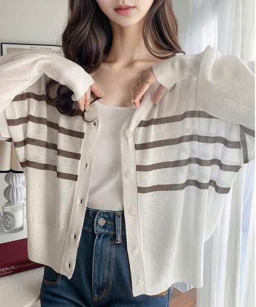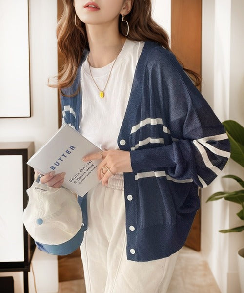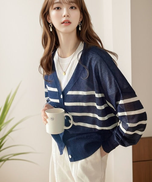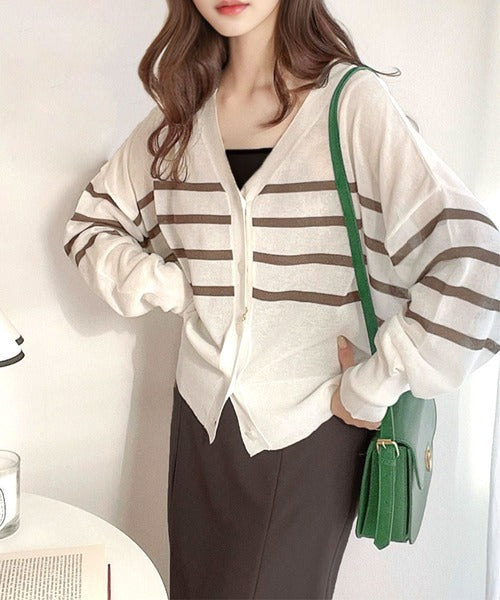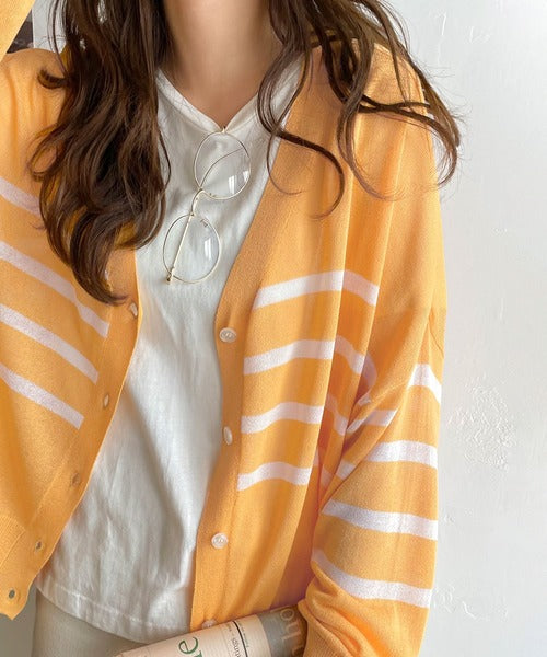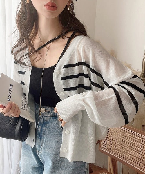 マリンテイスト漂う大人ボーダーシアーカーディガン。