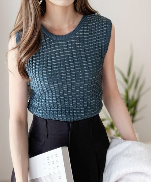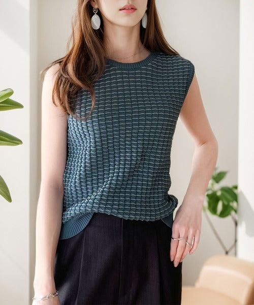思わず触れたくなる凸凹素材で、伸縮性抜群のサマーニット素材。