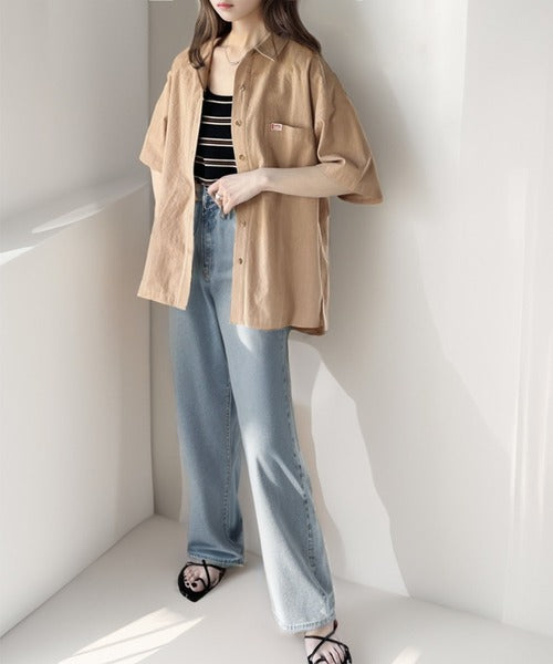 デコルテを見せた抜き襟スタイルで無造作なシャツコーデも◎