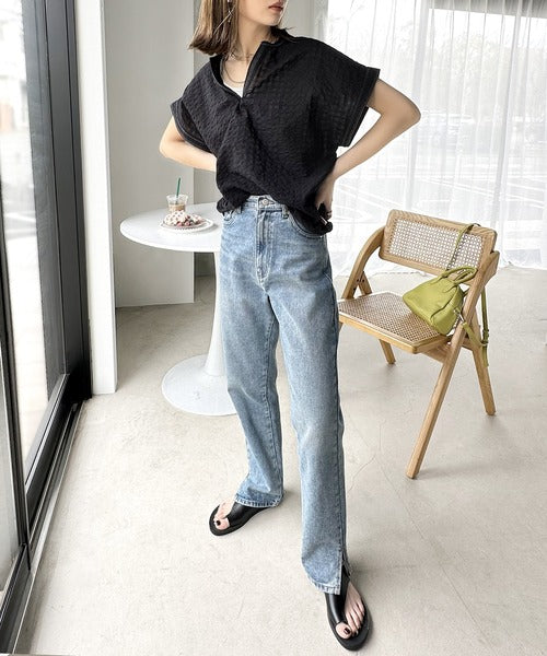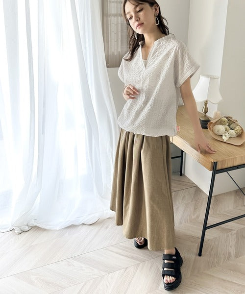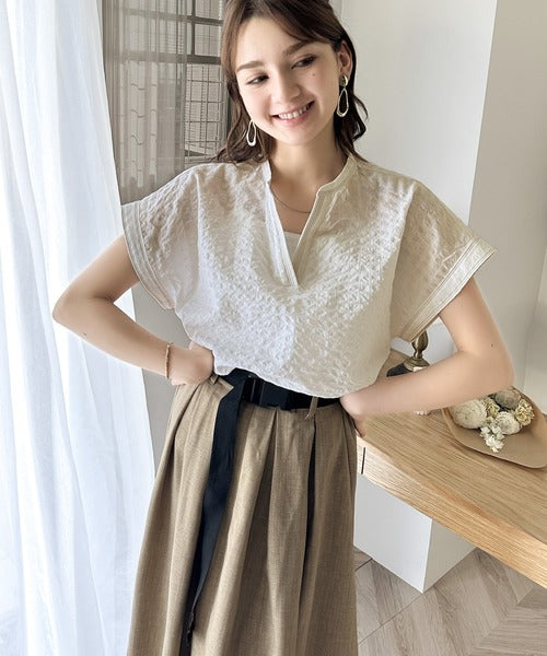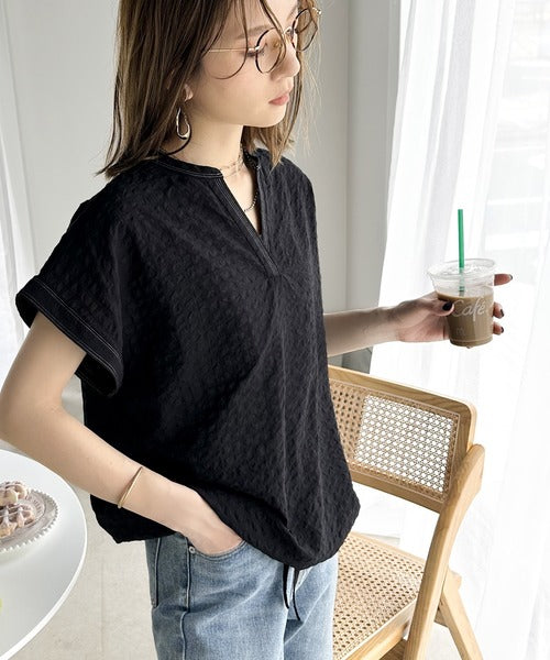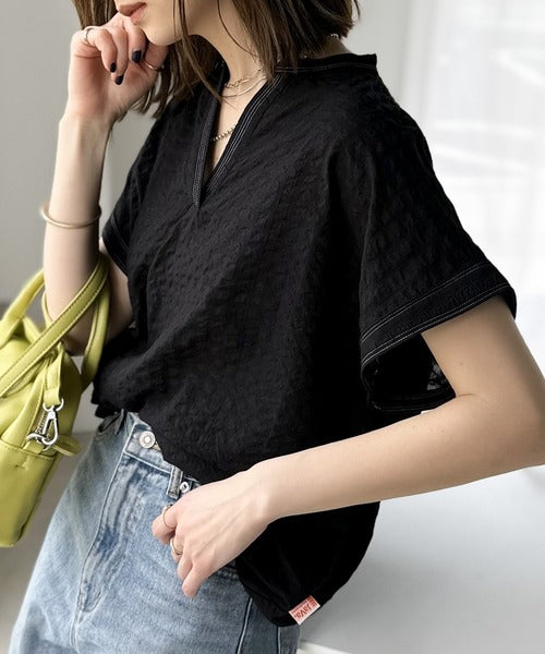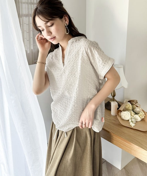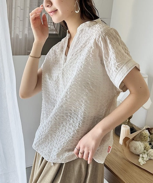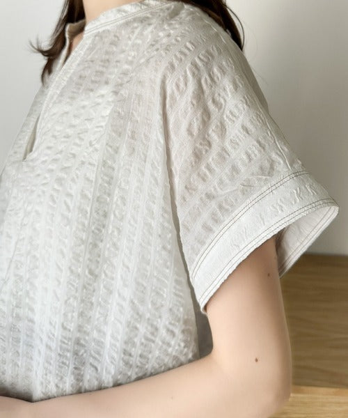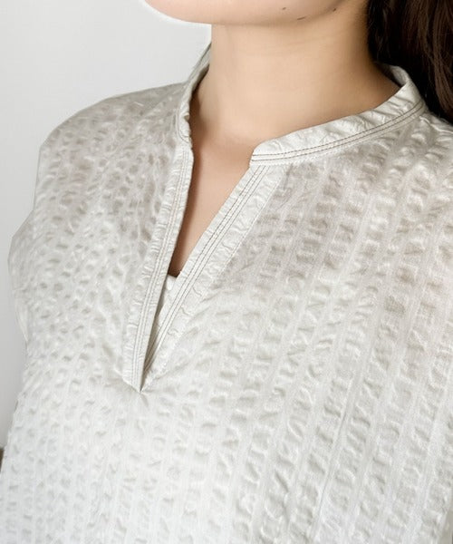 凹凸のあるさらっとした肌触りが特徴のサッカーキーネックトップスが登場。
