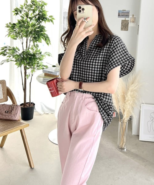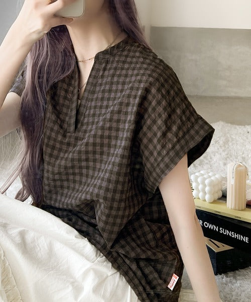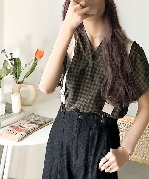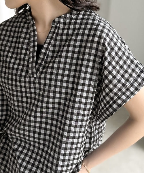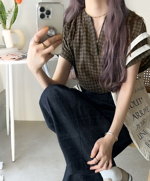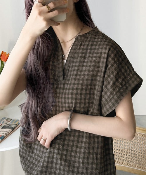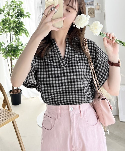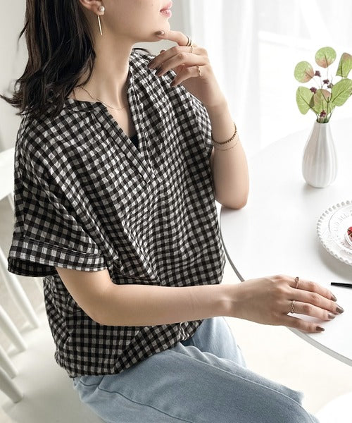 軽やかなサッカー素材にレトロチェックを施したモテ愛されトップス。