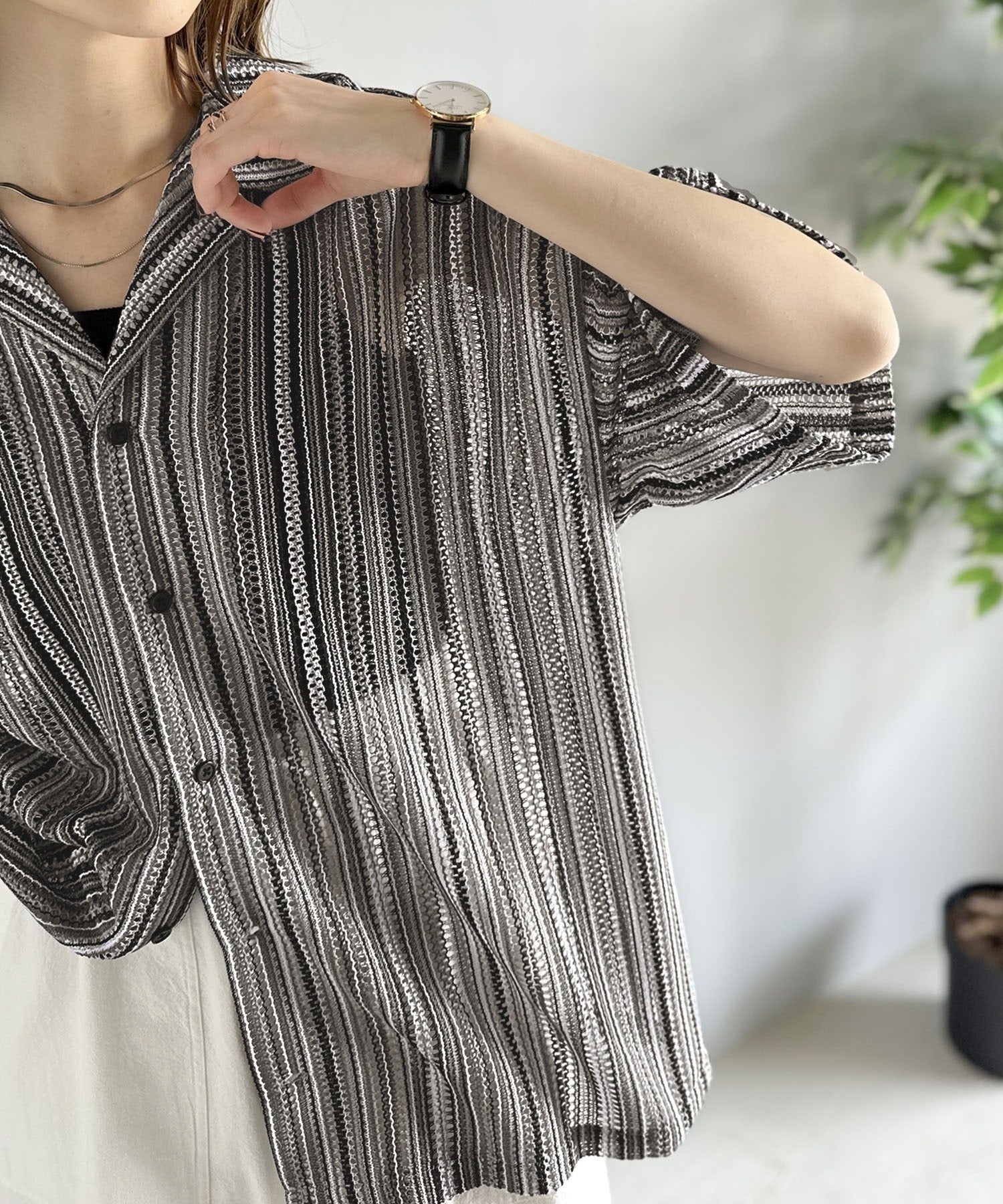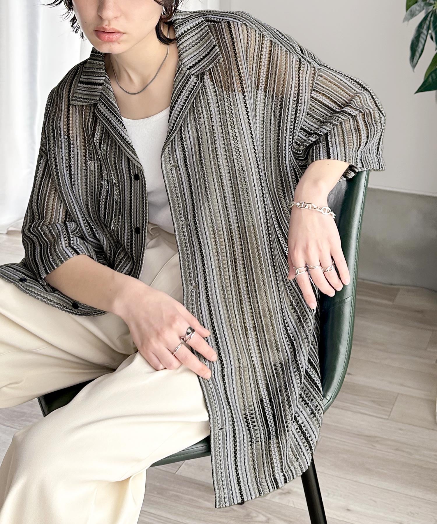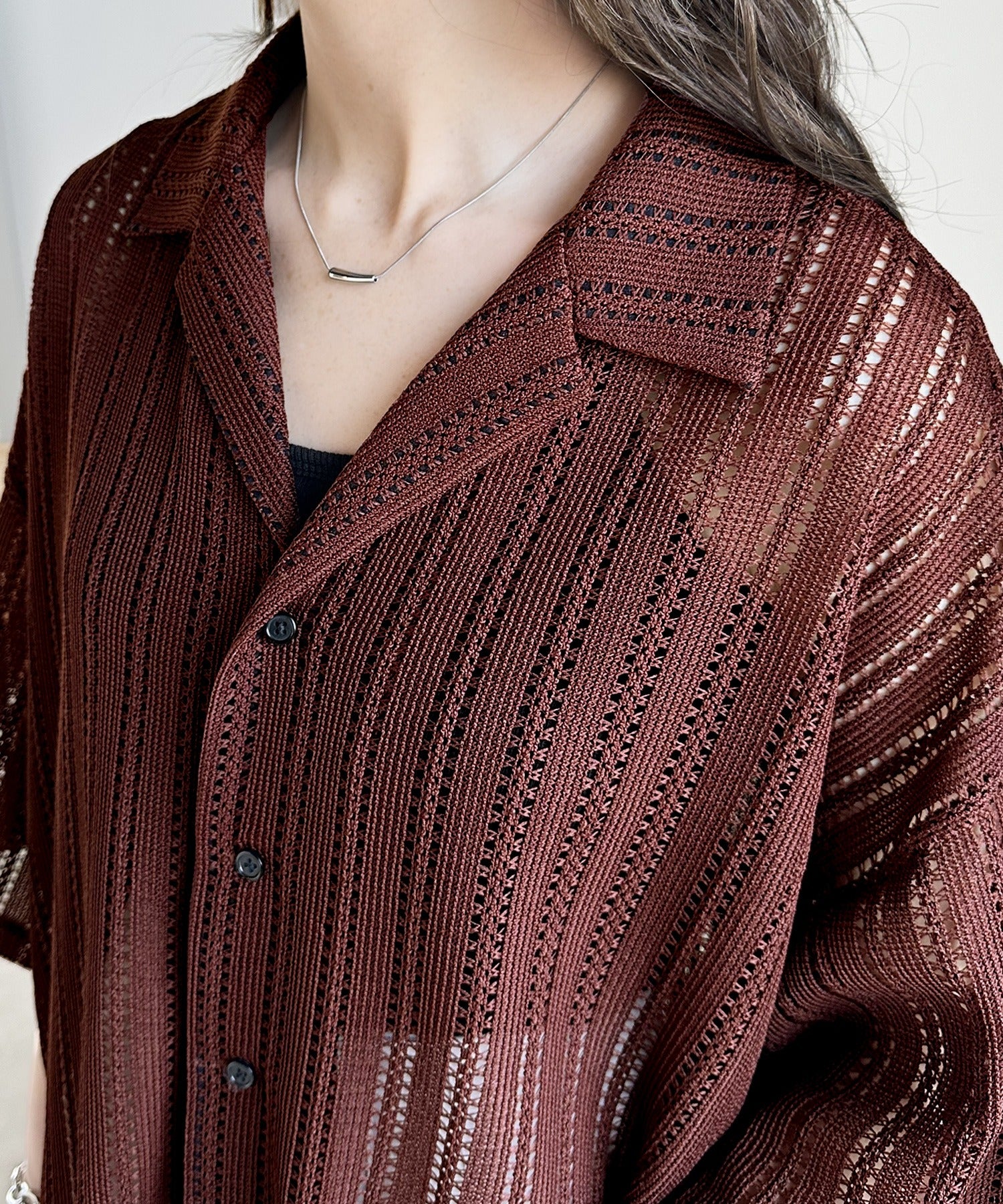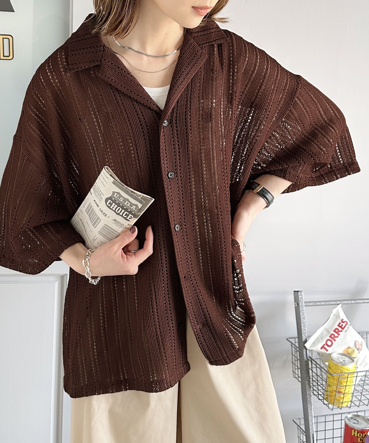 伸縮性に優れたレース素材を使った開襟シャツ。