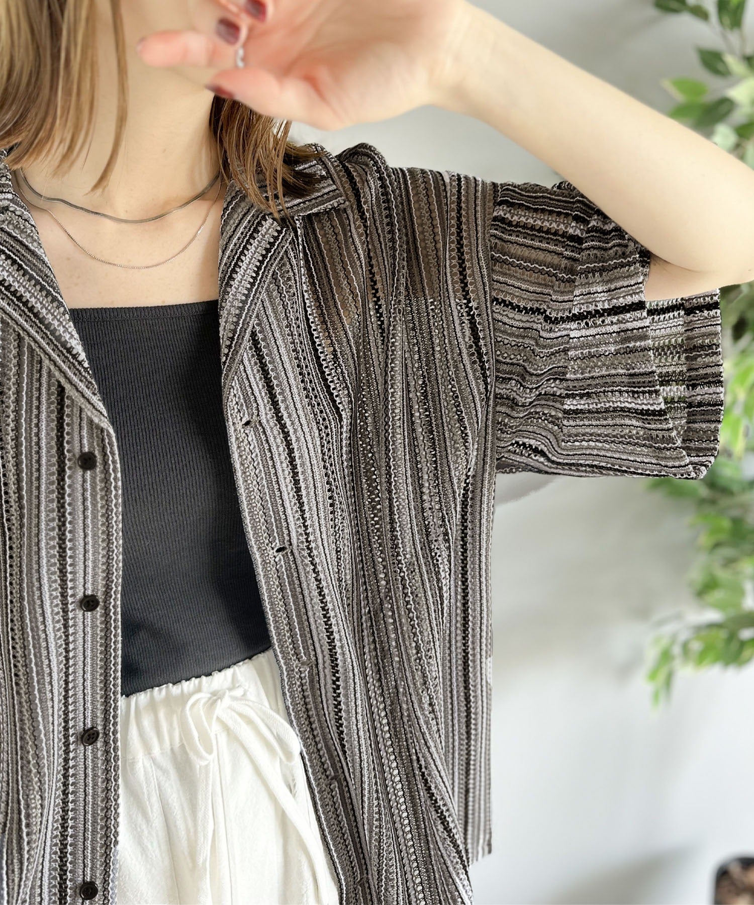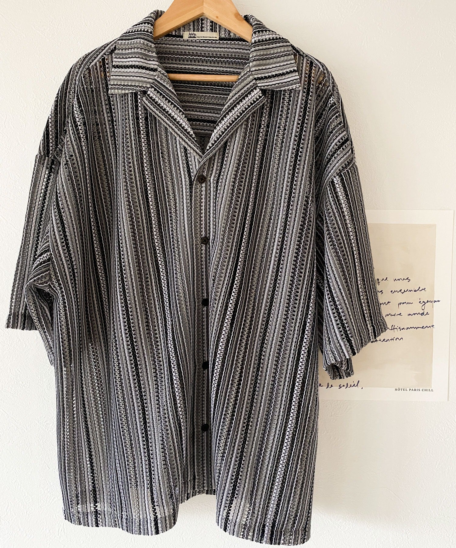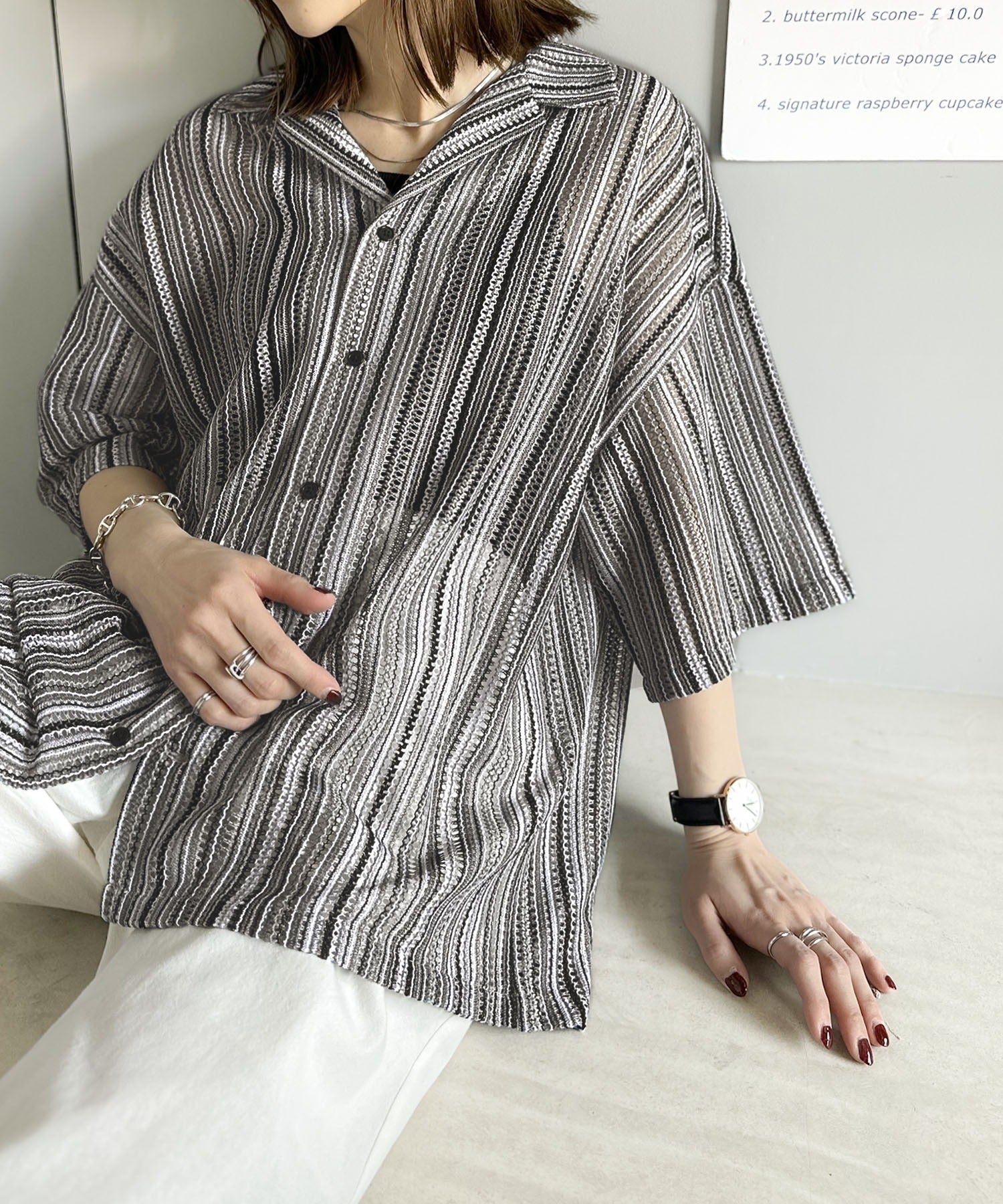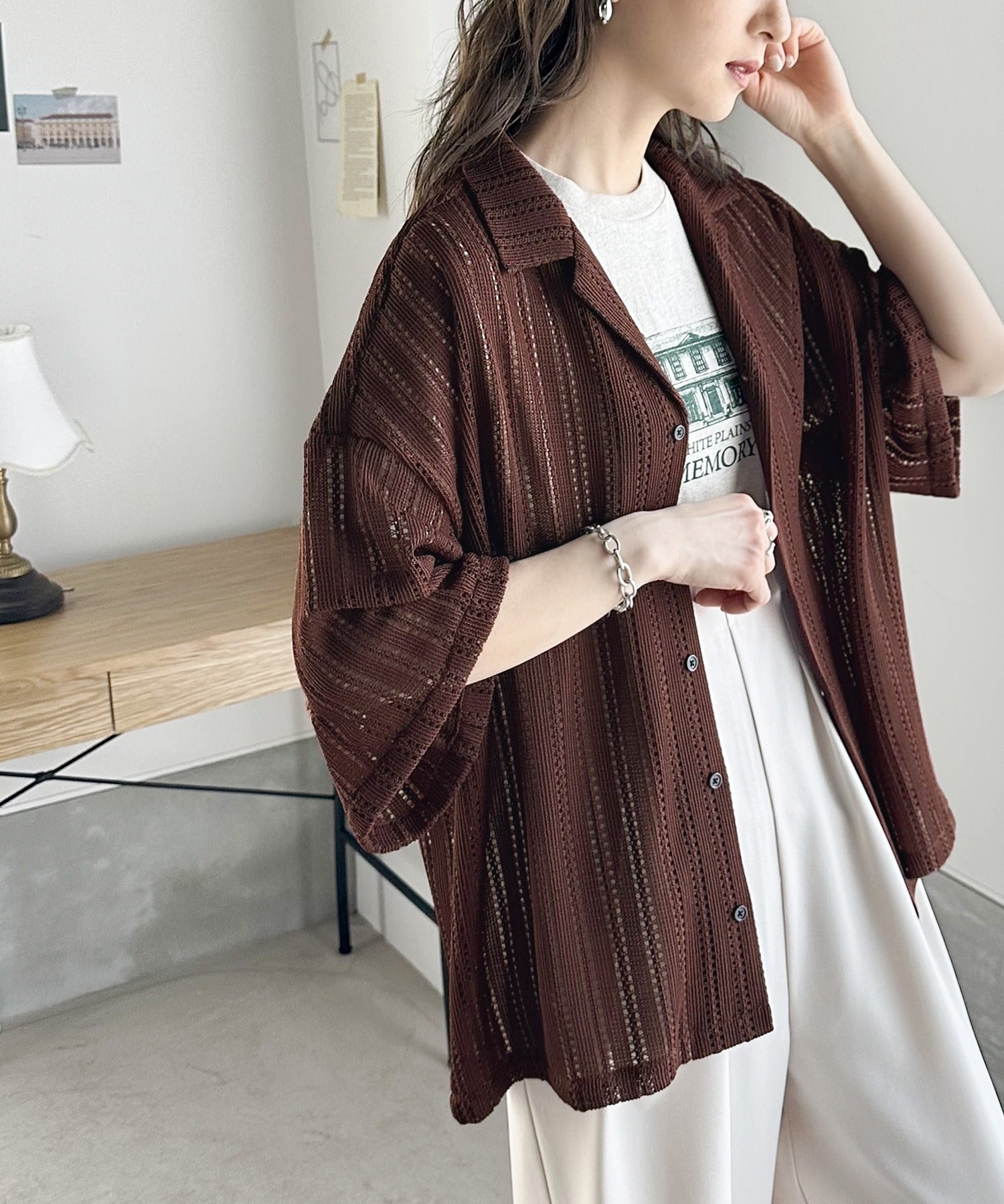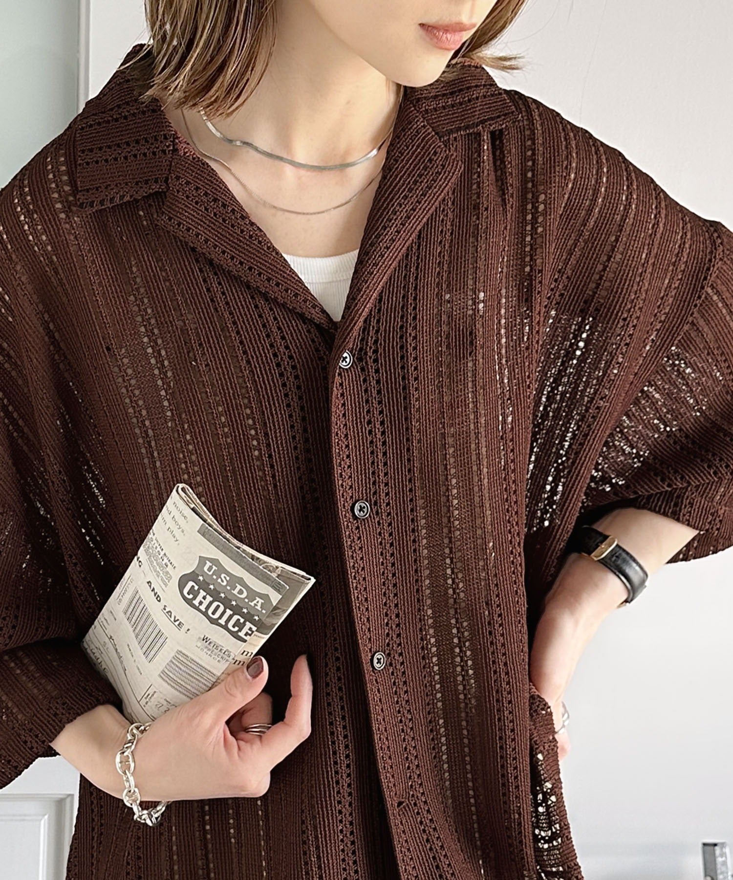 伸縮性に優れたレース素材を使った開襟シャツ。