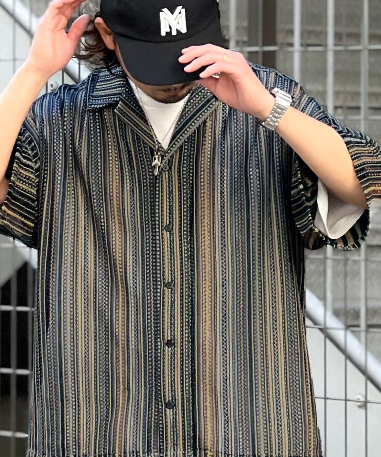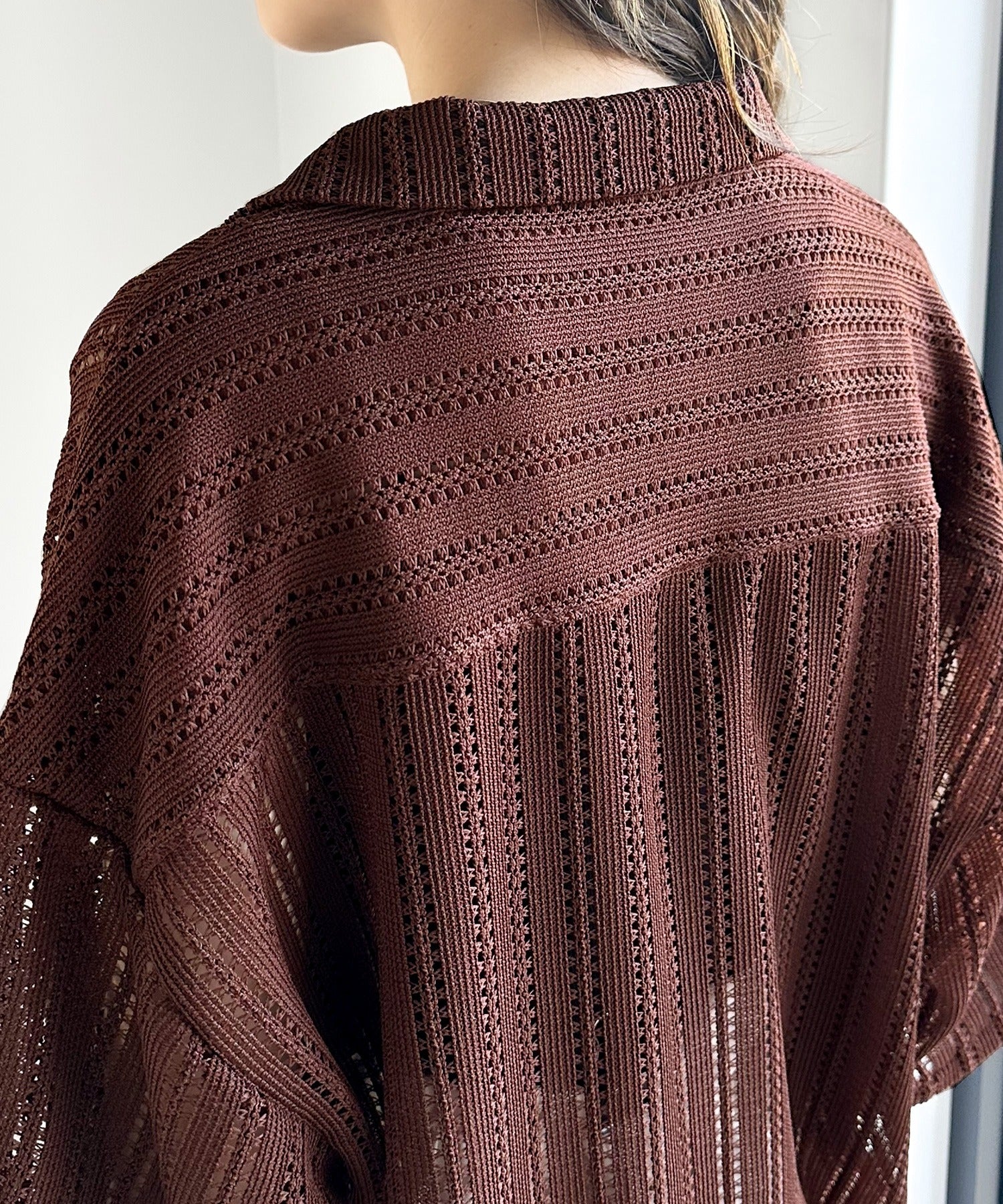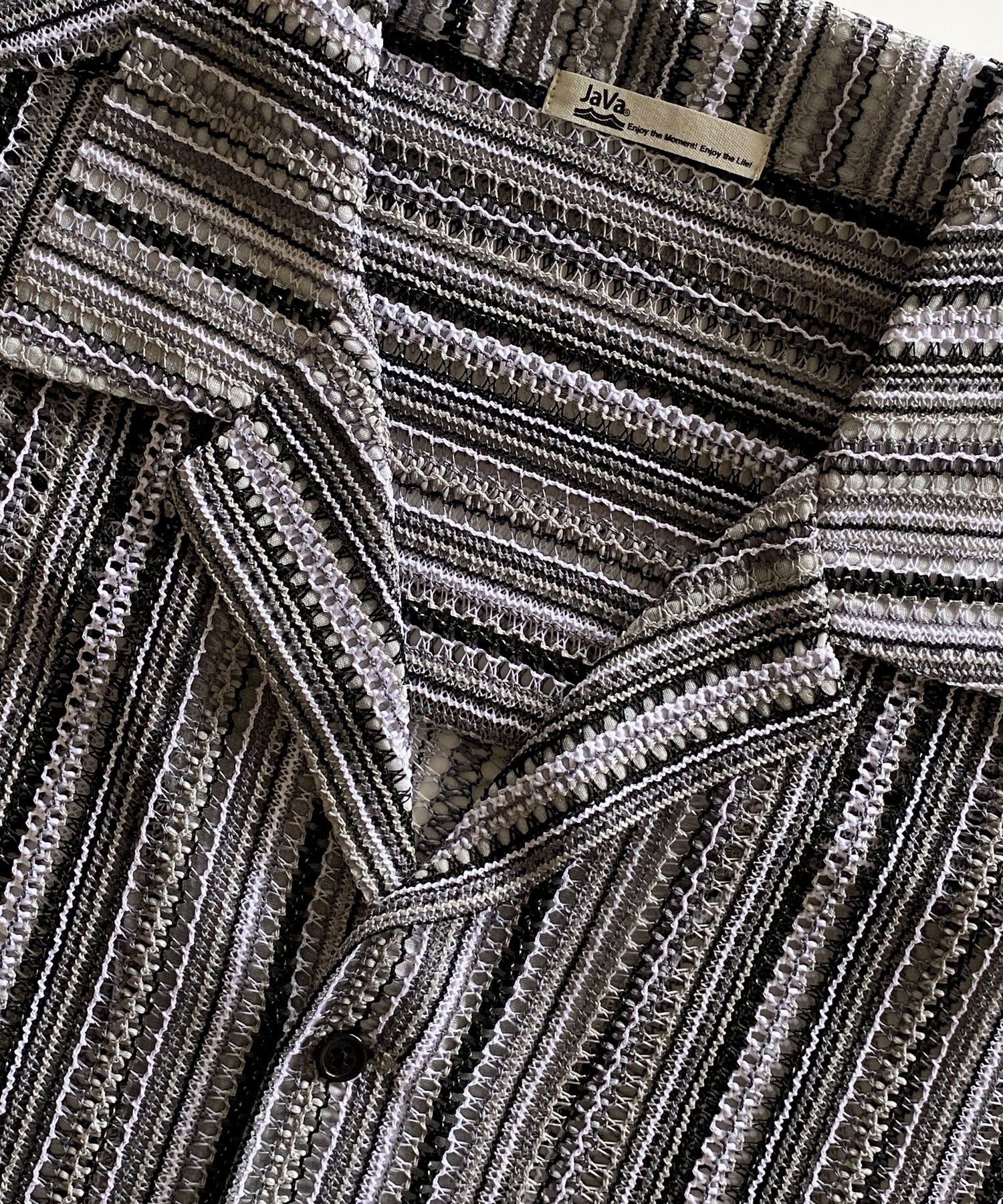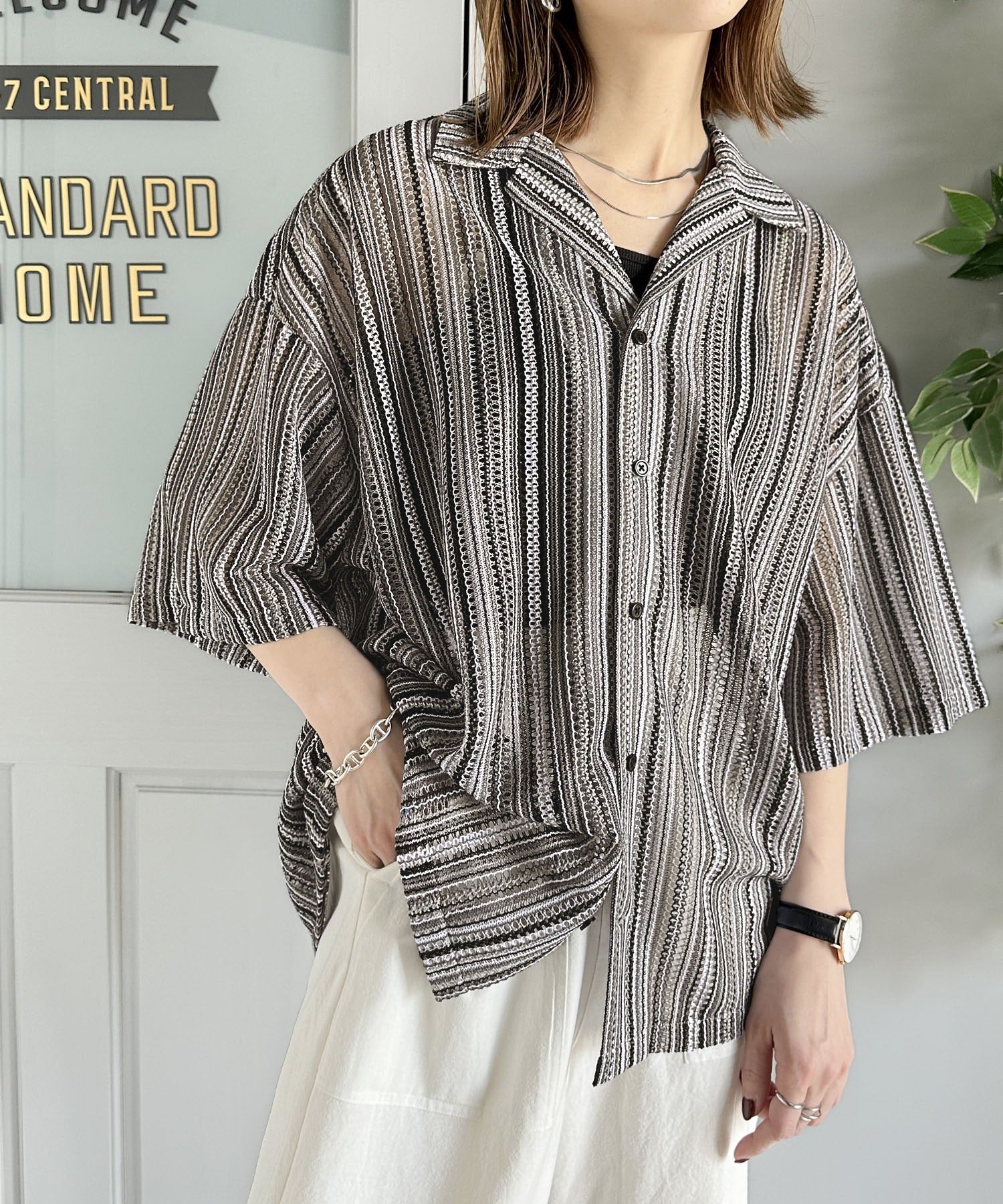 伸縮性に優れたレース素材を使った開襟シャツ。