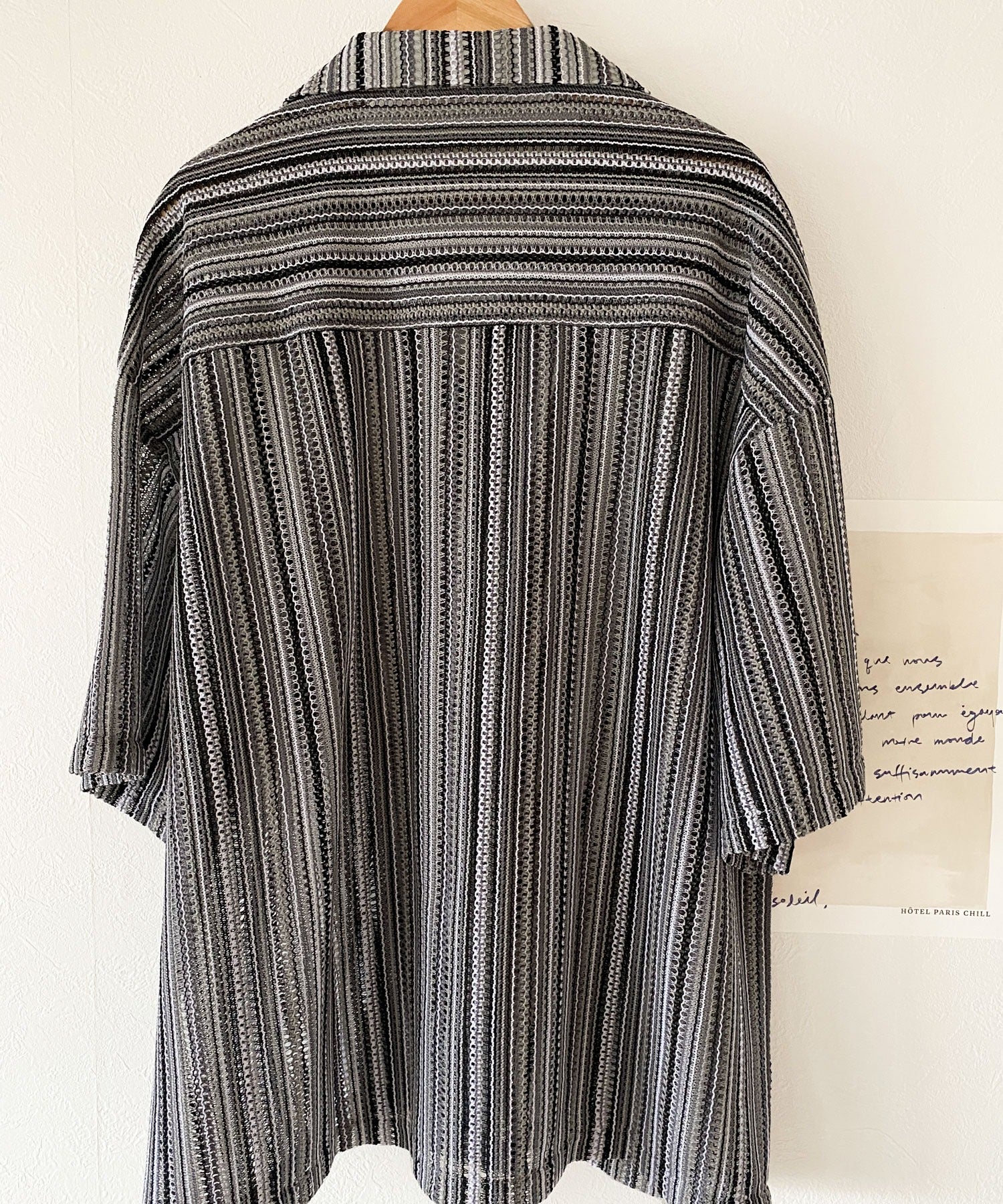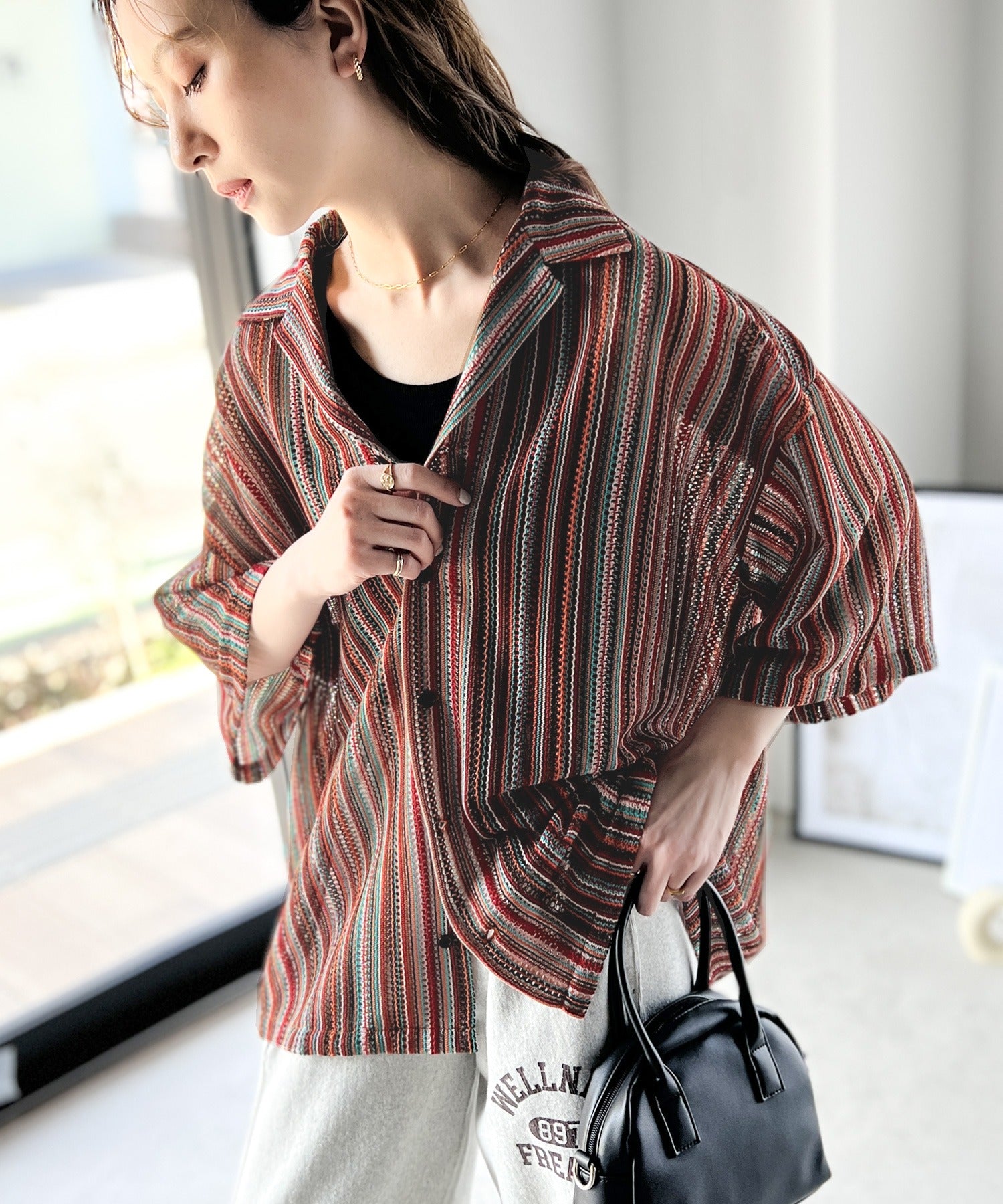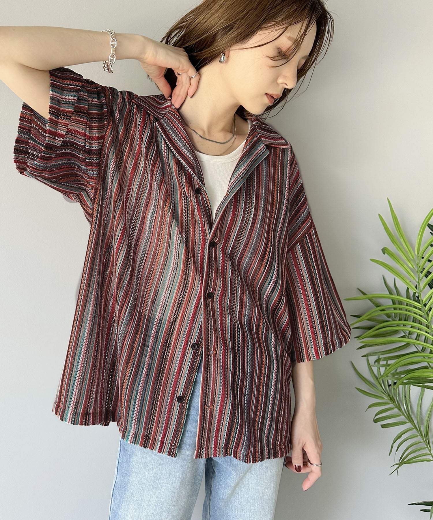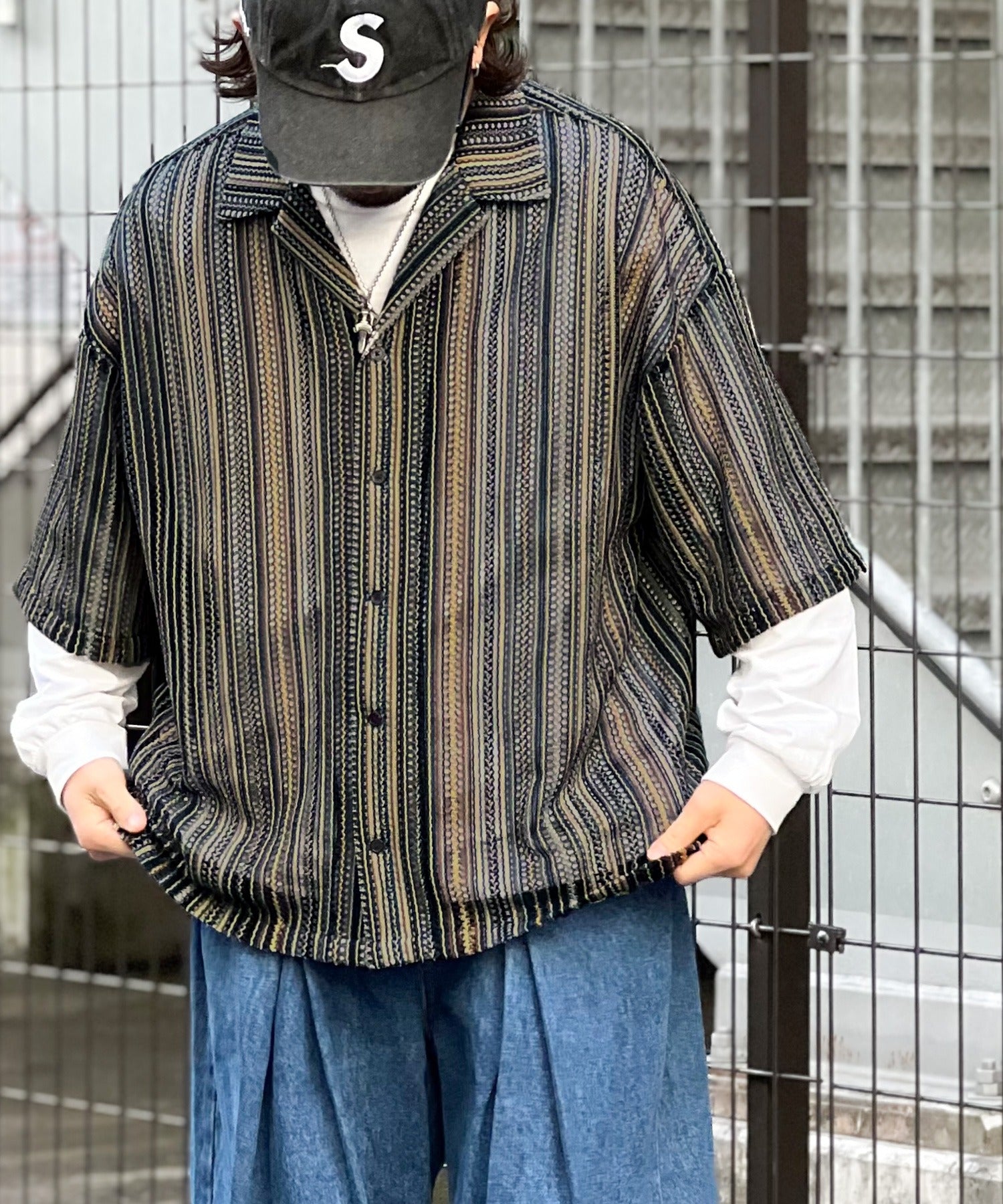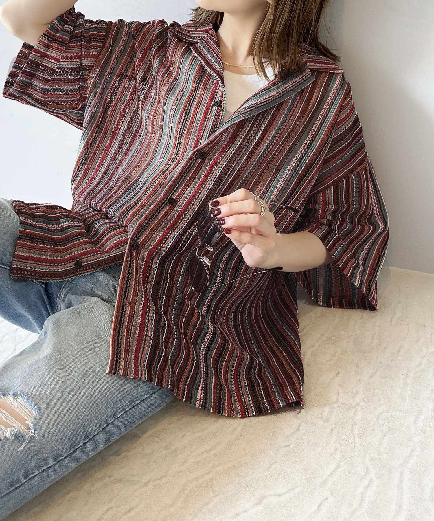 伸縮性に優れたレース素材を使った開襟シャツ。