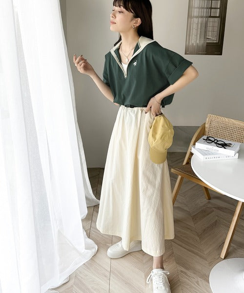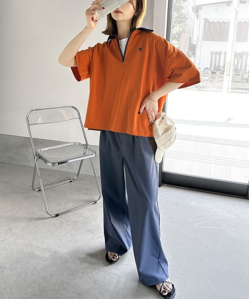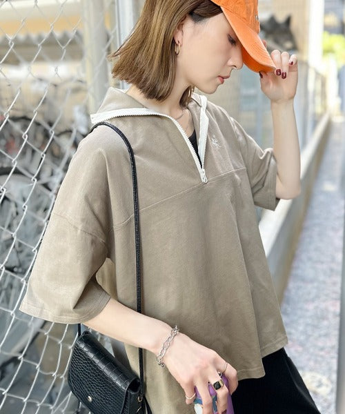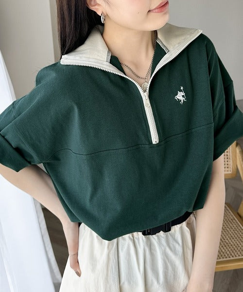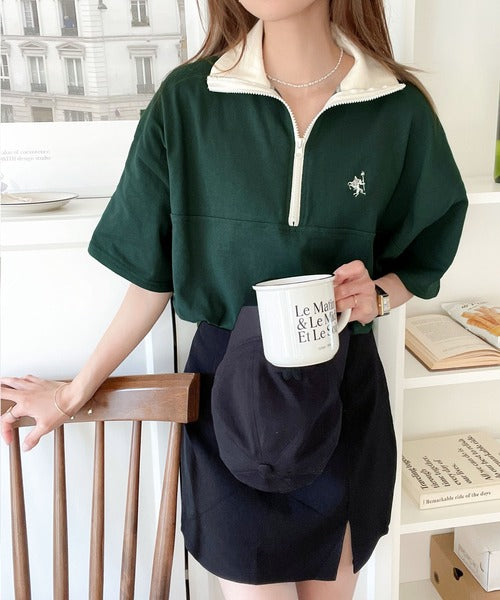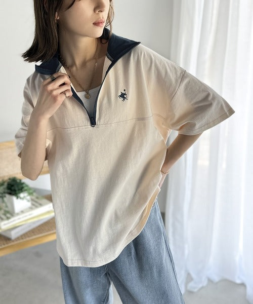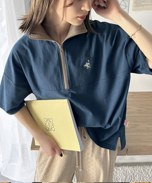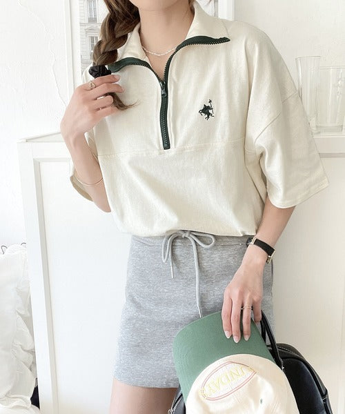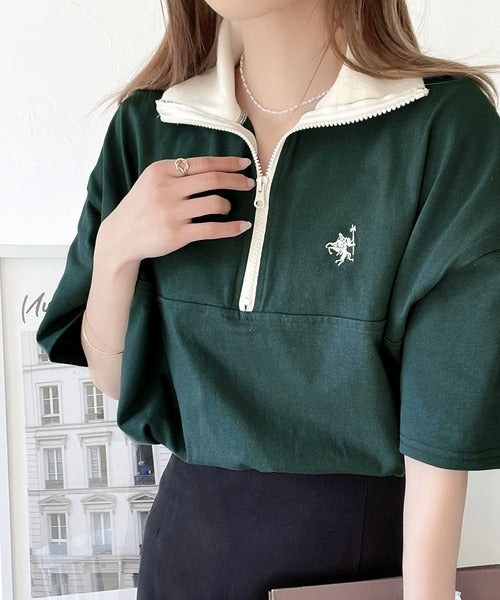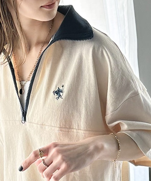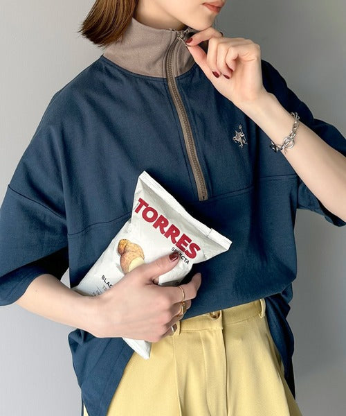 ハーフジップと配色のパイピングが目を惹き、ネックのファスナーの開き具合で表情が変わるのもポイント◎
