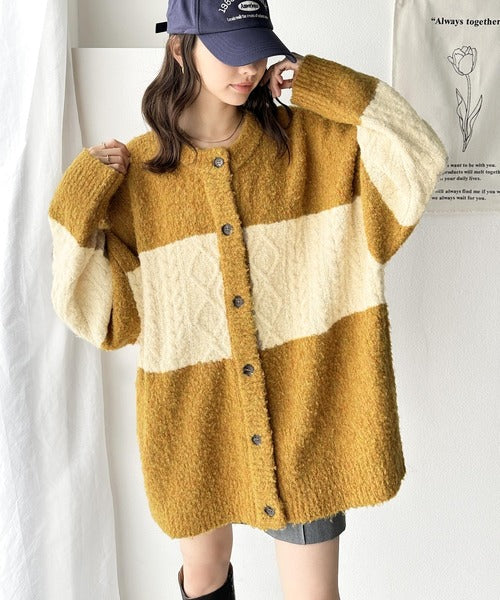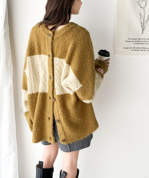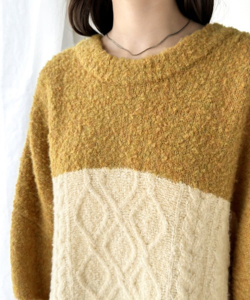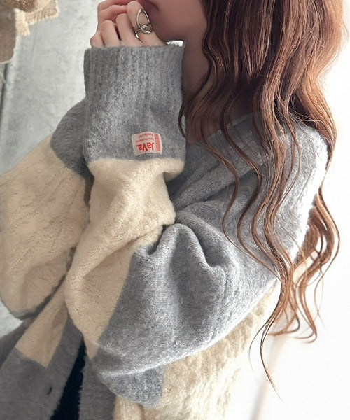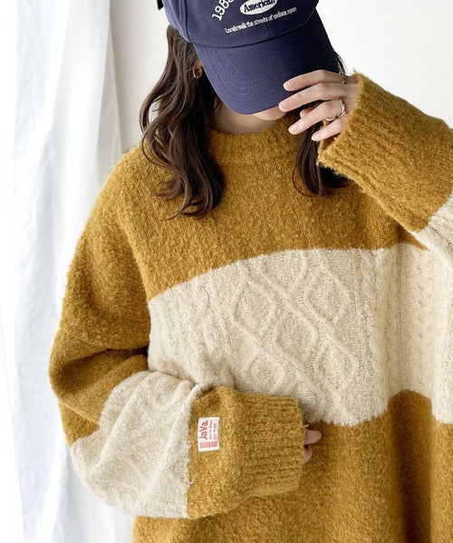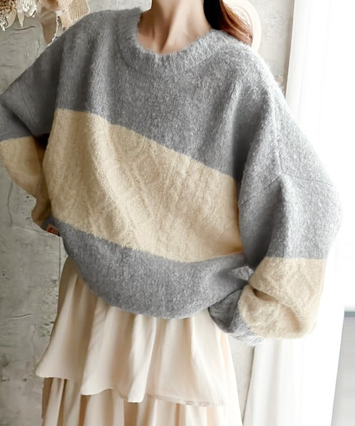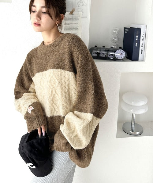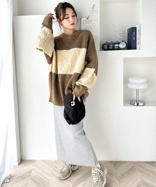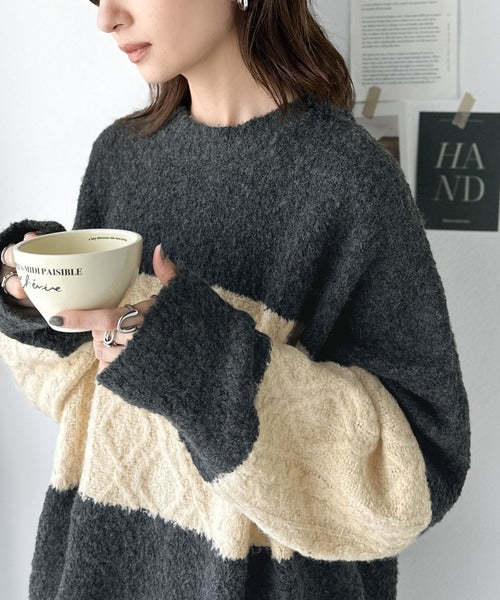 オーバーサイズのゆったりシルエットとケーブル編みの配色が入ったデザインがポイント。