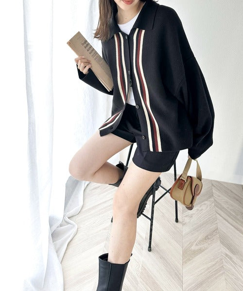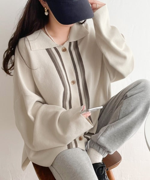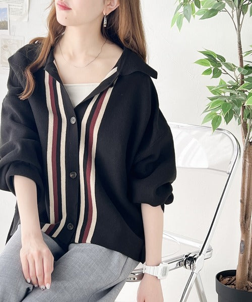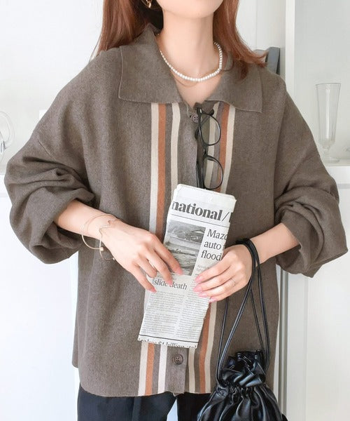 トレンドの襟付きニットはシャツ風にきれい目ボトムスとのコーデも得意。